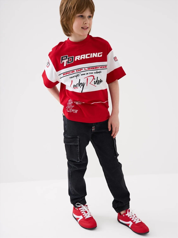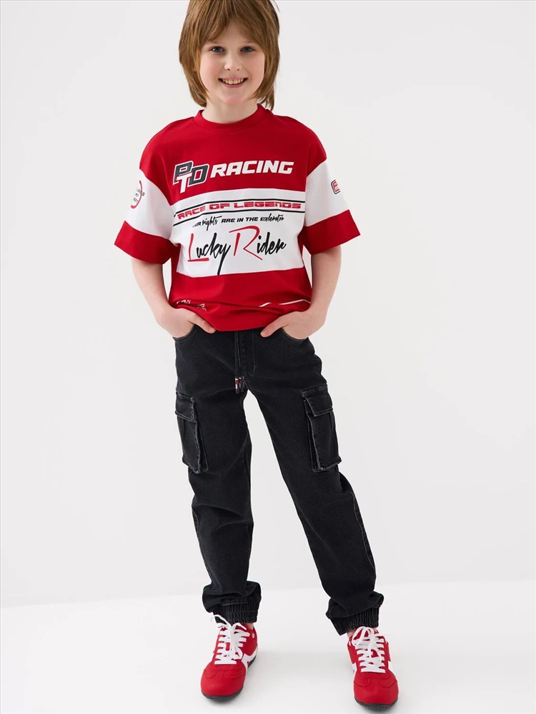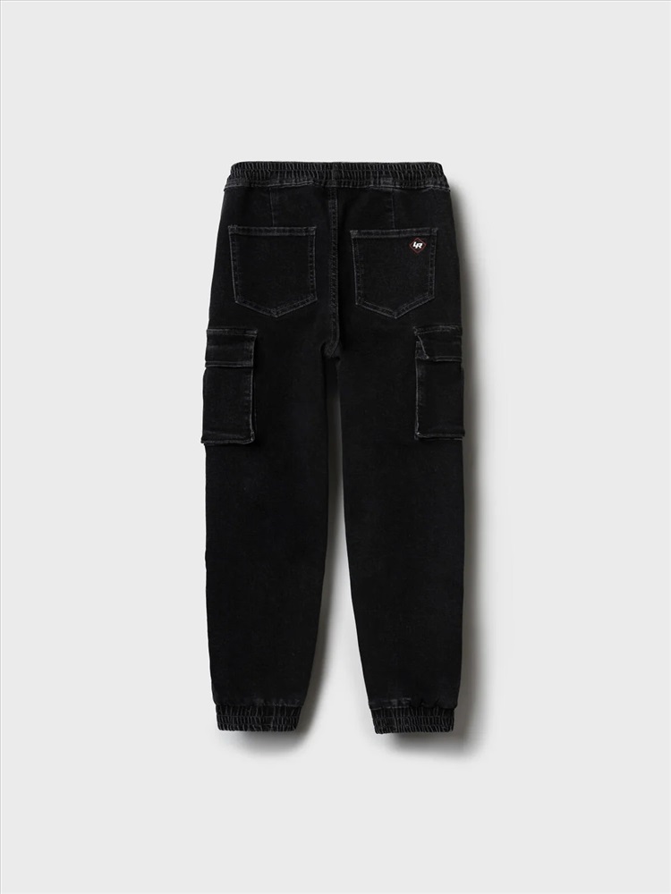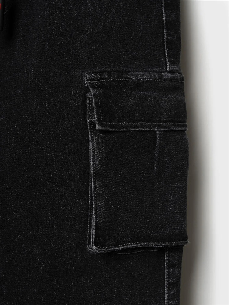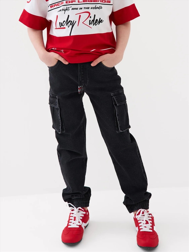 Джинсы-джоггеры для мальчика подростка, выполненные из сверхудобного эластичного материала Loop Denim. Loop denim имеет внешний вид классической джинсы, а по тактильным ощущениям мягкий и комфортный, как трикотаж. Свободный крой с заужением к низу. Пояс на резинке с утягивающим шнурком. Объёмные боковые накладные карманы с клапанами на липучке. Сзади — два накладных кармана. Низ брюк собран на резинку. По брюкам расположены декоративные складки и строчки, имитирующие заломы. На заднем кармане — силиконовая нашивка с логотипом.