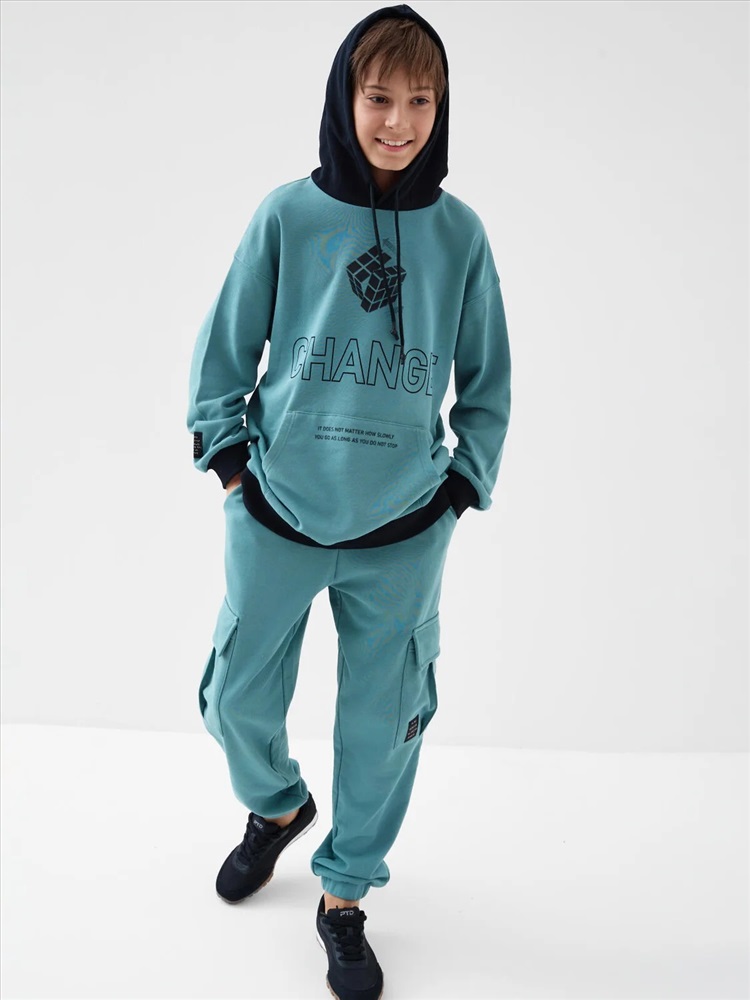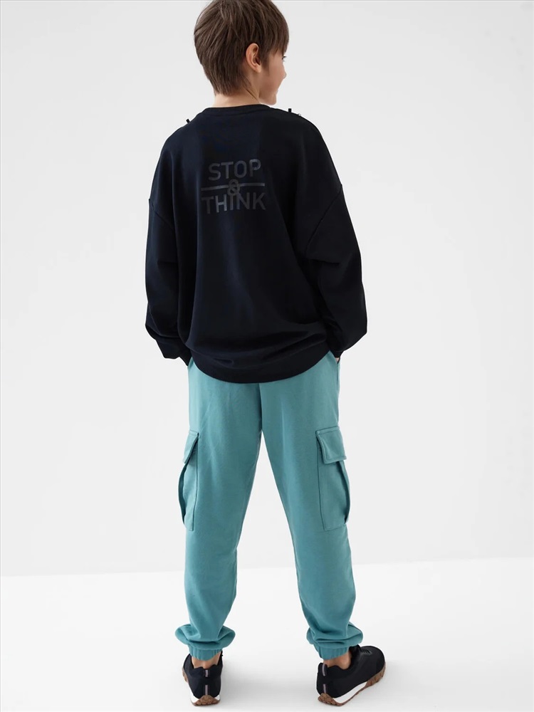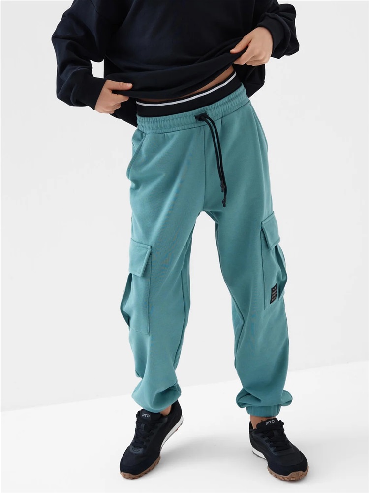 Брюки джоггеры из трикотажа для мальчика подростка. Свободный крой. Пояс на резинке со шнурком позволяет регулировать посадку. Спереди два удобных кармана, а по бокам — большие карманы с клапанами на липучке. Один из карманов украшен стильным шевроном с надписью. Внизу брюки собраны на манжеты, что делает образ более динамичным.