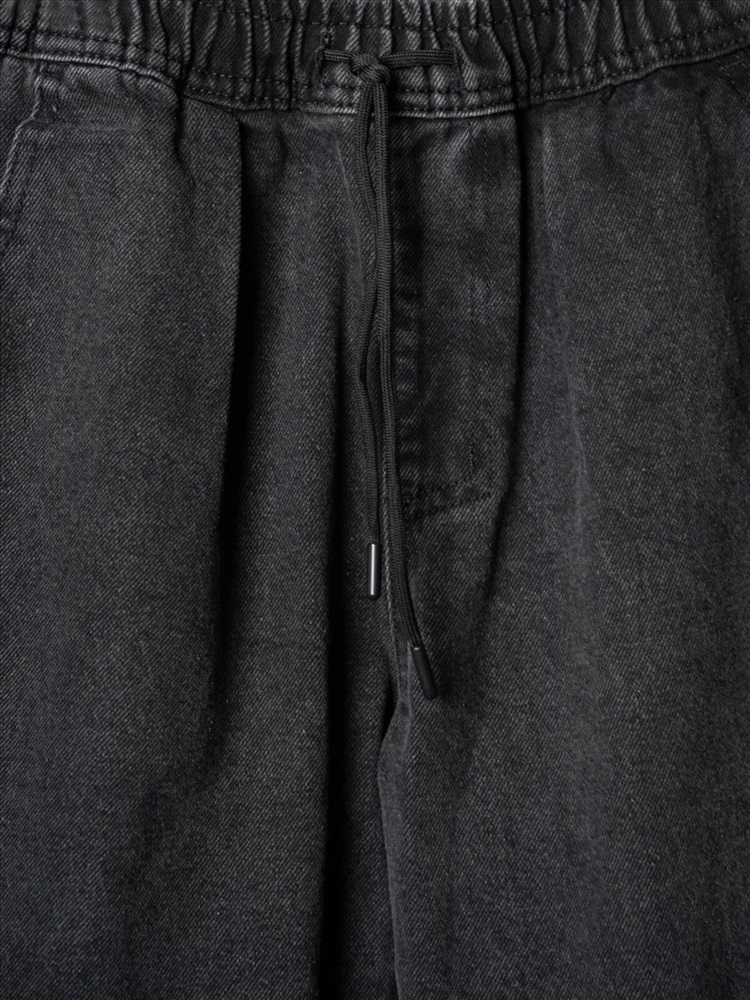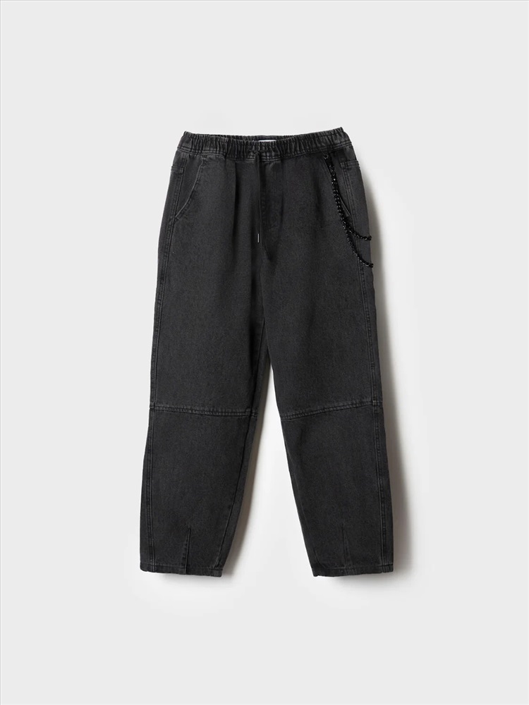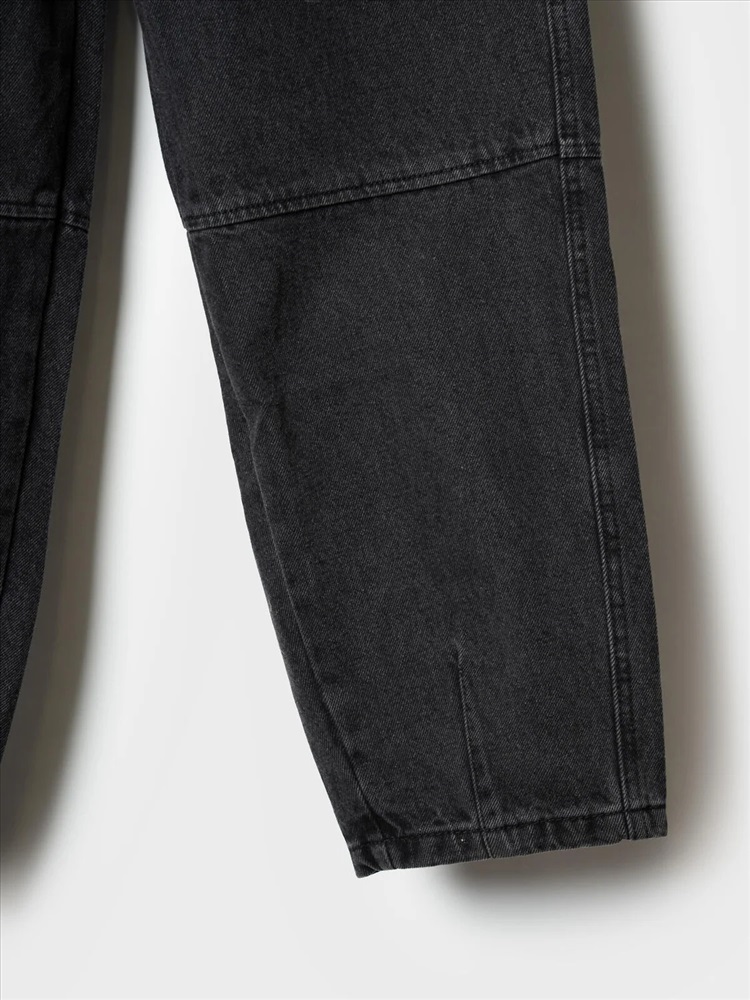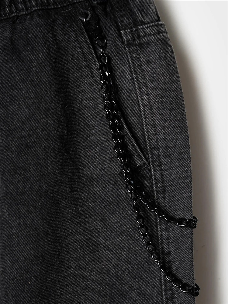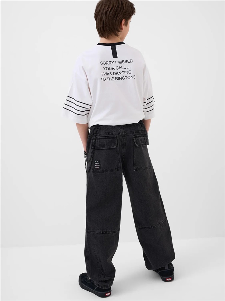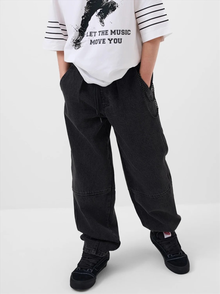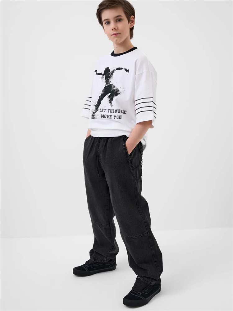 Свободные подростковые джинсы с заниженной посадкой и модным объемным силуэтом balloon для мальчика подростка. Брюки выполнены из плотного денима с характерной текстурой. Пояс на резинке со шнурком позволяет регулировать посадку. Спереди — два удобных кармана, сзади — два кармана с клапанами на липучке. Спереди закреплен декоративный металлический карабин с ключами, создающий акцент в уличном стиле. На одном из задних карманов — чёрная нашивка с бело-красным шрифтовым текстом, а на задней части левой штанины — вертикальный принт с мотивационной надписью на английском языке.