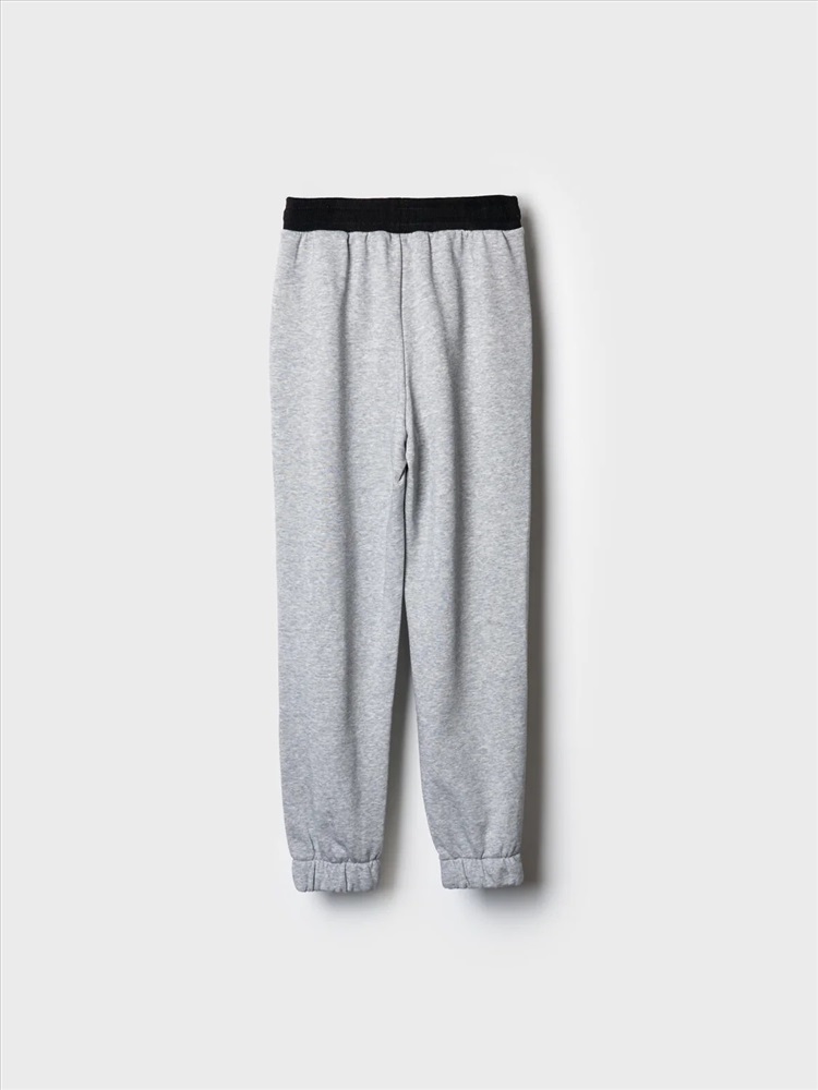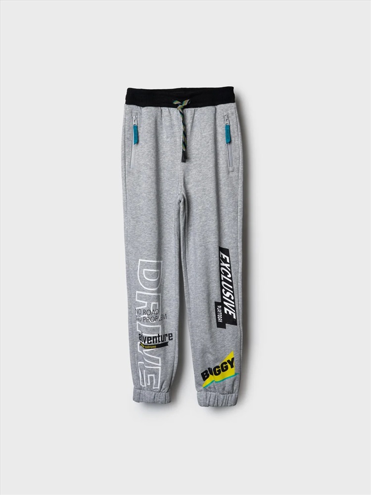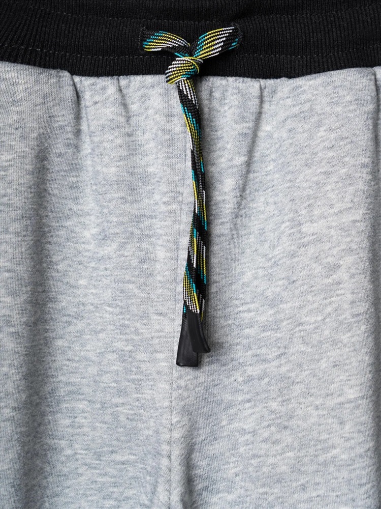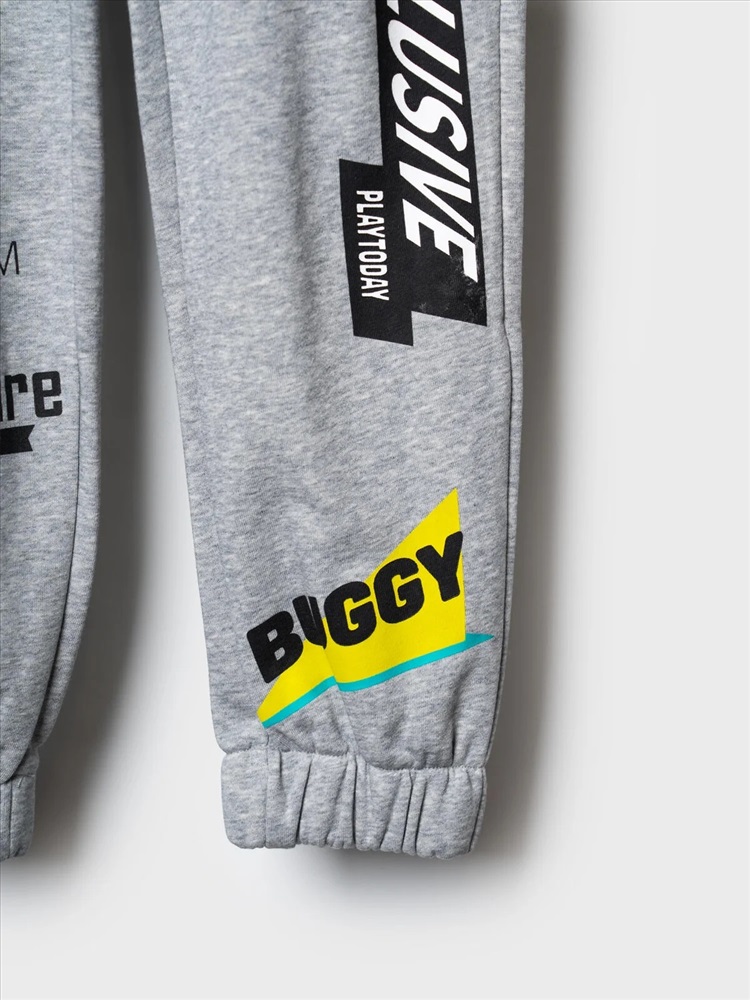 Брюки-джоггеры для мальчика подростка. Модель из хлопкового футера без начеса, средней посадки, со слегка зауженными штанинами и эластичными манжетами внизу. Пояс на резинке, дополнен декоративным шнуром. По бокам расположены два кармана на молниях. Основной цвет — светло-серый с эффектом меланжа. Дизайн украшен крупными надписями и графикой в чёрно-белой гамме с яркими акцентами.