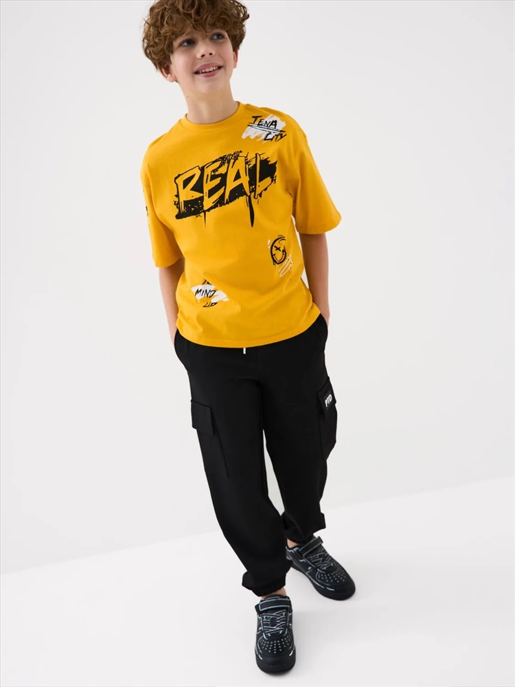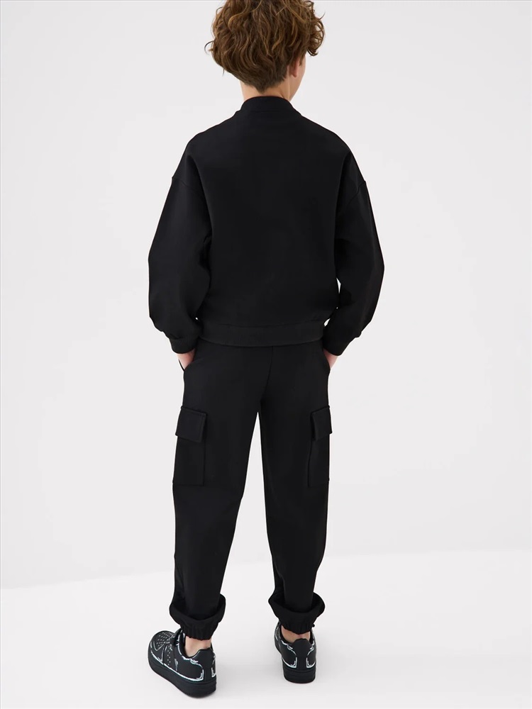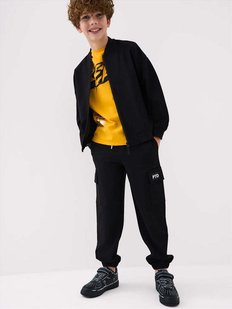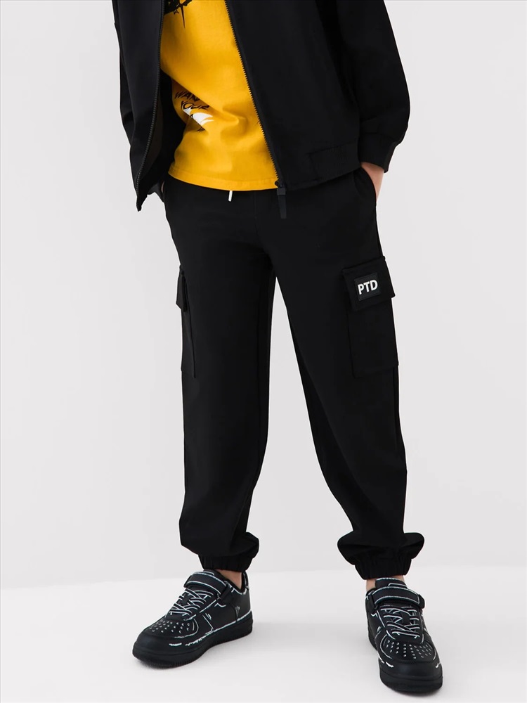 Брюки джоггеры для мальчика подростка. Модель из плотного трикотажа рома джерси. Свободный крой, зауженный к низу и средняя посадка. Пояс на резинке со шнурком для удобной посадки. По бокам расположены два кармана и объемные накладные карманы-карго.