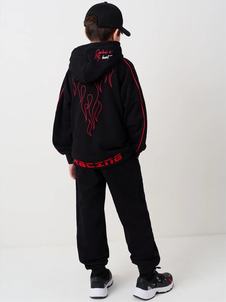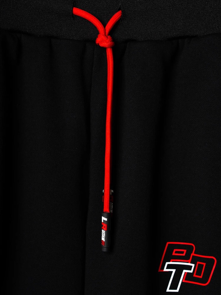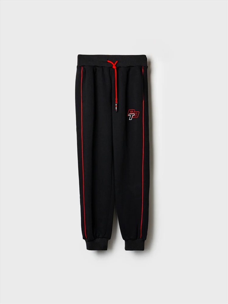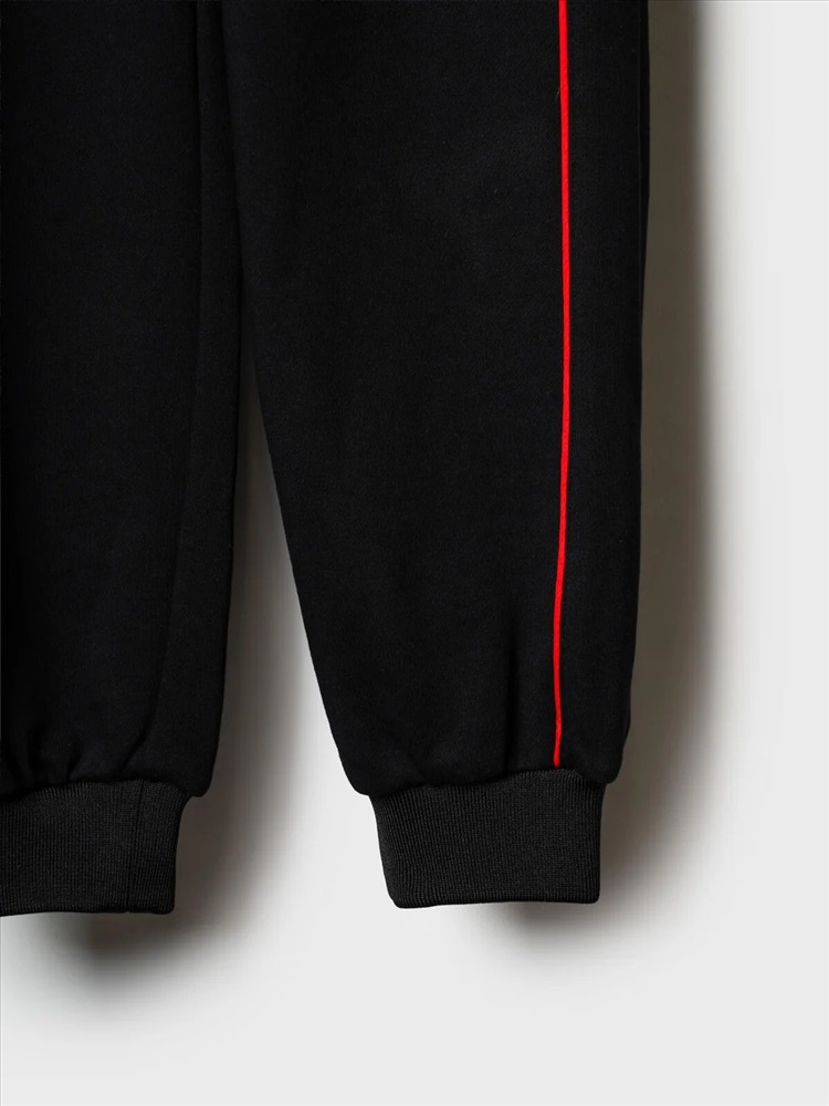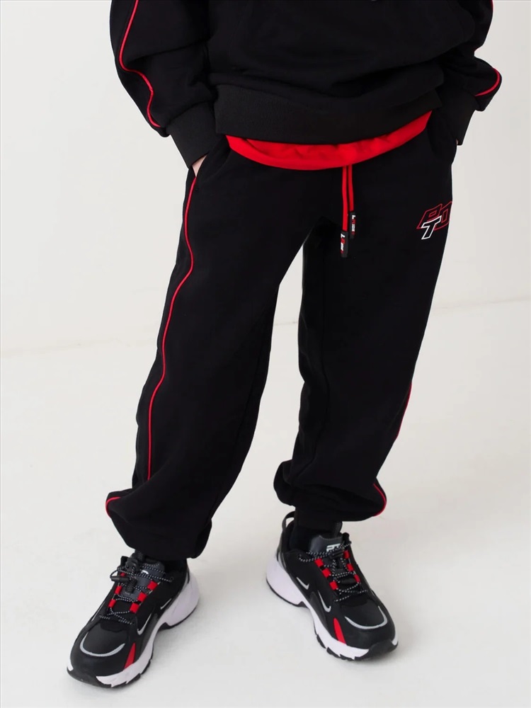 Брюки-джоггеры для мальчика подростка. Выполнены из хлопкового трикотажа футер без начеса. Модель свободного кроя со средней посадкой на талии. Пояс выполнен на резинке, дополнительно регулируется шнурком. По бокам — удобные карманы. В нижней части брючин предусмотрены манжеты на резинке для лучшей фиксации. Брюки украшены лампасами и нашивкой.