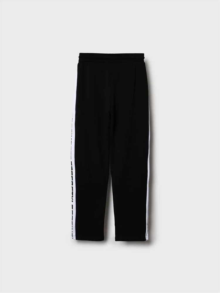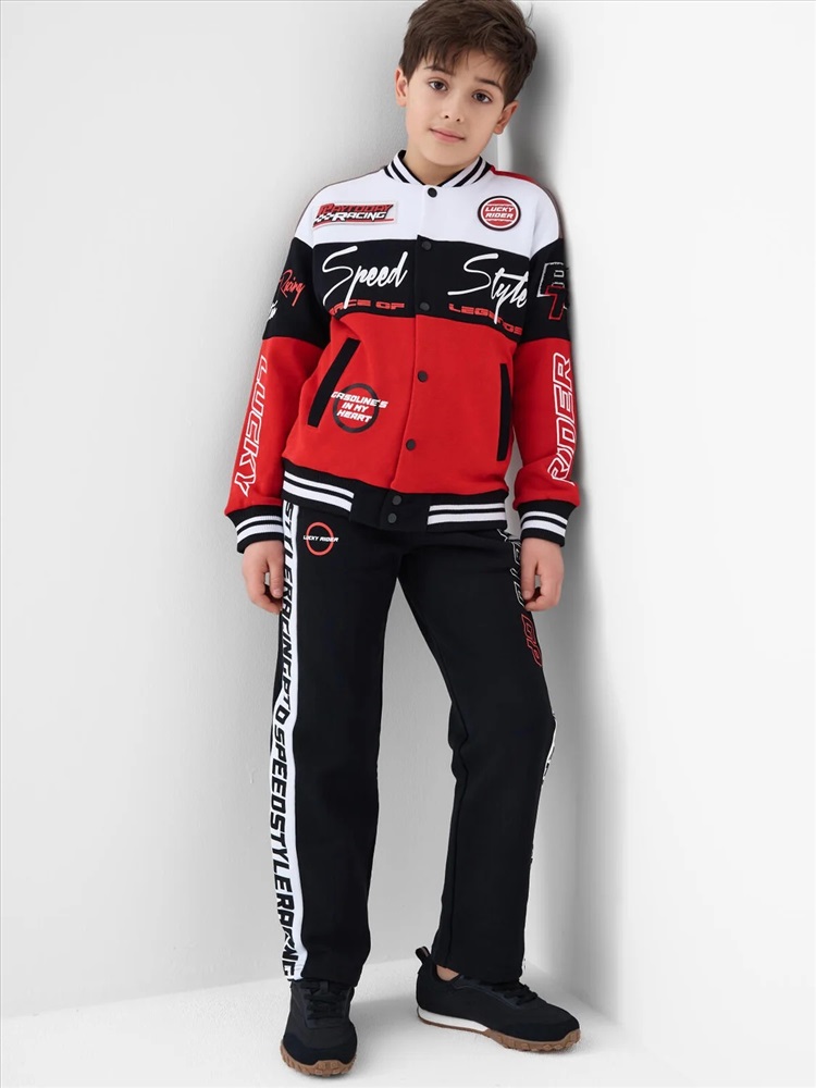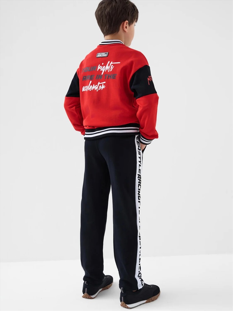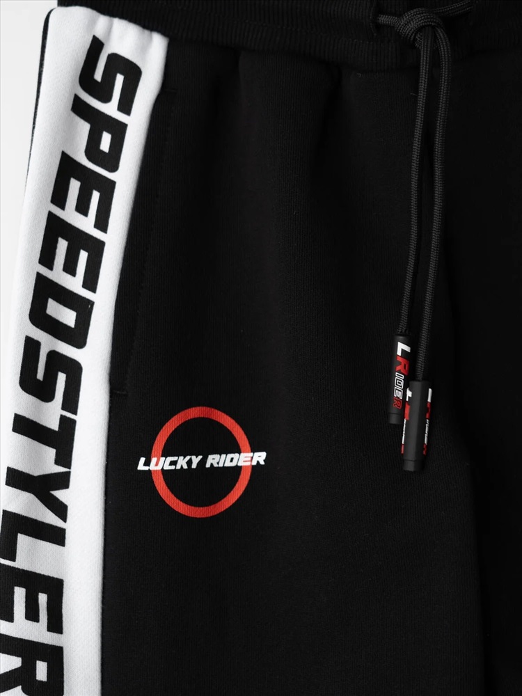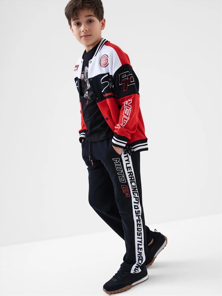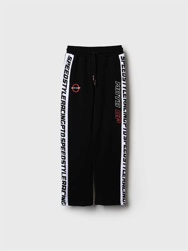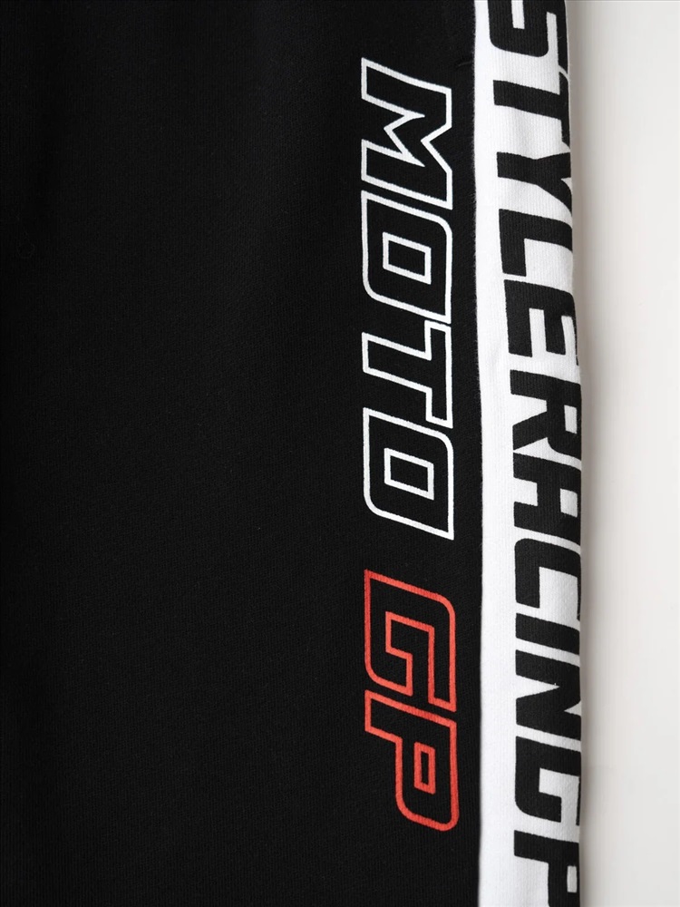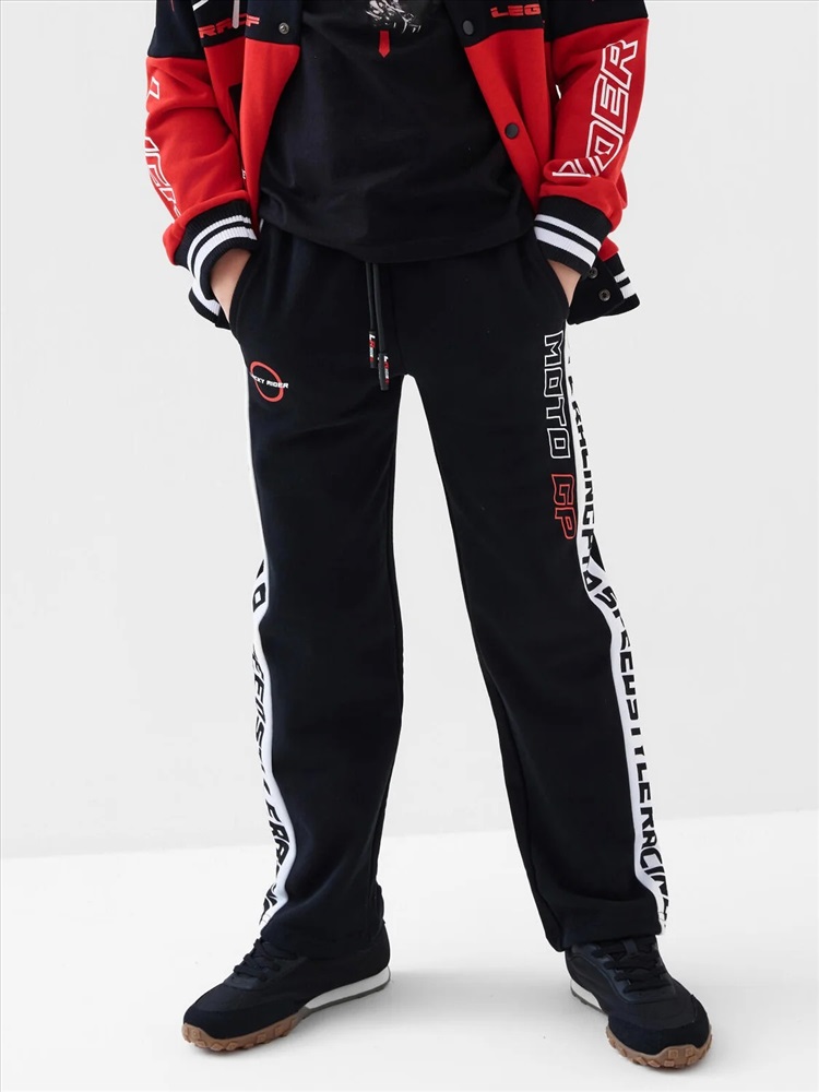Широкие брюки для мальчика подростка. Модель из хлопкового трикотажа футер без начеса. Пояс на резинке дополнен внешним шнуром для регулировки объёма. Брюки оформлены в контрастной чёрно-белой гамме с лампасами и принтами в гоночной тематике. Удобные боковые карманы.