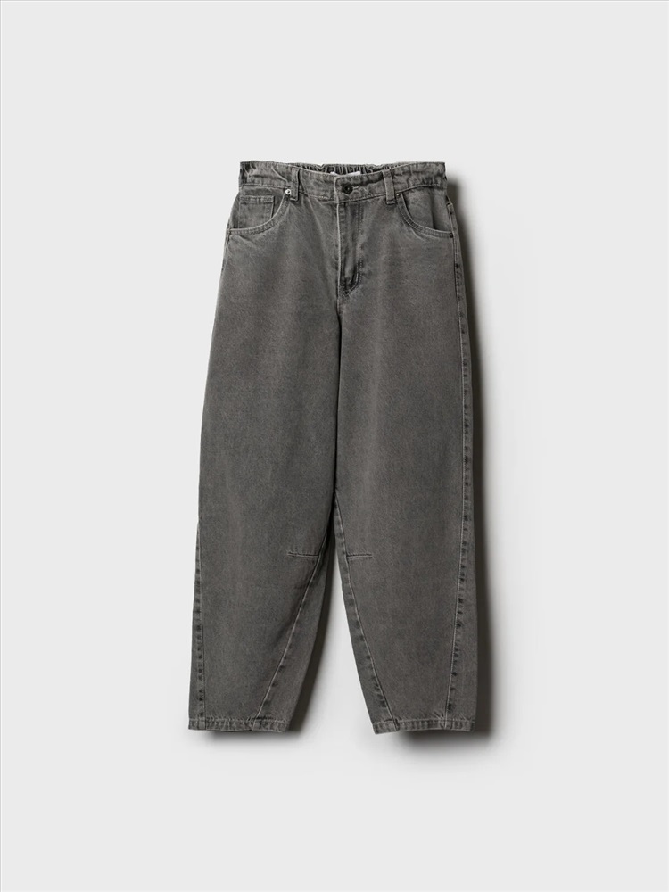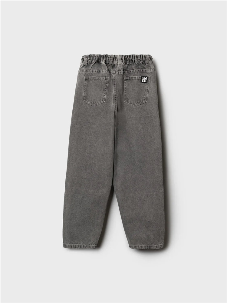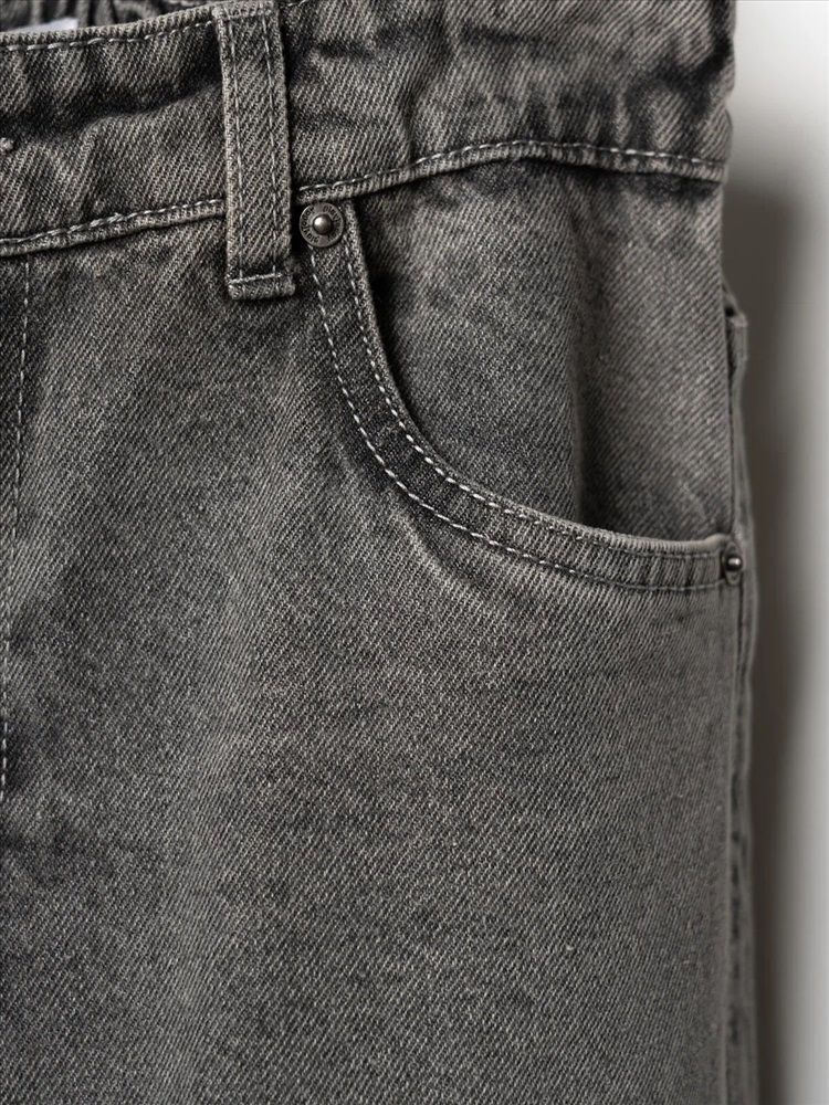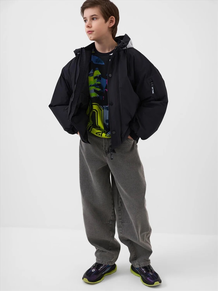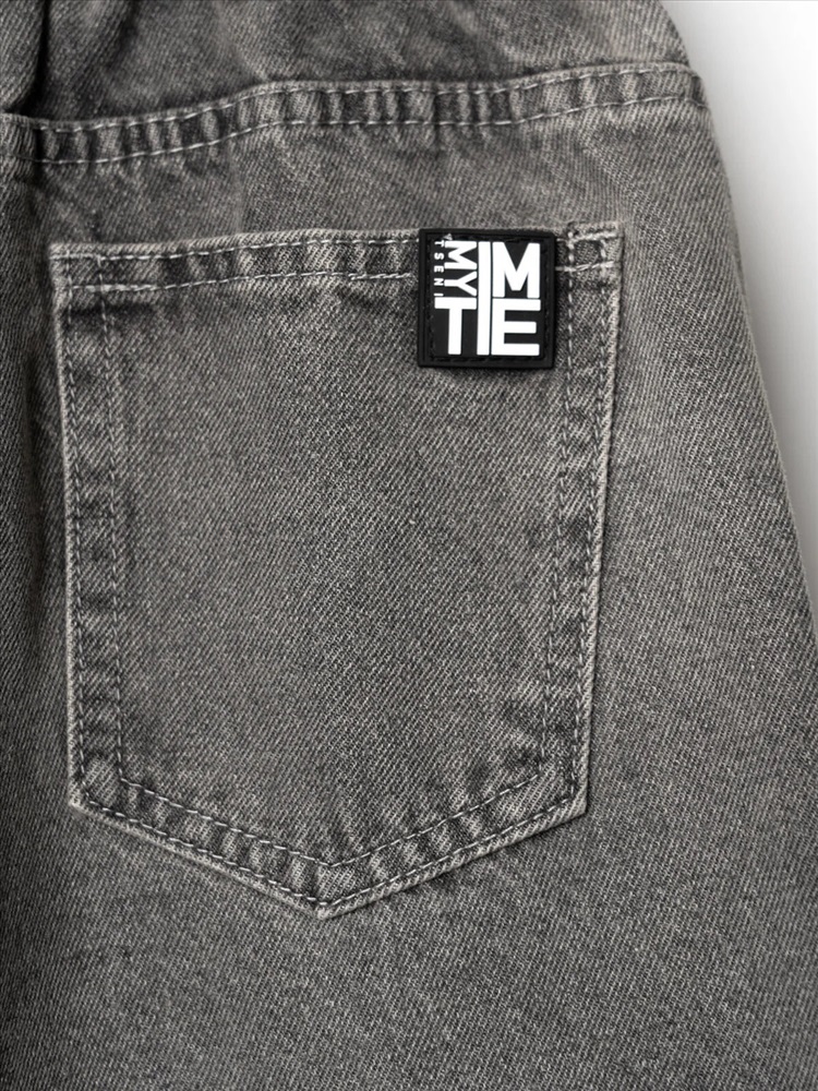 Джинсы для мальчика подростка. Модель прямого силуэта, свободной посадки со слегка укороченной длиной. Сзади пояс собран на резинку, что обеспечивает комфортную посадку. Джинсы выполнены из плотного светло-серого денима. Спереди расположены два классических кармана, сзади – два накладных кармана. Застежка на молнии и кнопку. На заднем кармане — декоративная нашивка с логотипом.