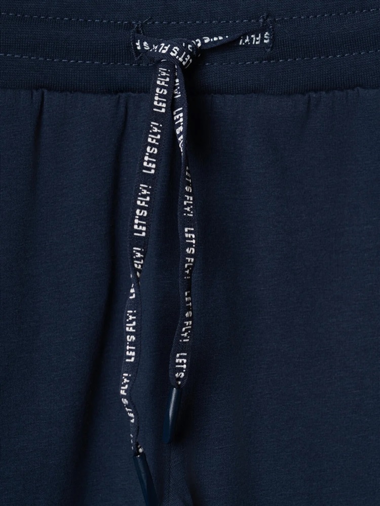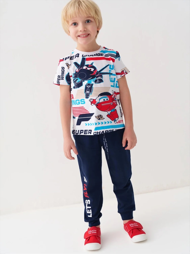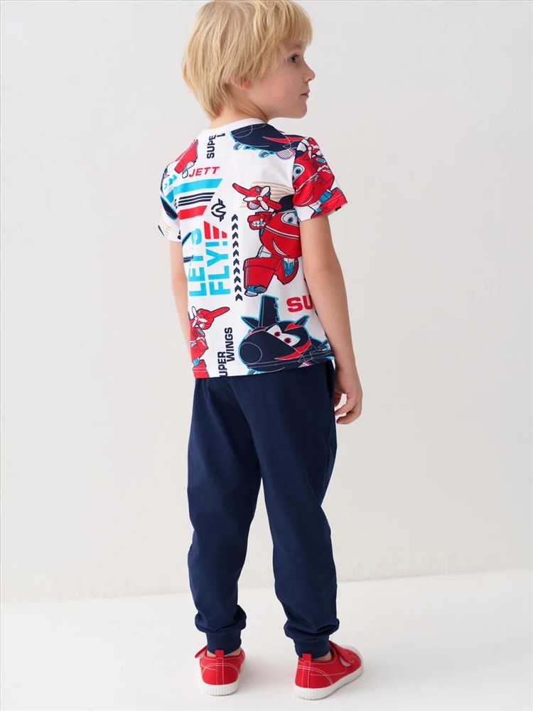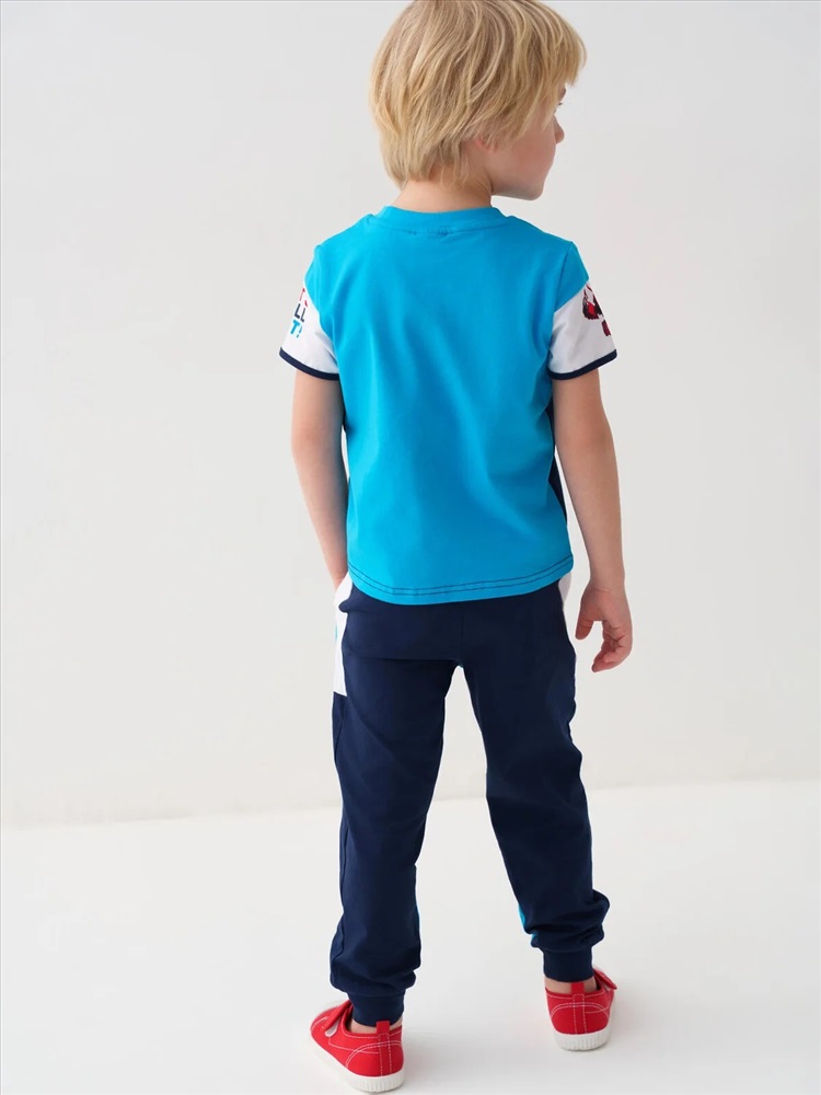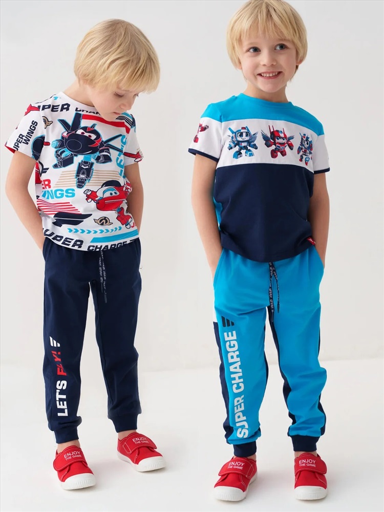 Комплект детских брюк-джоггеров для мальчика. Набор из двух джоггеров выполнен из хлопкового трикотажа джерси. Модель прямого кроя со средней посадкой на талии. Пояс выполнен на резинке, дополнительно регулируется шнурком. По бокам — удобные карманы. В нижней части брючин предусмотрены эластичные трикотажные манжеты для лучшей фиксации. Украшены принтами.