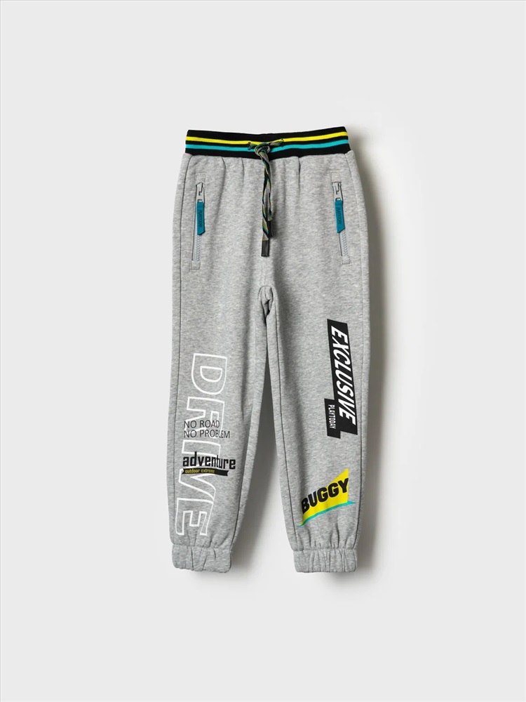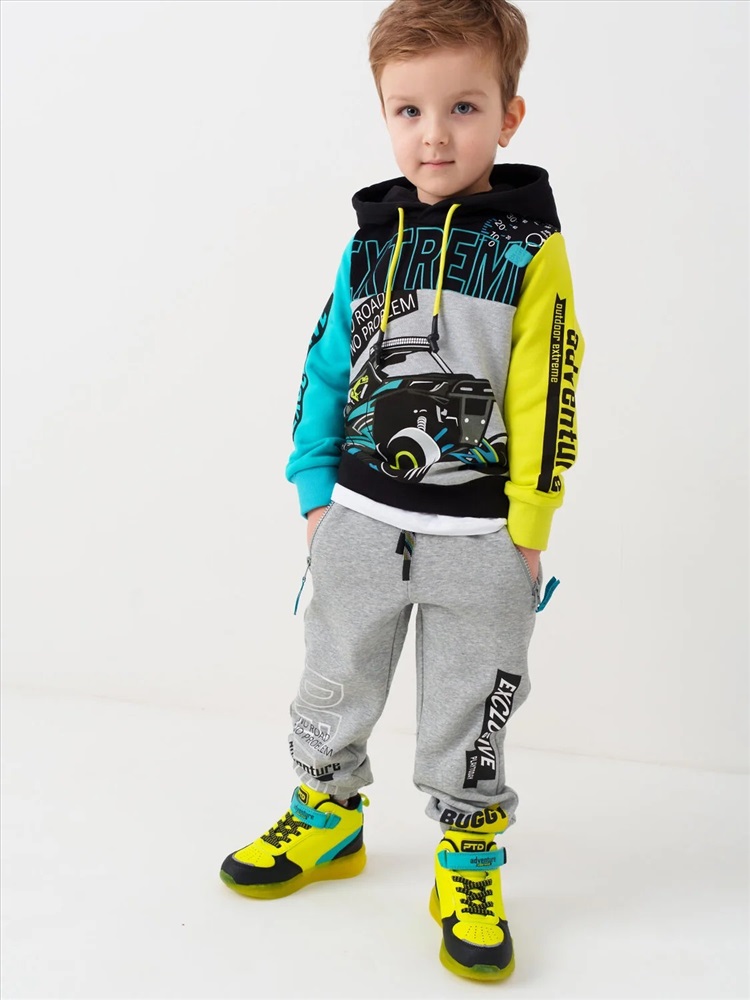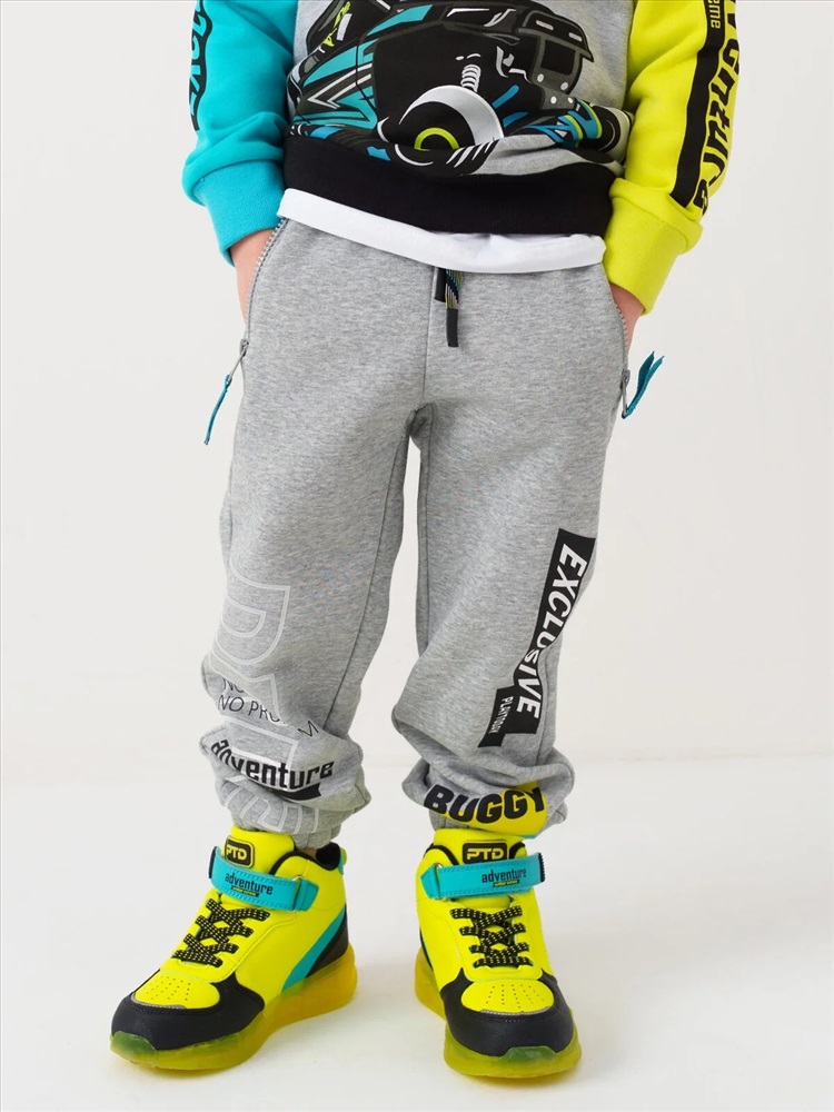Брюки-джоггеры детские для мальчика. Выполнены из хлопкового трикотажа футер без начеса. Модель прямого кроя со средней посадкой на талии. Пояс выполнен на резинке, дополнительно регулируется шнурком. По бокам — удобные карманы на молнии. В нижней части брючин предусмотрены эластичные трикотажные манжеты для лучшей фиксации. Брюки украшены принтами в гоночной тематике.