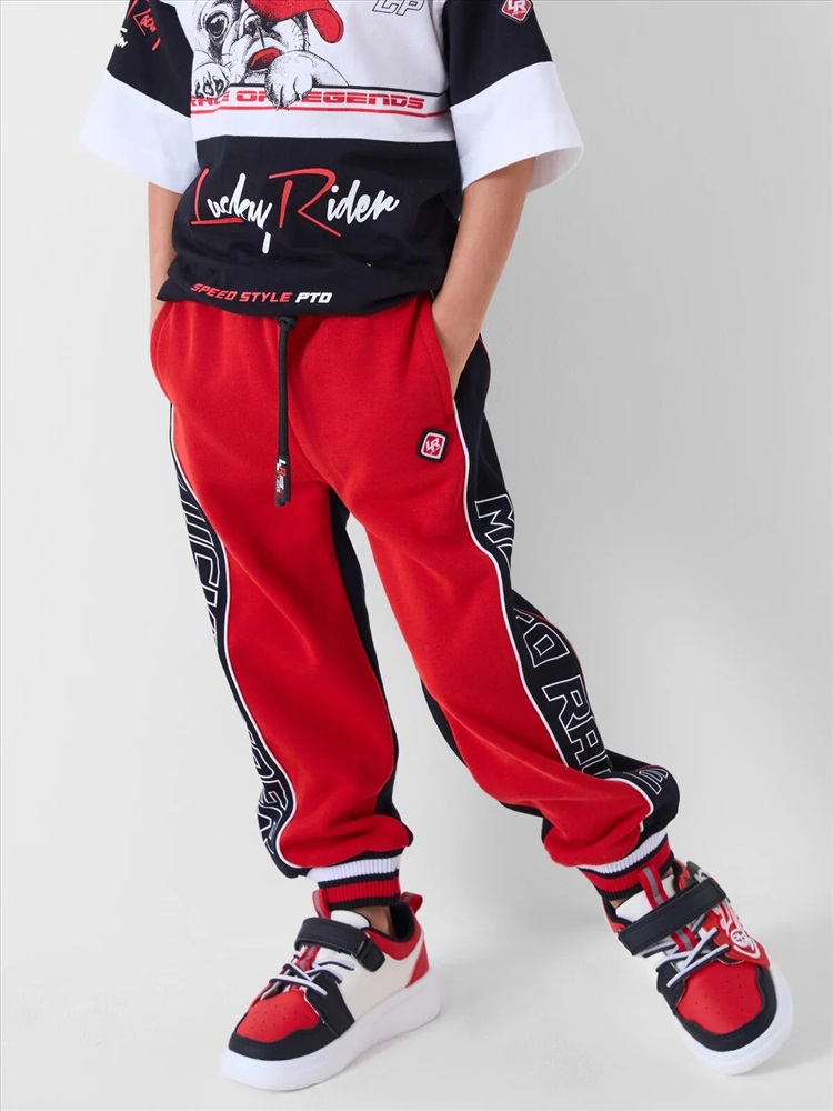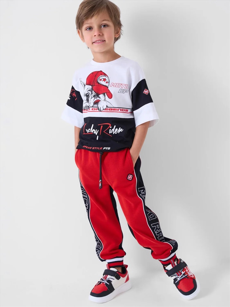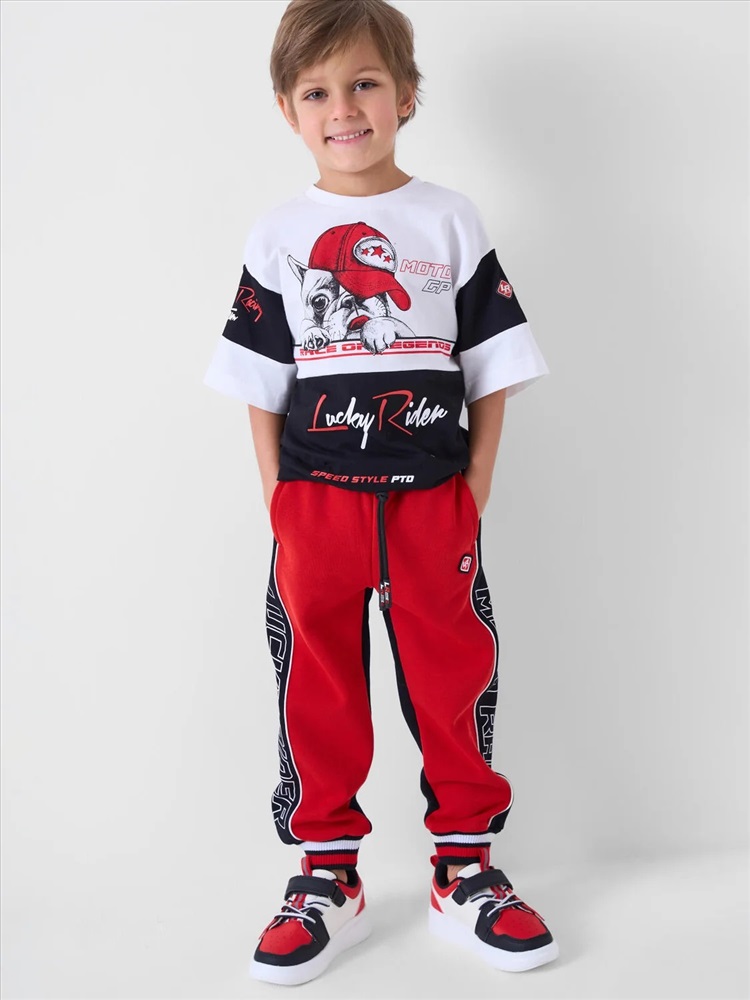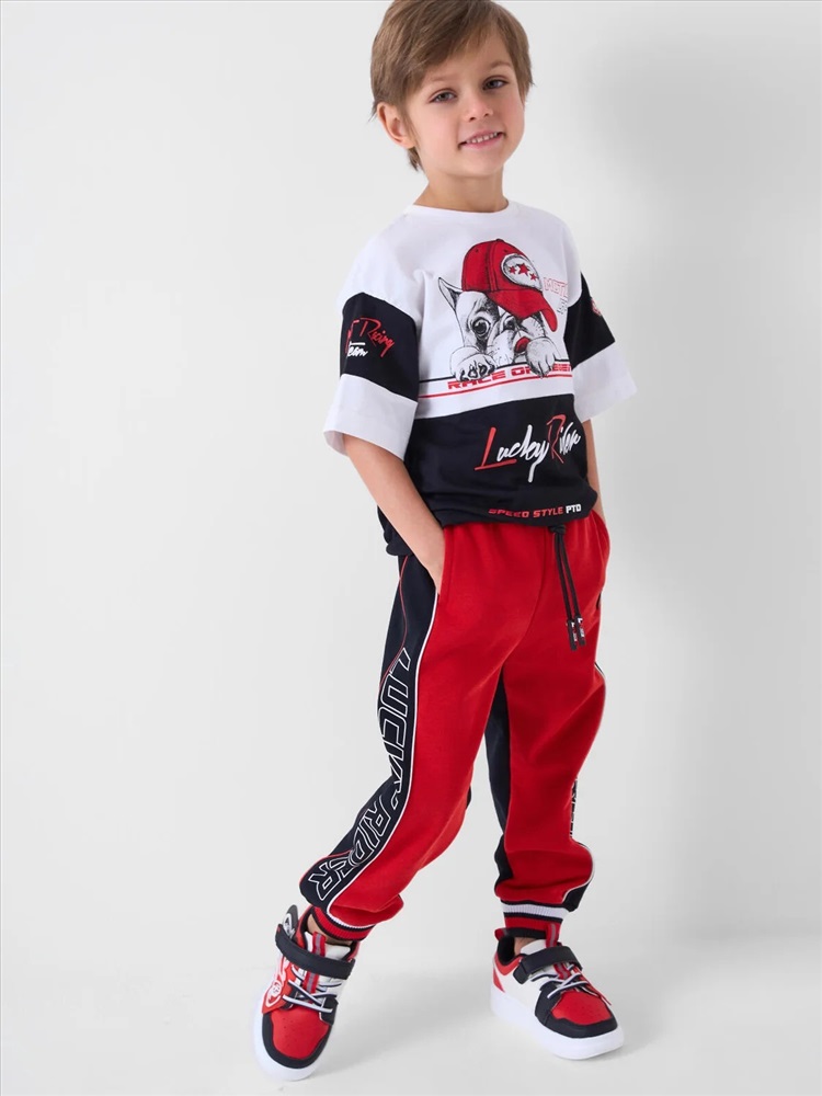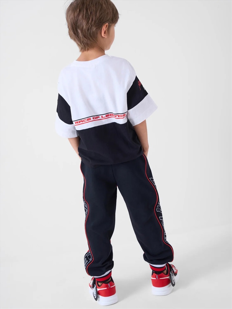 Брюки-джоггеры детские для мальчика. Выполнены из хлопкового трикотажа футер без начеса. Модель прямого кроя со средней посадкой на талии. Пояс выполнен на резинке, дополнительно регулируется шнурком. По бокам — удобные карманы. В нижней части брючин предусмотрены эластичные трикотажные манжеты для лучшей фиксации. Брюки украшены лампасами, принтами и нашивкой в гоночной тематике.