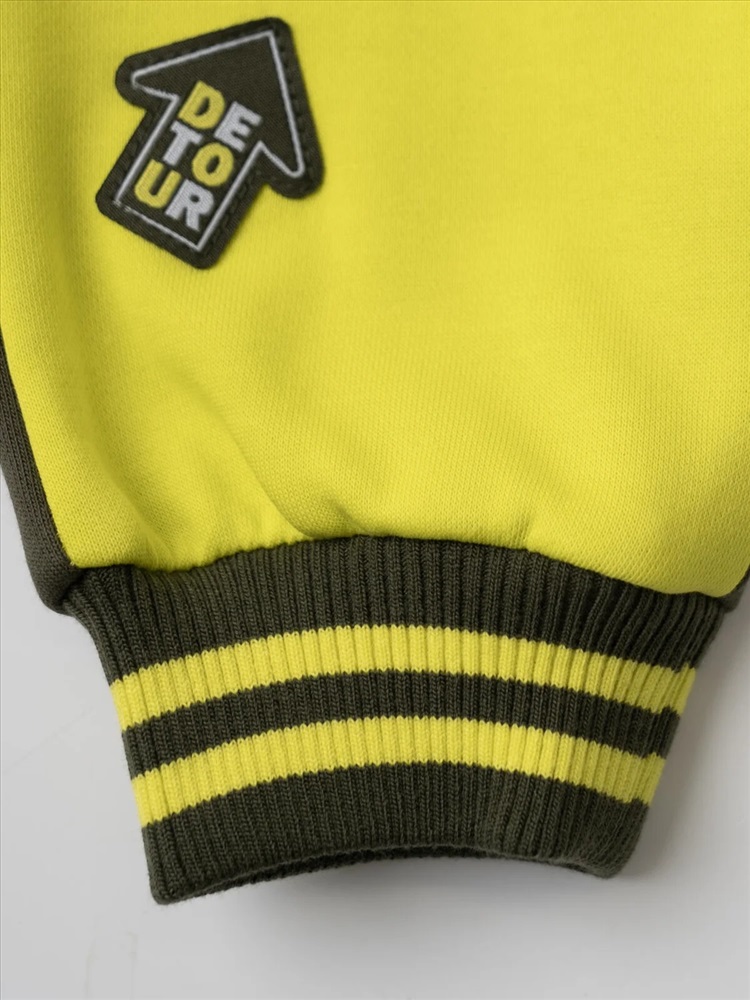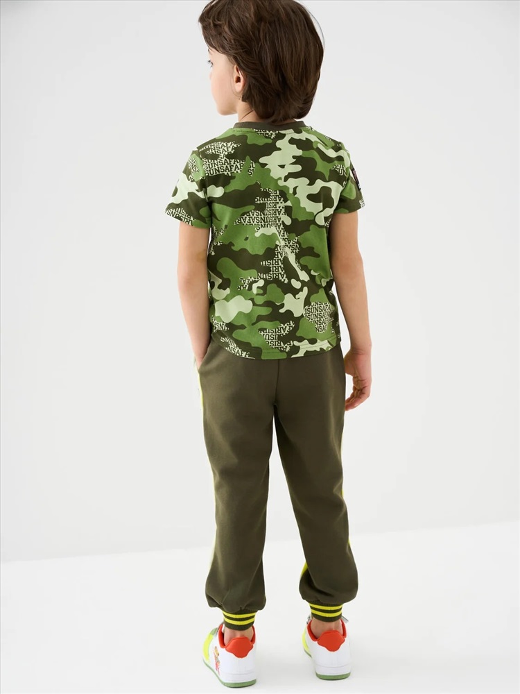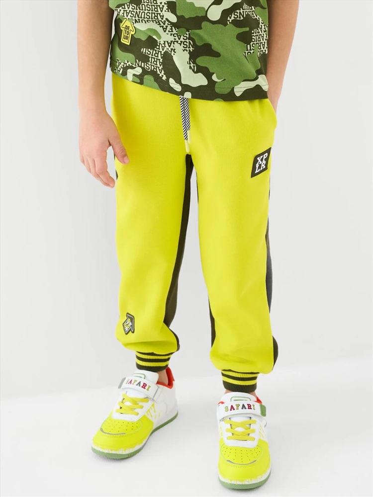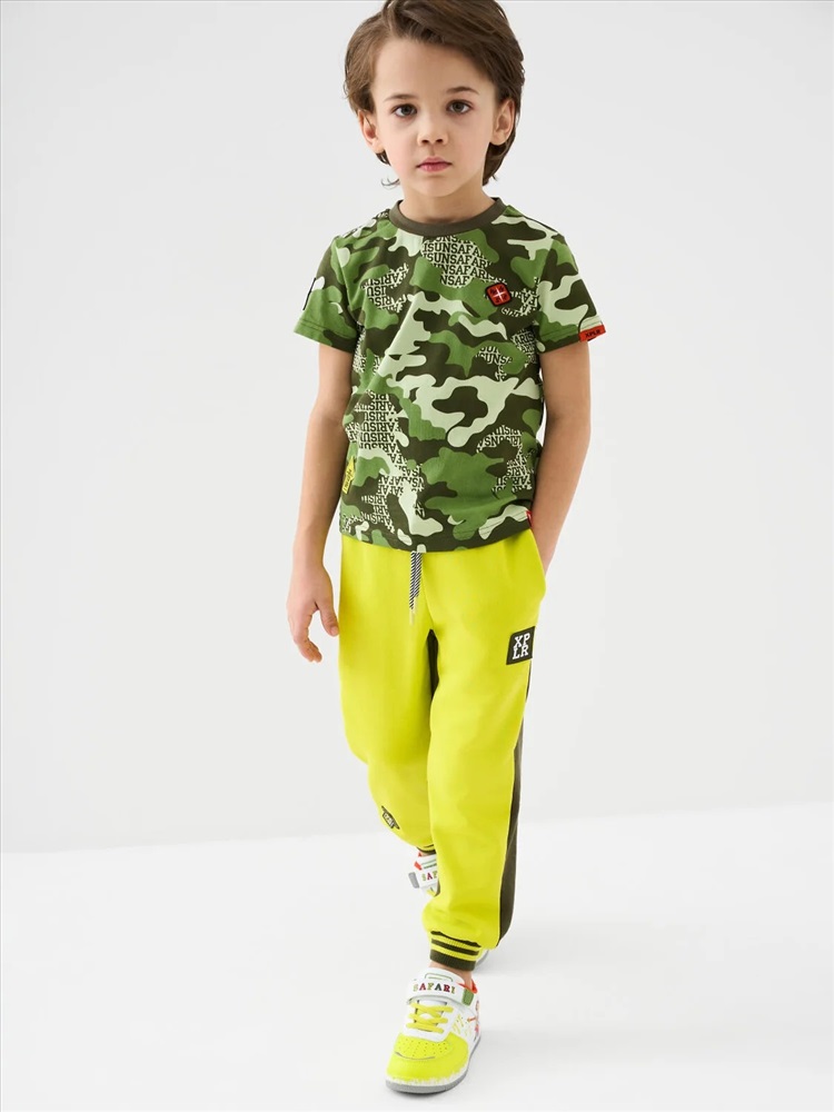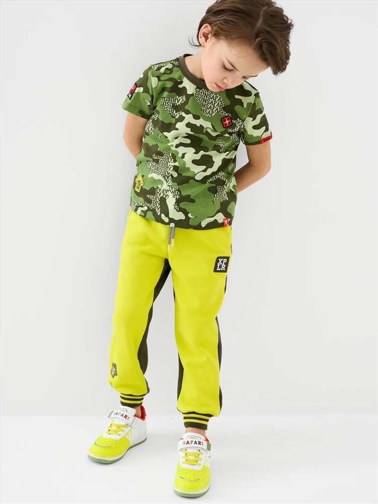 Брюки-джоггеры детские для мальчика. Выполнены из хлопкового трикотажа футер без начеса. Модель прямого кроя со средней посадкой на талии. Пояс выполнен на резинке, дополнительно регулируется шнурком. По бокам — удобные карманы. В нижней части брючин предусмотрены эластичные трикотажные манжеты для лучшей фиксации. Брюки украшены нашивками.