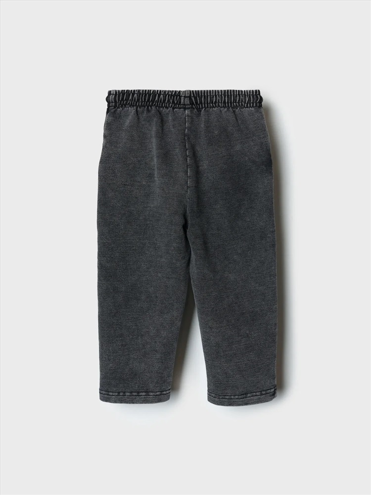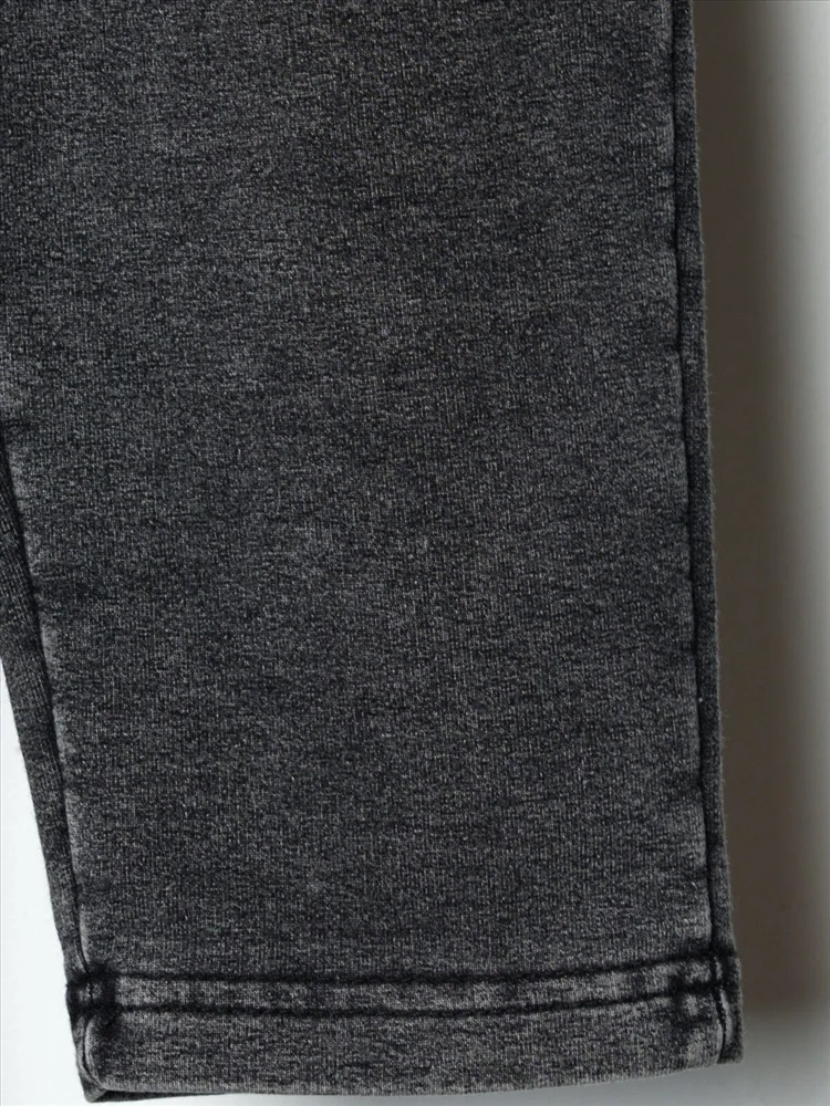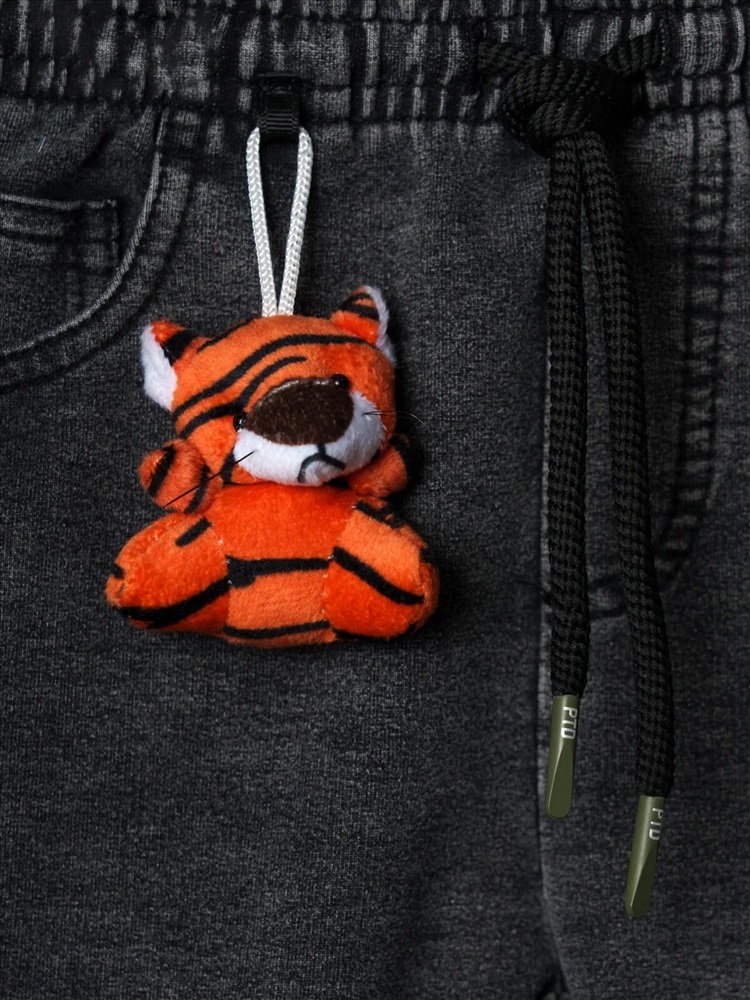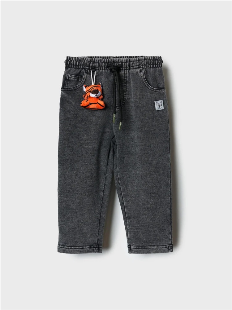 Детские брюки для мальчика. Модель прямого силуэта, выполнена из мягкого хлопкового трикотажа с эффектом денима. У брюк высокий комфортный пояс на широкой резинке и шнурок для регулировки. Спереди — два удобных кармана. Декоративная нашивка, а на левом кармане — съемный брелок в виде тигренка.