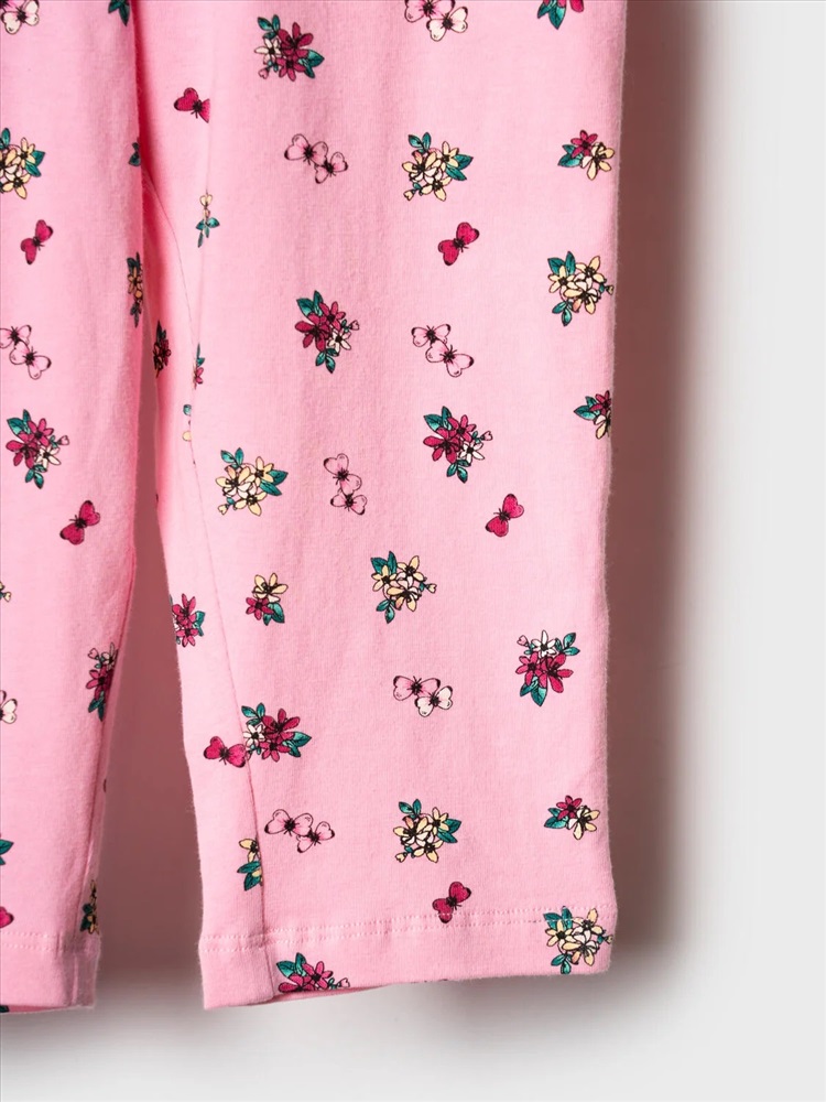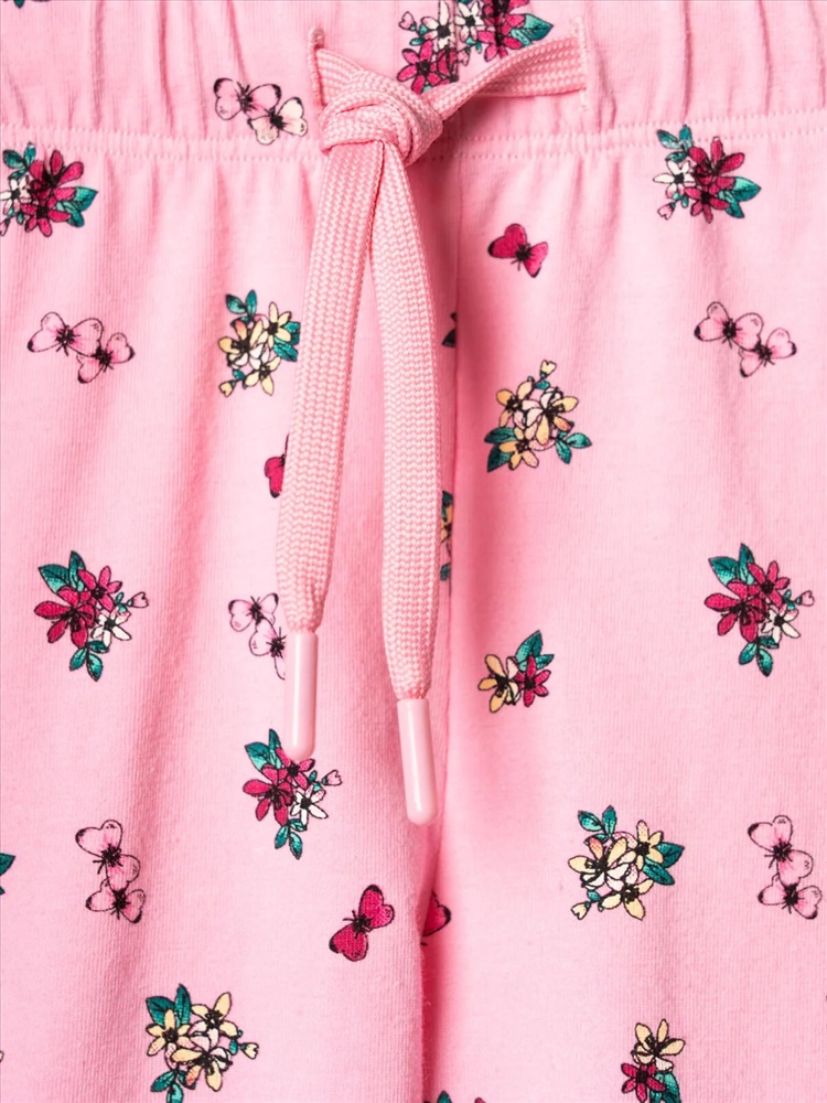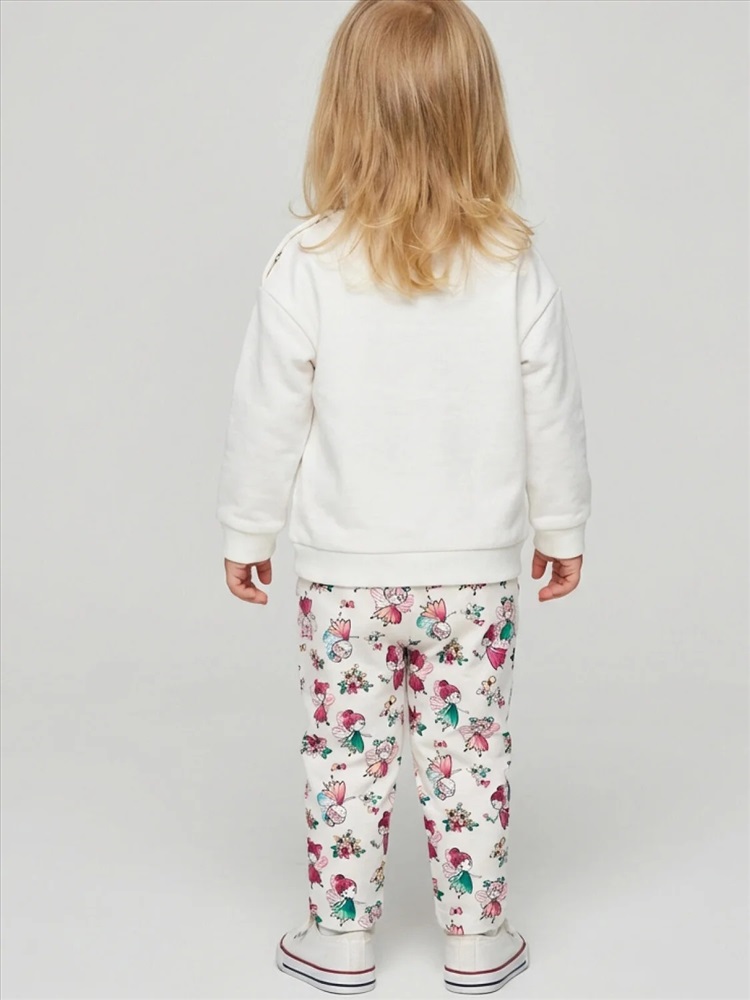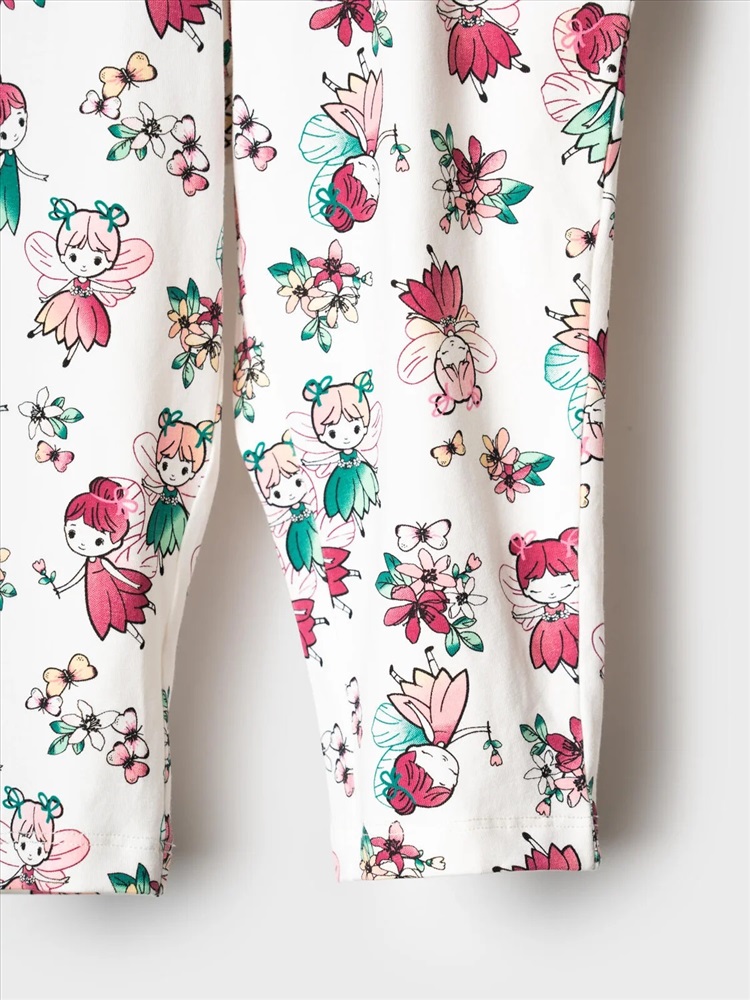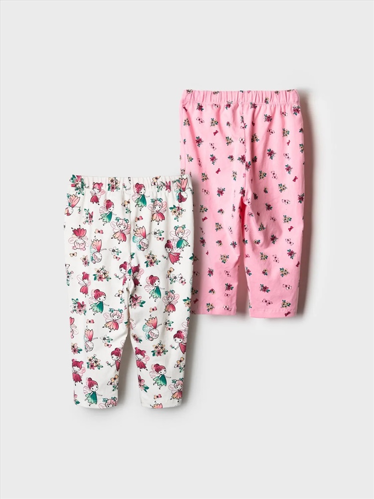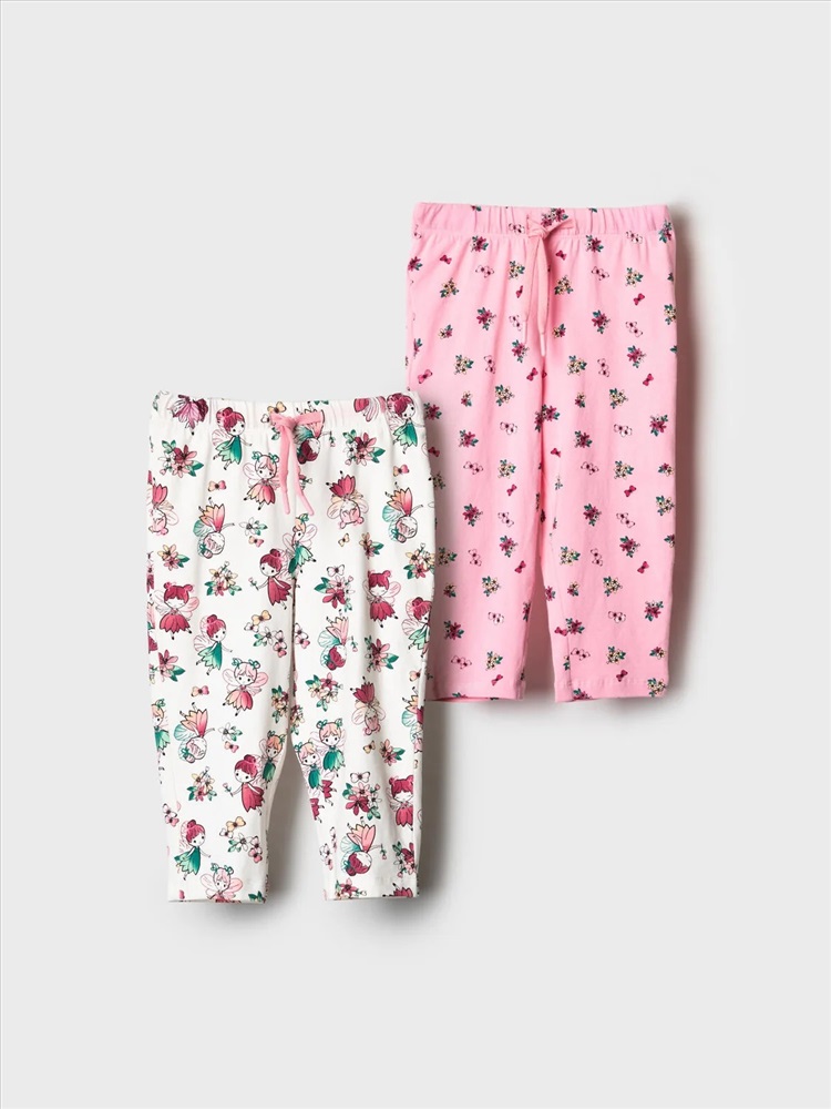 Комплект детских брюк для девочки. Набор из двух брюк выполнен из хлопкового трикотажа джерси. Модель прямого кроя со средней посадкой на талии. Пояс на резинке. Украшены принтами с цветами и феями.