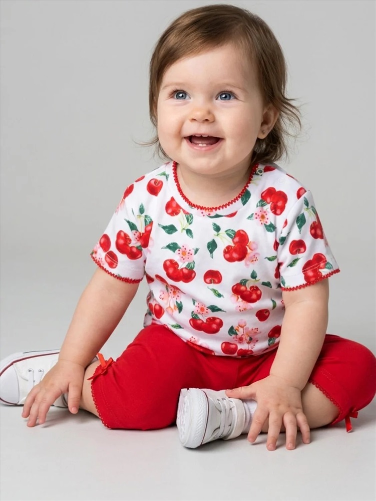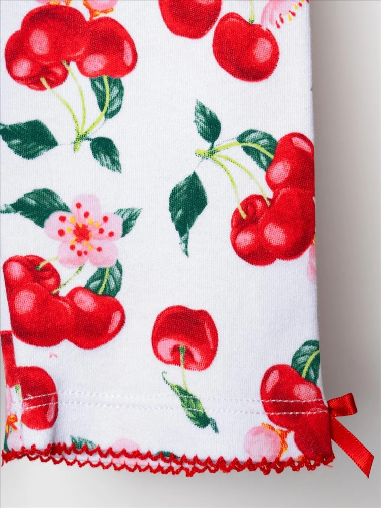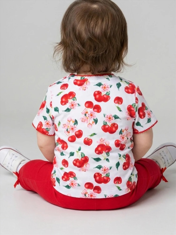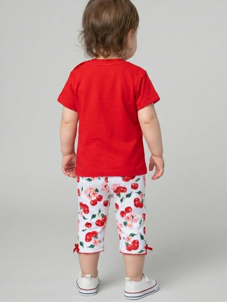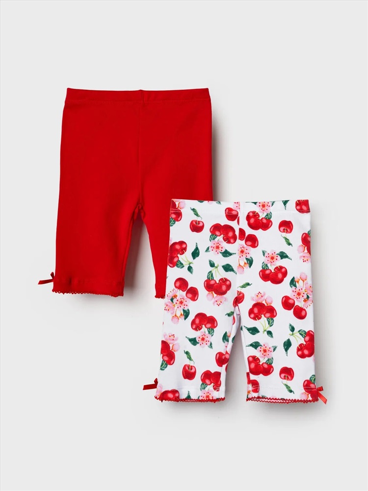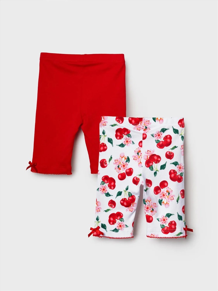 Набор детских легинсов для девочки. Комплект состоит из двух пар укороченных легинсов. Первая пара выполнена в классическом красном цвете, вторая — с ярким принтом вишен, листьев и цветов. Леггинсы украшены декоративными бантиками. Обе модели имеют высокую посадку и эластичный пояс, который хорошо фиксирует изделие на талии. Материал - мягкий, хлопковый трикотаж.