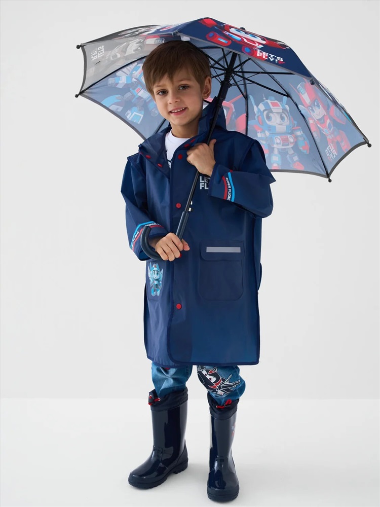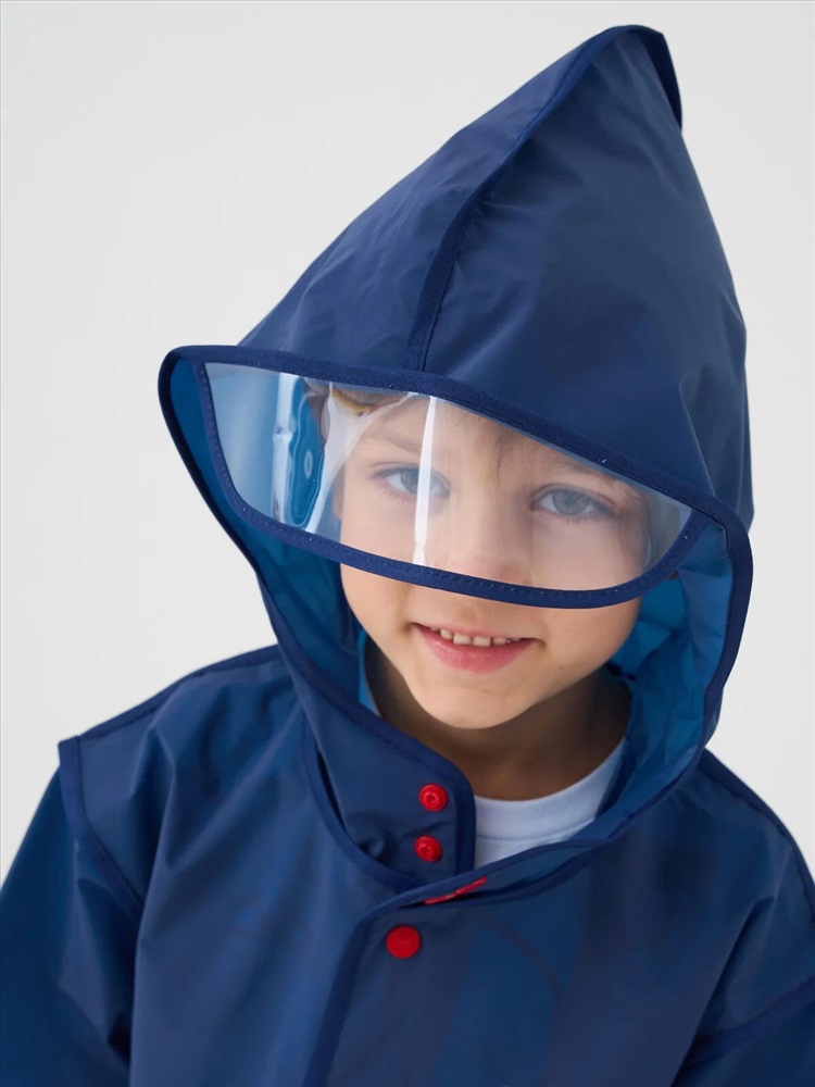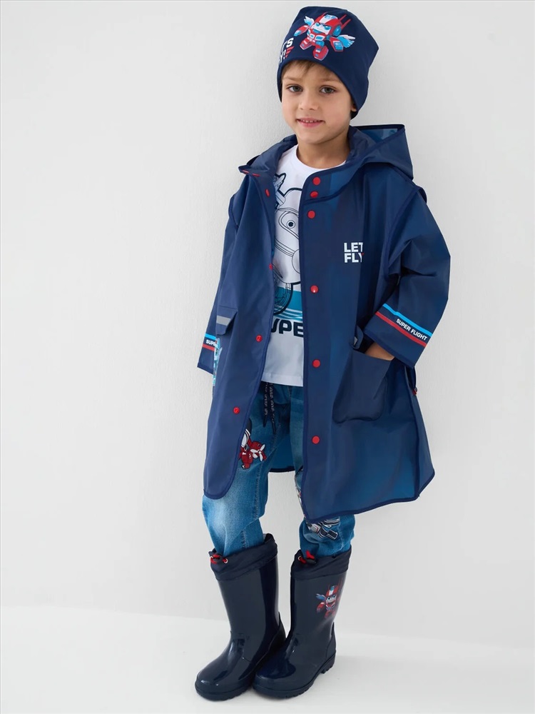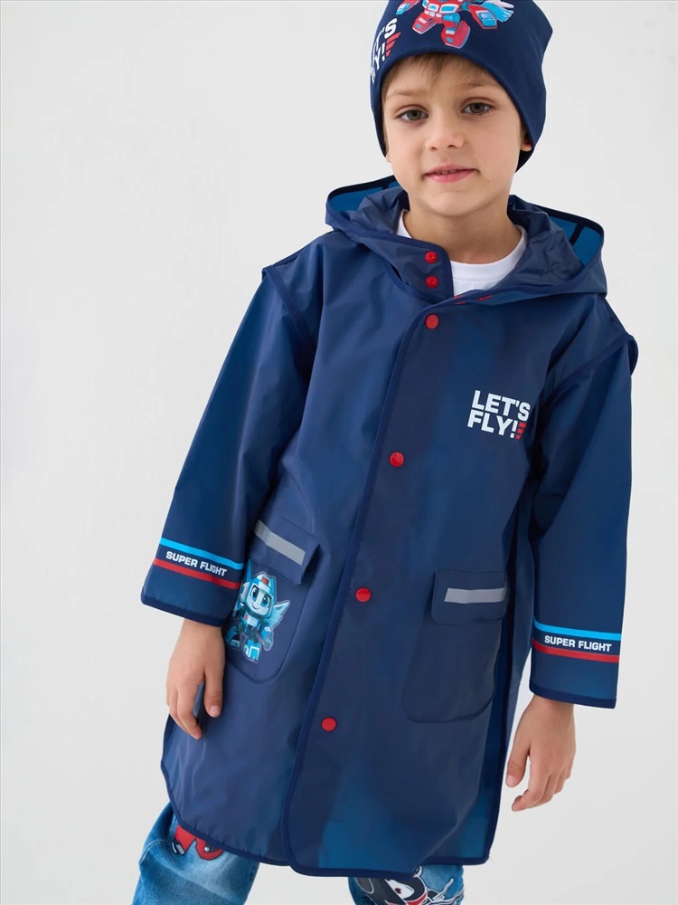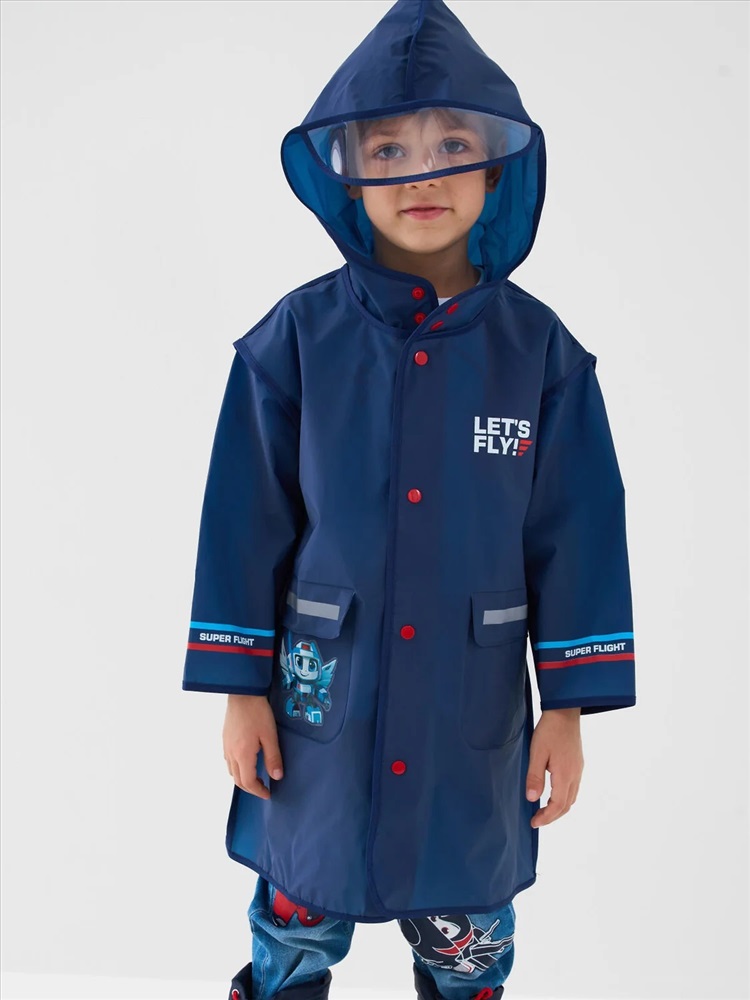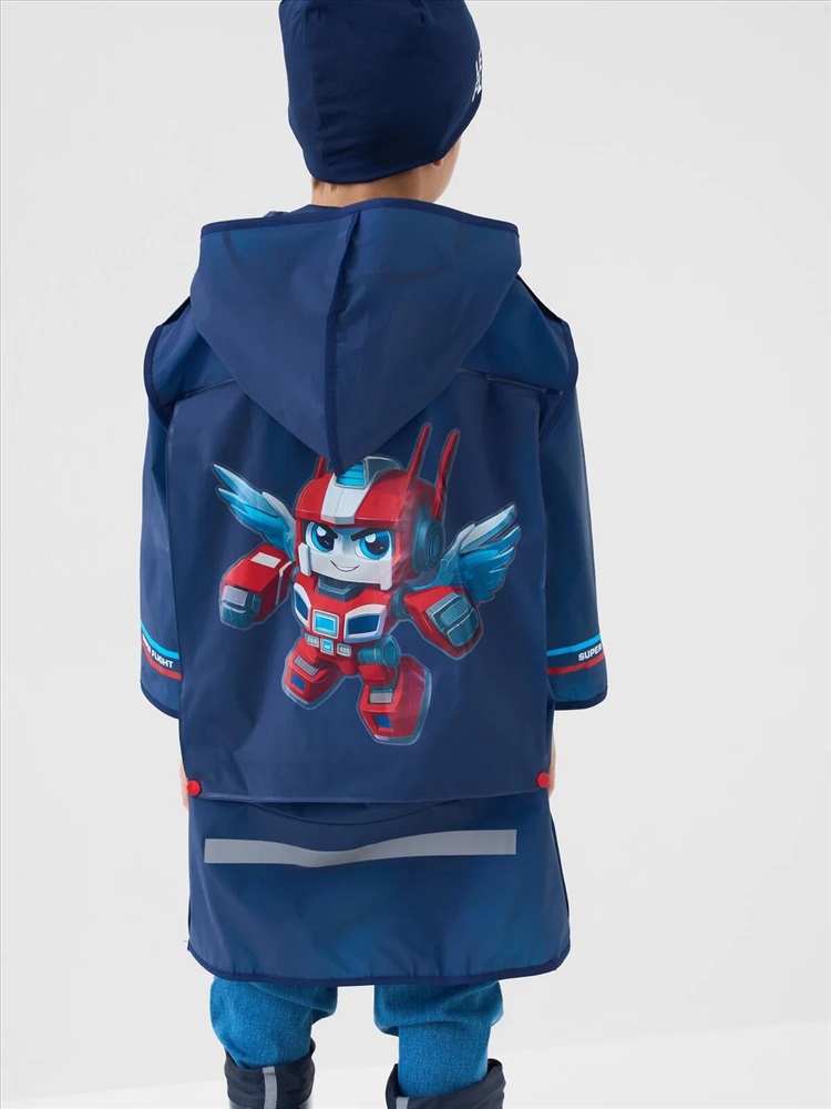 Дождевик детский с козырьком для мальчика. Застежка на кнопки. Материал ЭВА. Без подкладки. Модель имеет спереди два накладных кармана с клапаном. Сзади имеется объемный клапан на кнопках для изменения объема плаща под рюкзак. Есть светоотражающие элементы спереди, сзади и на рукавах. Добавлена петелька под капюшоном с внешней стороны, чтобы остальные вещи на вешалке не намокали. Модель идеально сочетается с резиновыми сапогами и зонтом из коллекции. В комплекте идет непромокаемая сумочка.