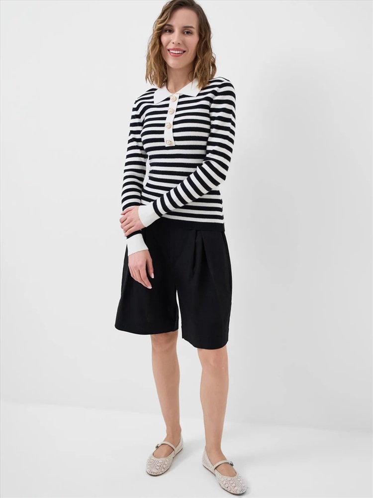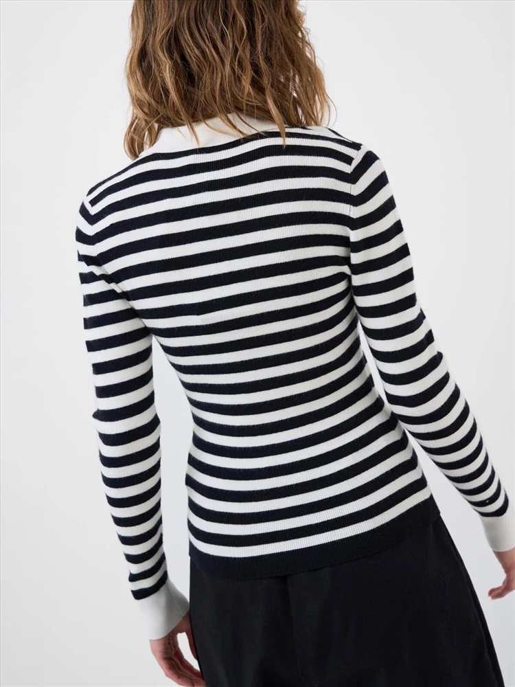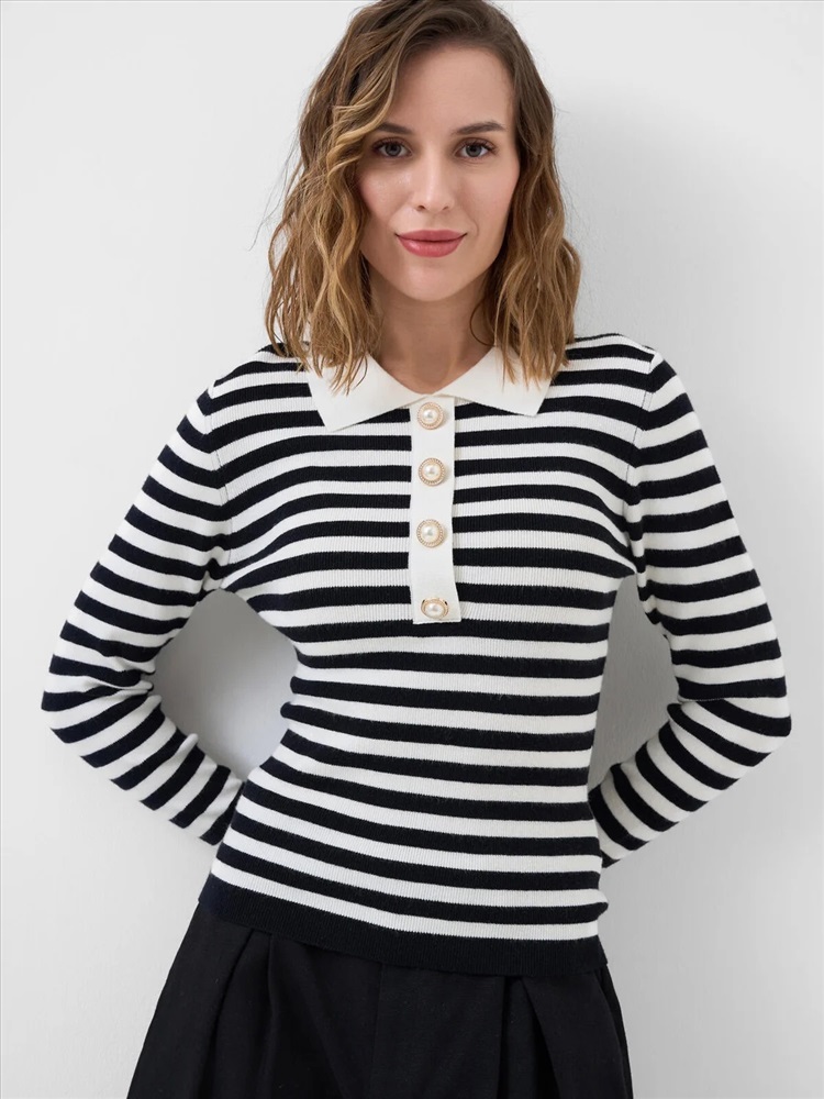 Женский джемпер. Модель в морском стиле с классическим воротником поло и длинными рукавами. Застёжка на четыре пуговицы спереди. Изделие выполнено из мягкого вязаного трикотажа.