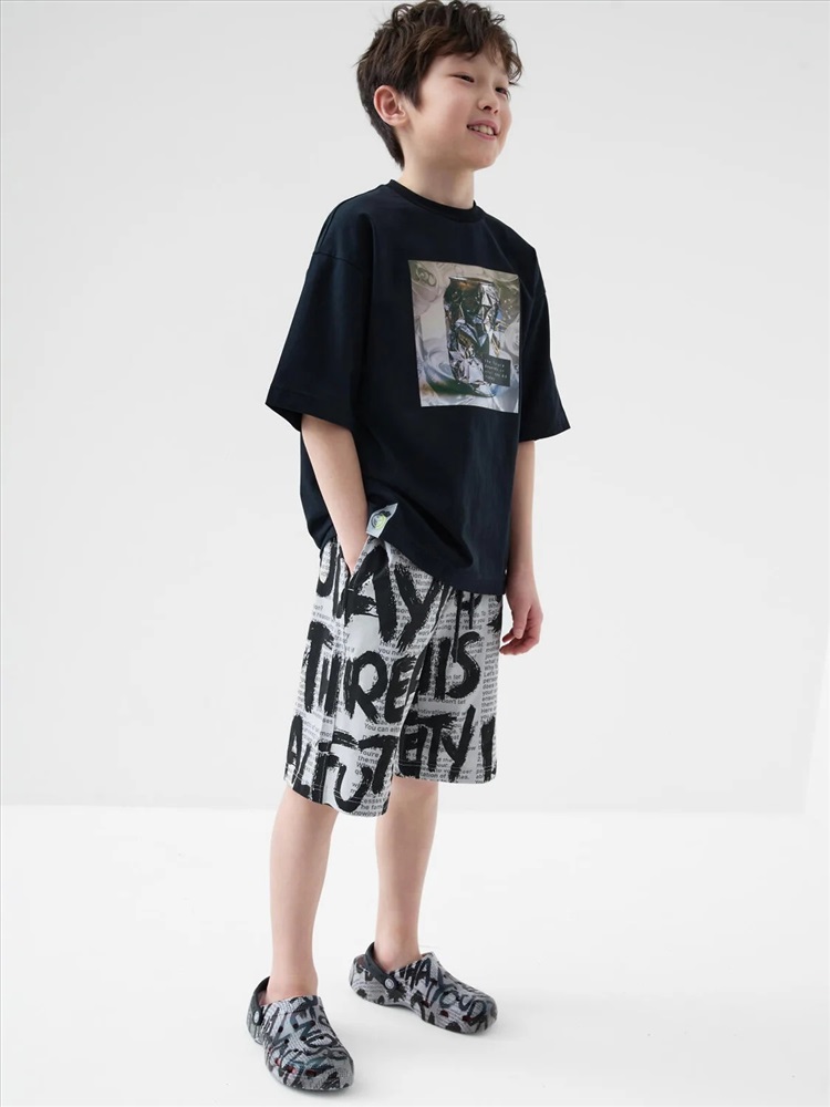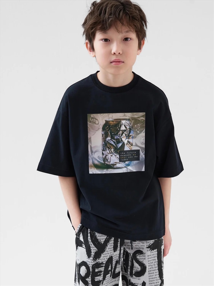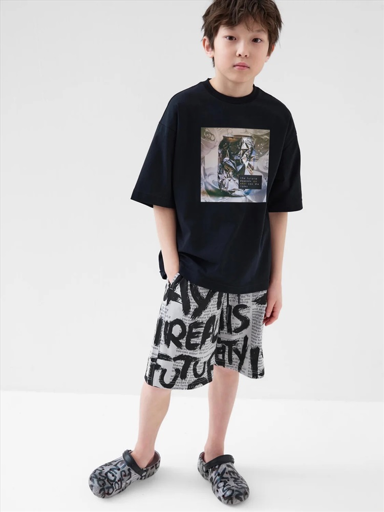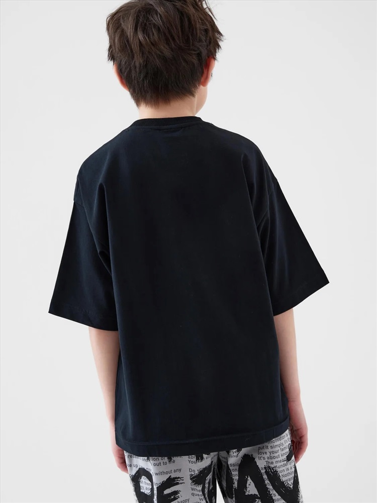 Футболка оверсайз для мальчика подростка. Модель выполнена из хлопкового трикотажа джерси. Спереди - красочный принт, декоративная нашивка внизу.