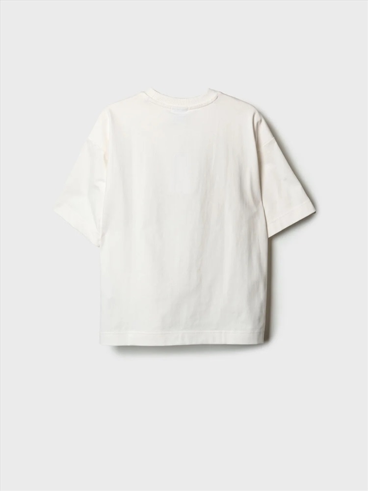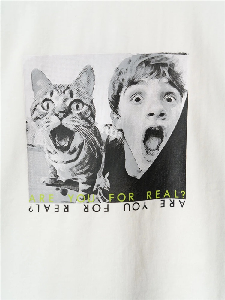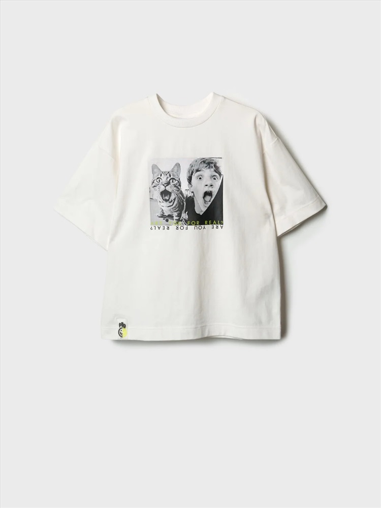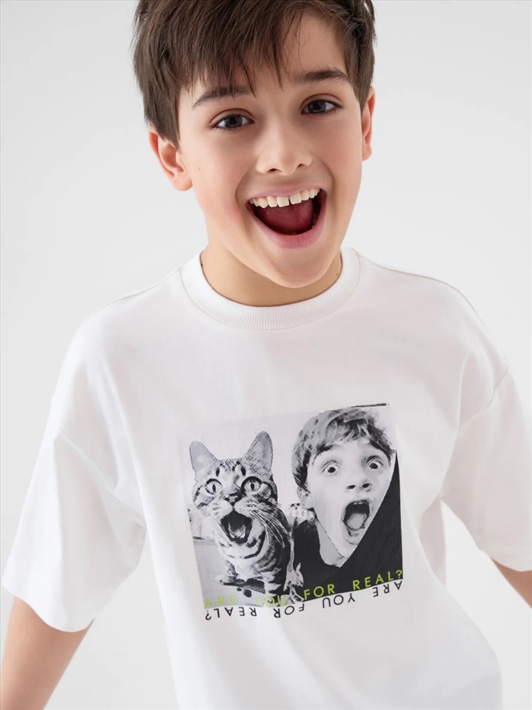 Футболка оверсайз для мальчика подростка. Модель выполнена из эластичного хлопкового трикотажа джерси. На груди расположен крупный принт с изображением мальчика и кота. Горловина круглая, обработана эластичным рибом. В нижней части — небольшая силиконовая нашивка.