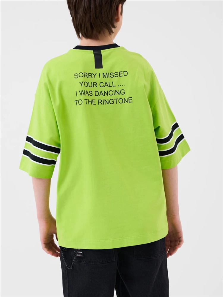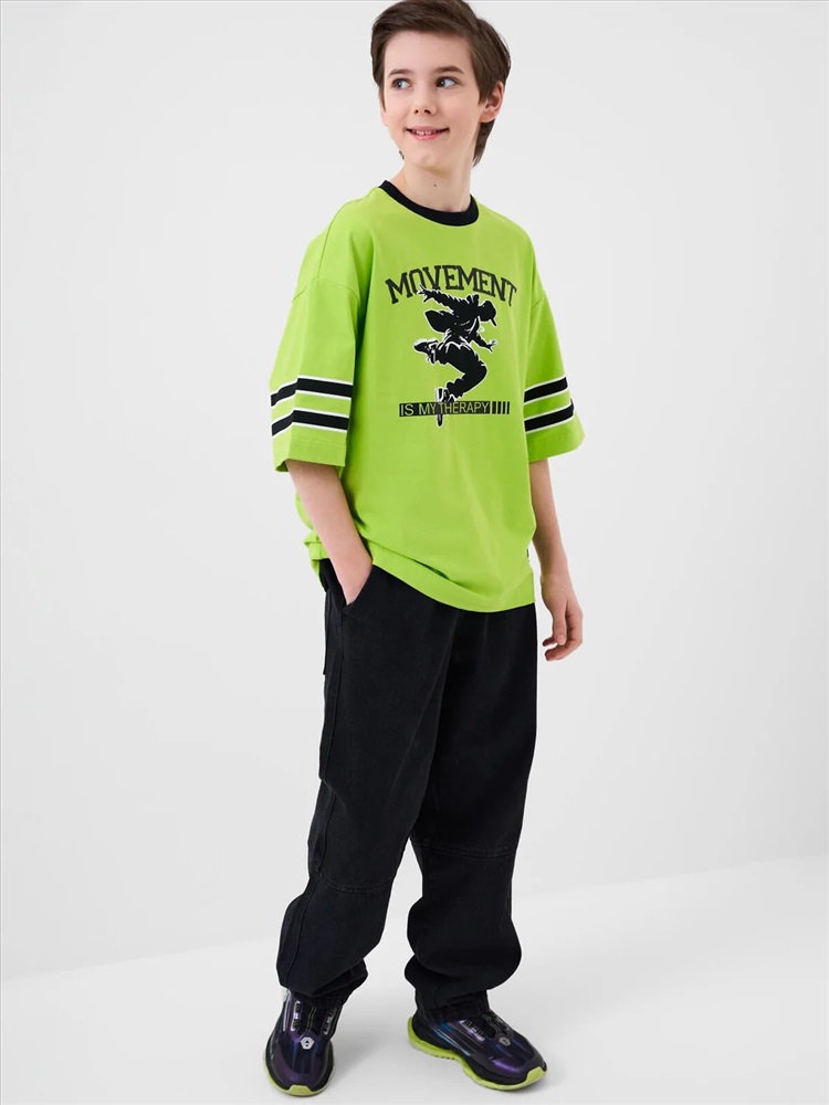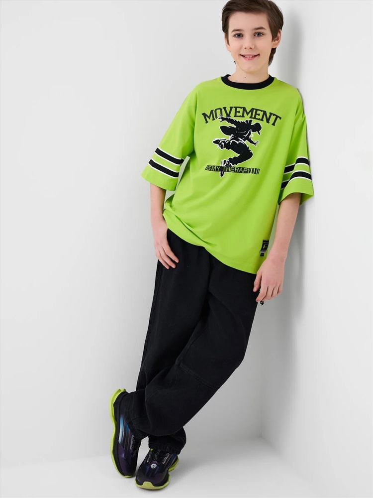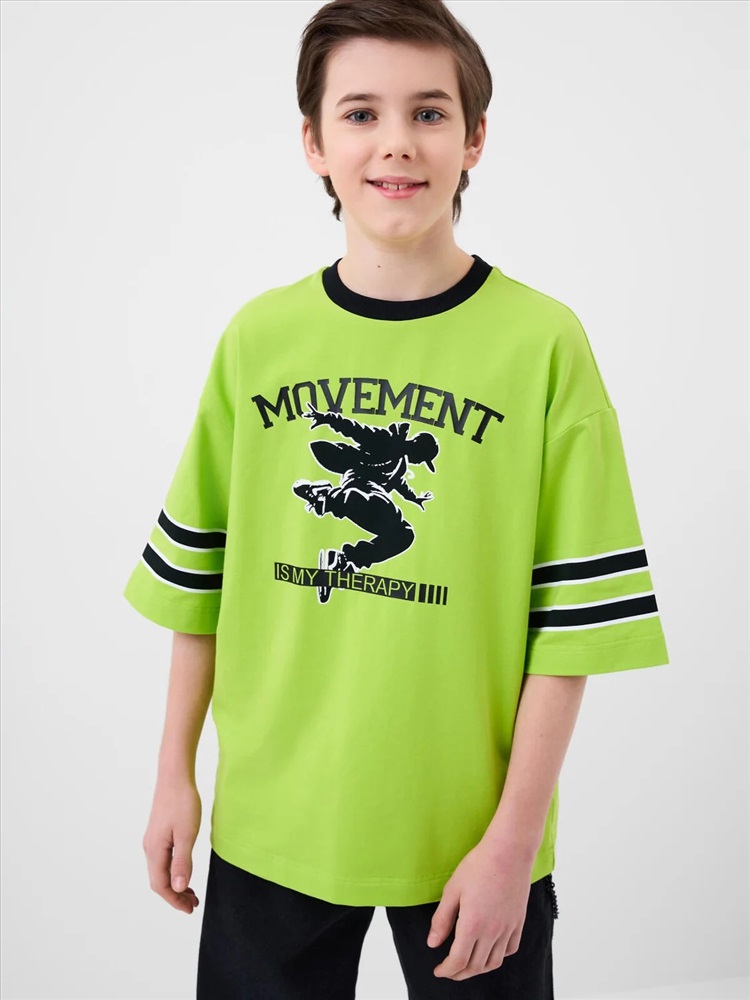 Футболка оверсайз для мальчика подростка. Модель выполнена из эластичного хлопкового трикотажа джерси. Спереди и на спинке расположен крупный принт. Горловина круглая, обработана эластичным рибом. В нижней части — небольшая нашивка.