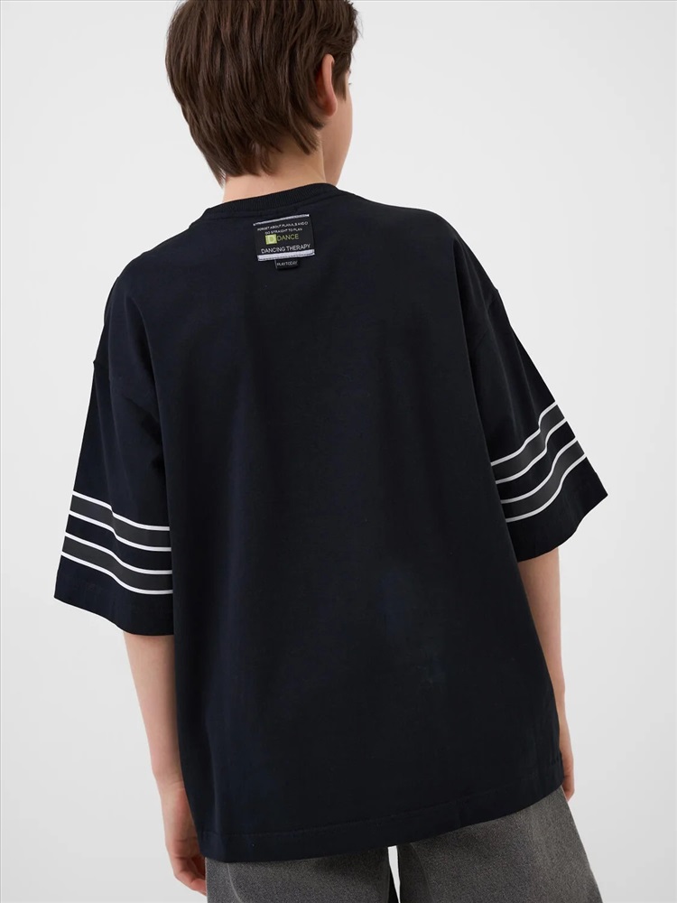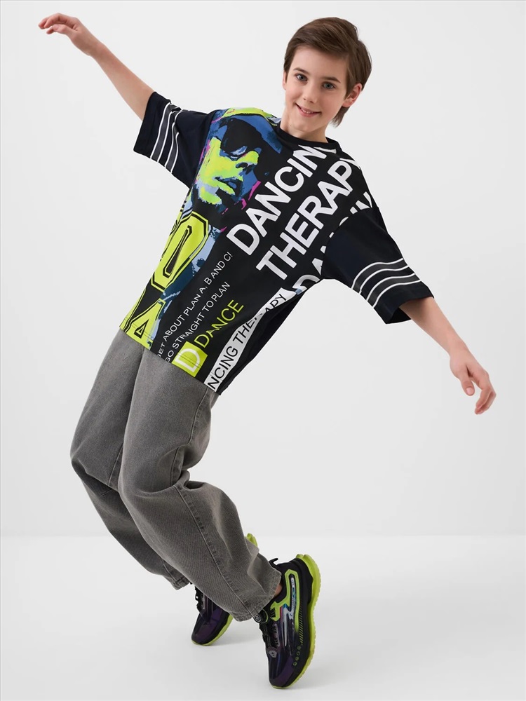 Футболка оверсайз для мальчика подростка. Модель выполнена из эластичного хлопкового трикотажа джерси. Спереди расположен крупный принт. Горловина круглая, обработана эластичным рибом. На спине — небольшая нашивка.