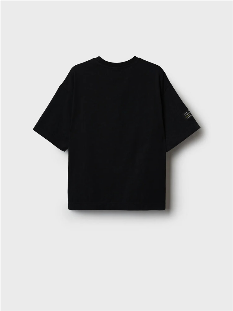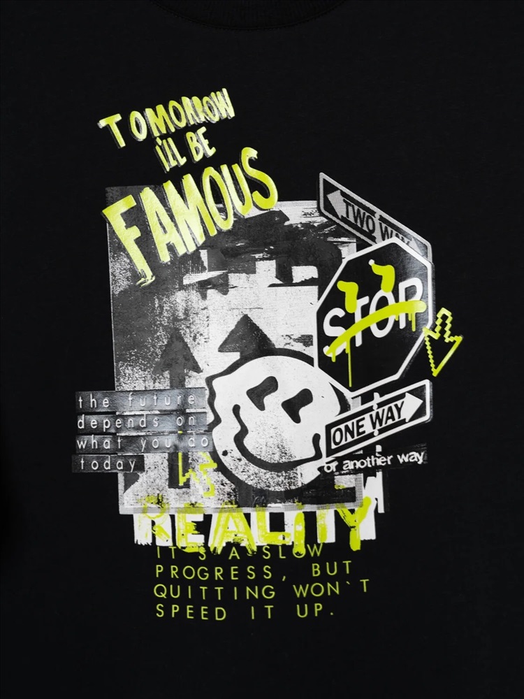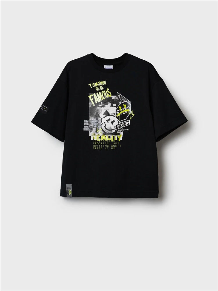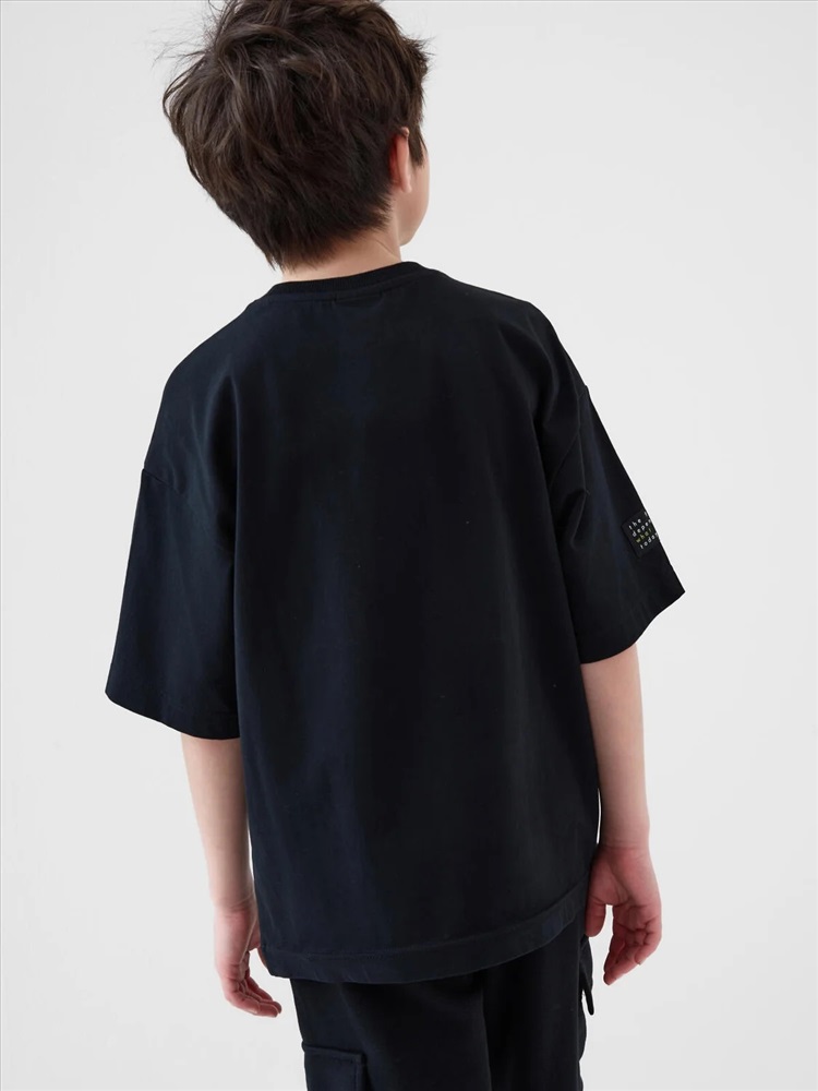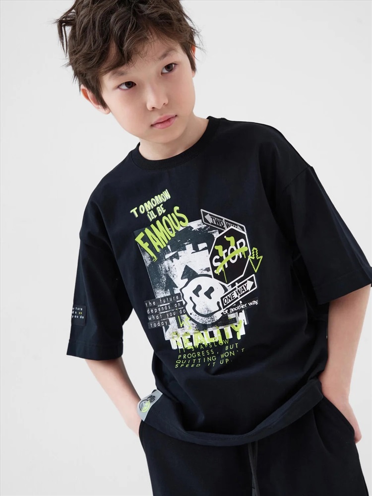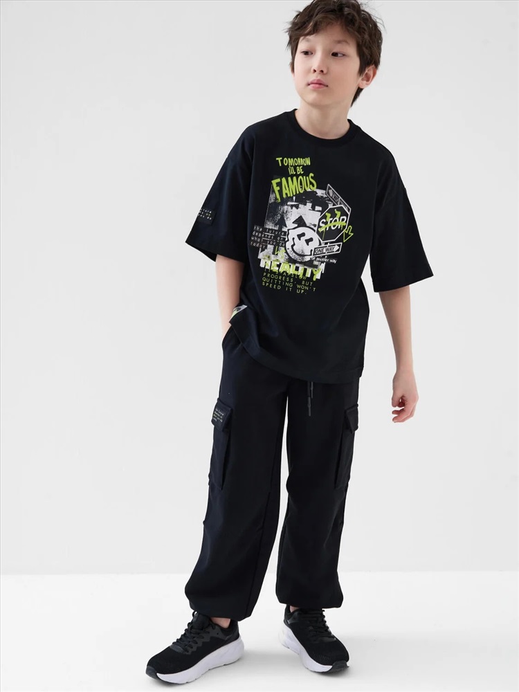 Футболка оверсайз для мальчика подростка. Модель выполнена из эластичного хлопкового трикотажа джерси. На груди расположен крупный принт. Горловина круглая, обработана эластичным рибом. В нижней части и на плече — небольшие нашивки.
