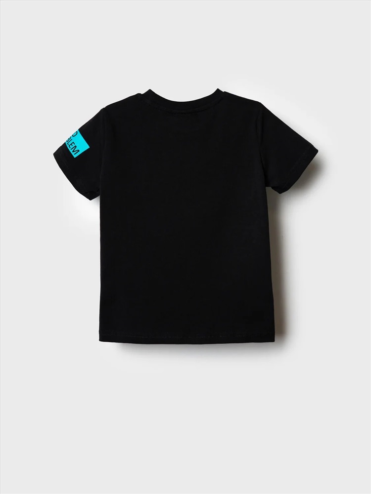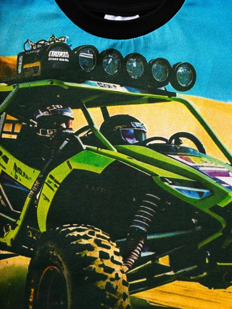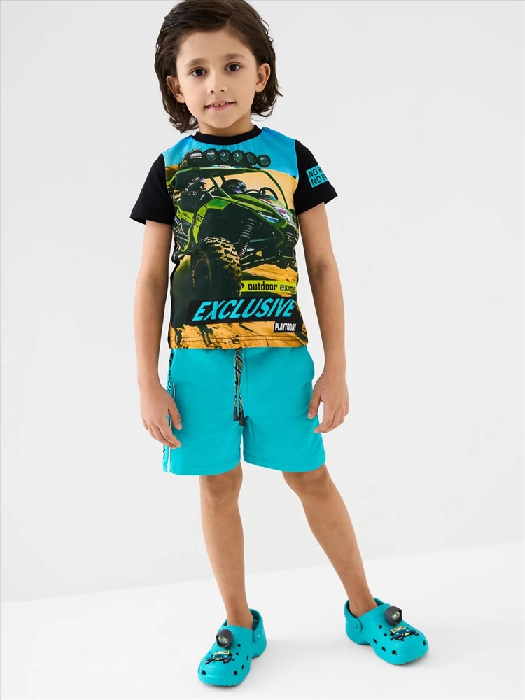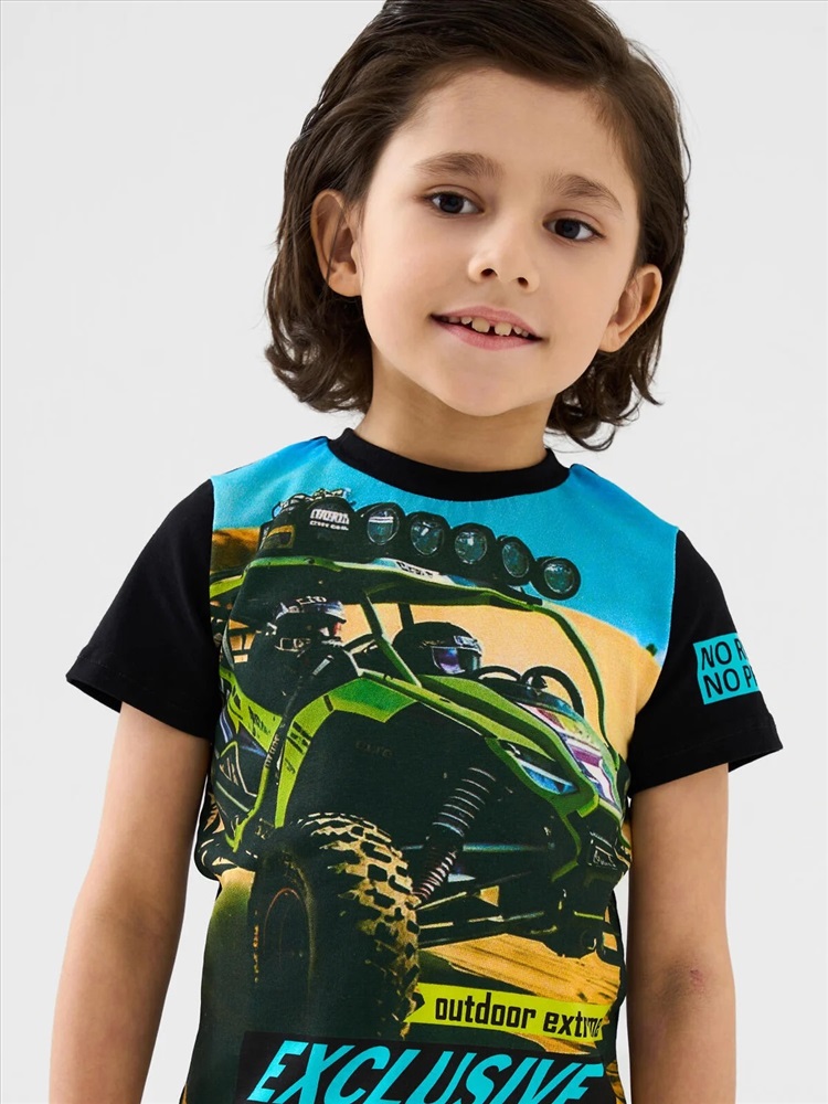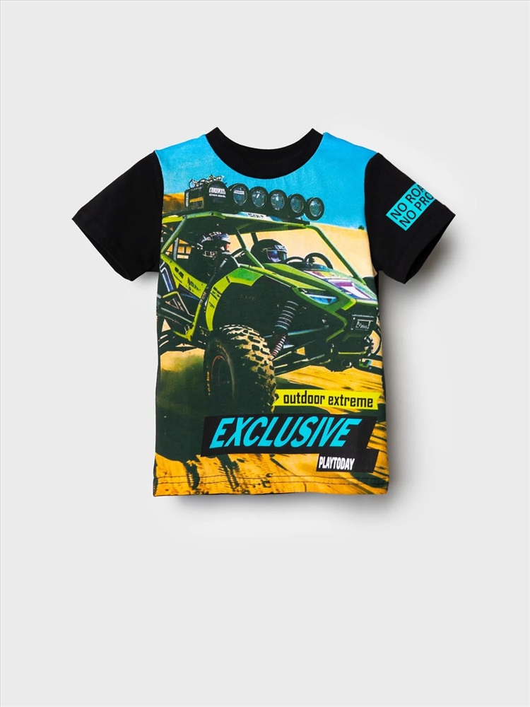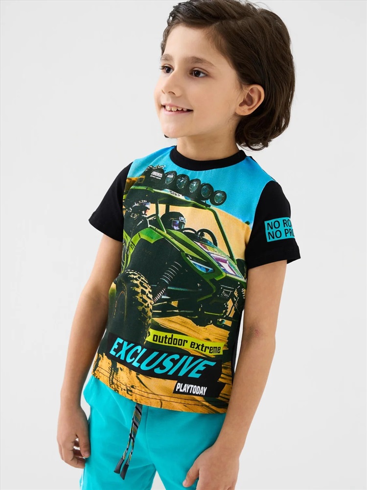 Производитель: PLAYTODAY; Российский размер: 98; Рост: 98; Возраст: 3; Обхват шеи: 25,5; Артикул поставщика: 12612227; Состав: 95% хлопок, 5% эластан; Год: 2026 Детская футболка для мальчика. Модель прямого кроя, выполнена из эластичного хлопкового трикотажа джерси. Спереди расположен крупный принт в гоночной тематике. Горловина круглая, обработана эластичным рибом.