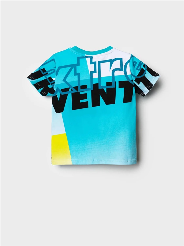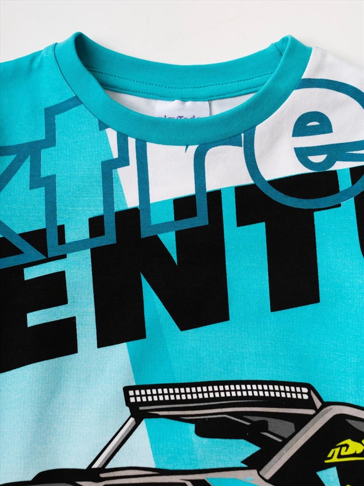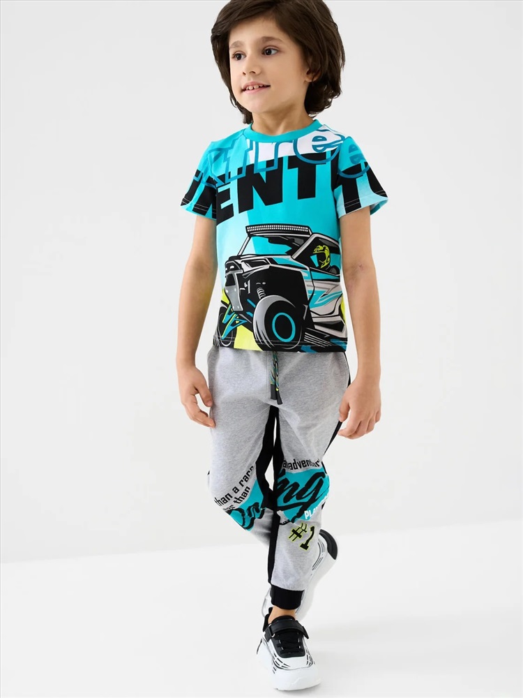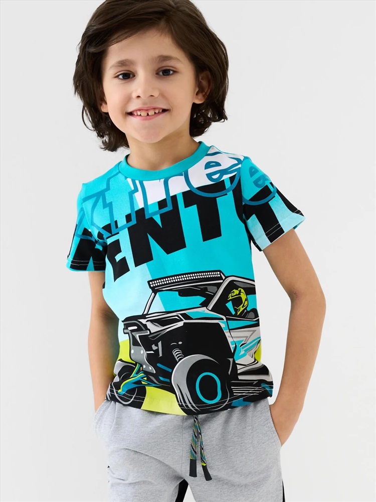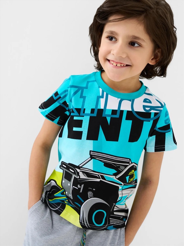 Производитель: PLAYTODAY; Российский размер: 98; Рост: 98; Возраст: 3; Обхват шеи: 25,5; Артикул поставщика: 12612228; Состав: 95% хлопок, 5% эластан; Год: 2026 Детская футболка для мальчика. Модель прямого кроя, выполнена из эластичного хлопкового трикотажа джерси. Крупный принт в гоночной тематике. Горловина круглая, обработана эластичным рибом.