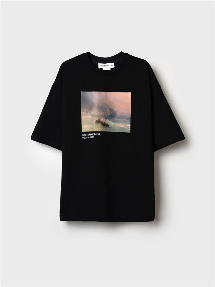 Футболка оверсайз для мальчика подростка. Модель выполнена из эластичного хлопкового трикотажа джерси. На груди изображена картина «Радуга» — российского художника-мариниста Ивана Айвазовского. Горловина круглая, обработана эластичным рибом.
