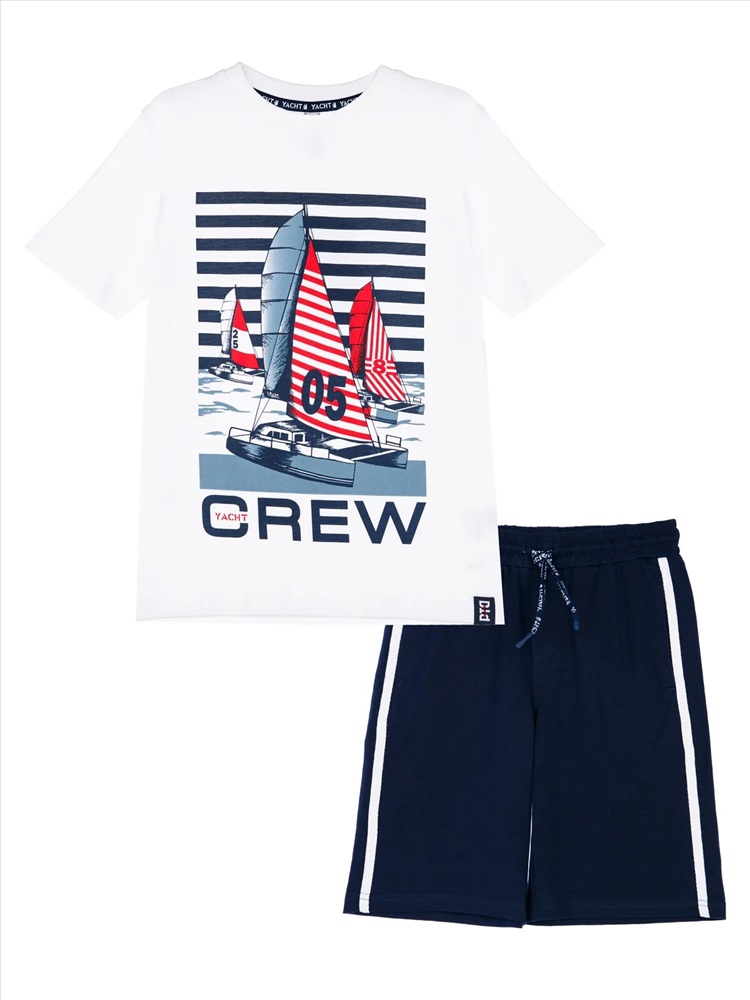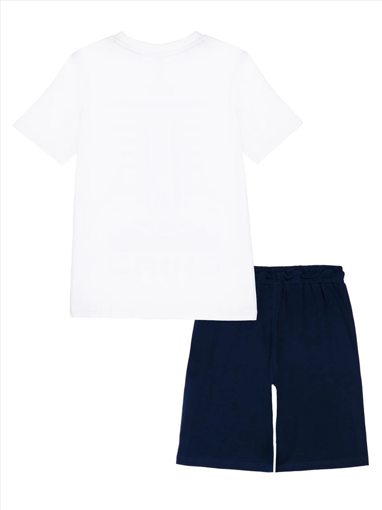 Комплект: футболка, шорты из качественного и приятного на ощупь трикотажа джерси. Высокое содержание хлопка 95%. Благодаря наличию эластана в составе ткани изделие проще в уходе и держит форму. Regular fit. Эластичный пояс со шнурком.