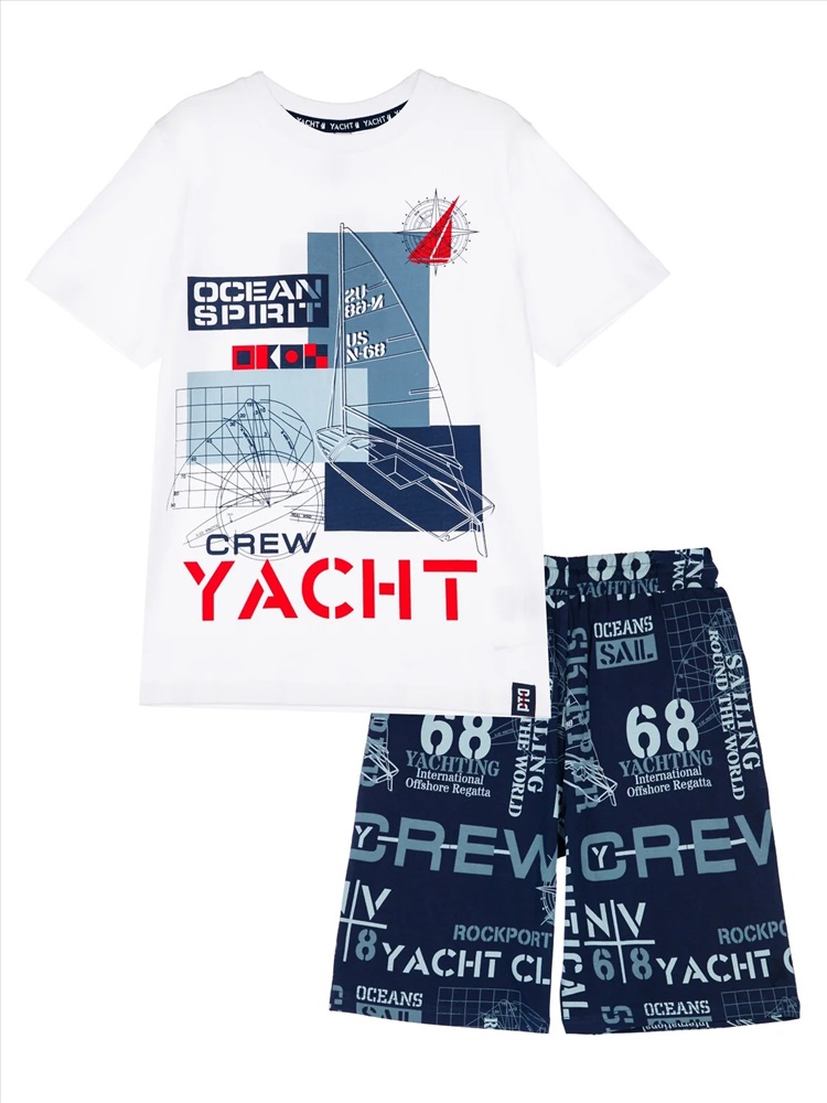 Комплект: футболка, шорты из качественного и приятного на ощупь трикотажа джерси. Высокое содержание хлопка 95%. Благодаря наличию эластана в составе ткани изделие проще в уходе и держит форму. Regular fit. Эластичный пояс со шнурком.