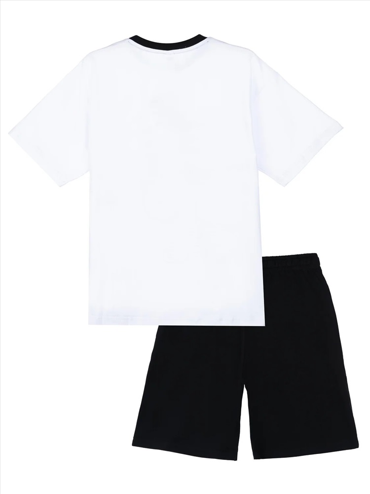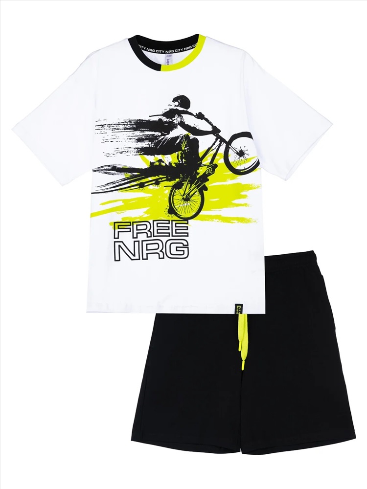 Комплект: футболка, шорты из качественного и приятного на ощупь трикотажа джерси. Высокое содержание хлопка 95%. Благодаря наличию эластана в составе ткани изделие проще в уходе и держит форму. Regular fit. Эластичный пояс со шнурком. Функциональные карманы.