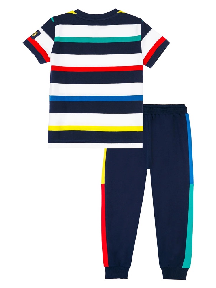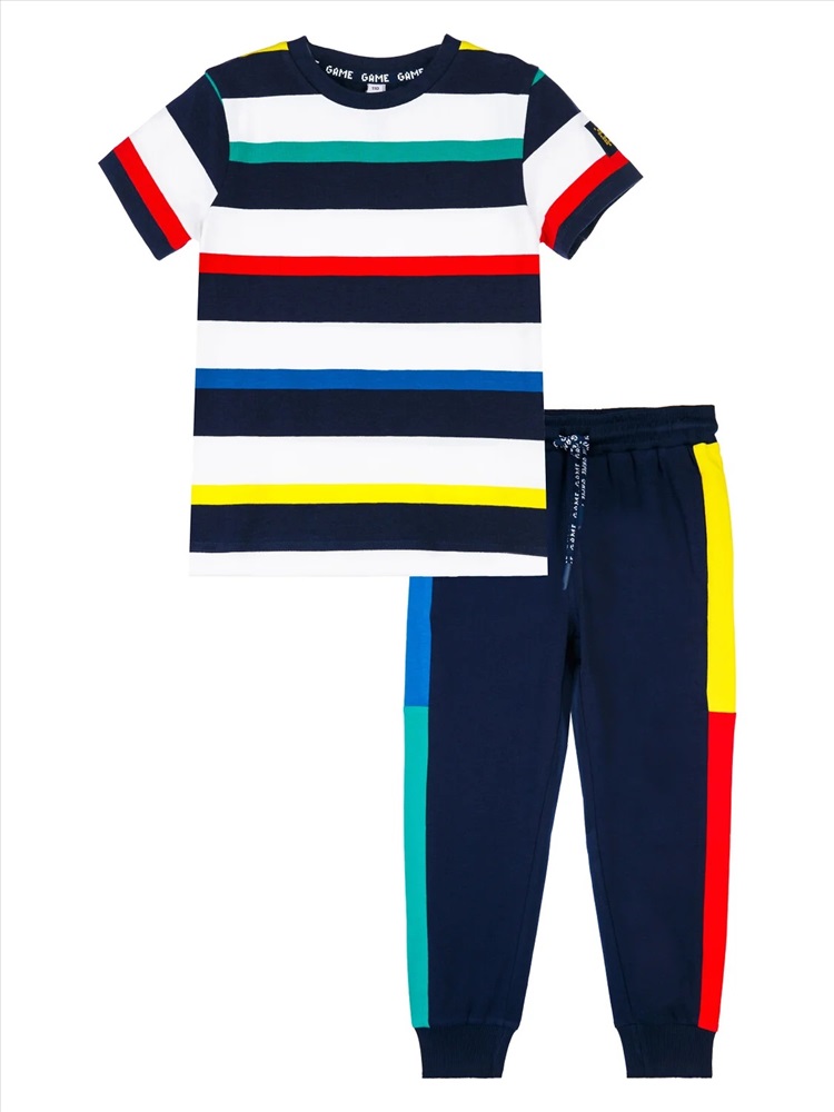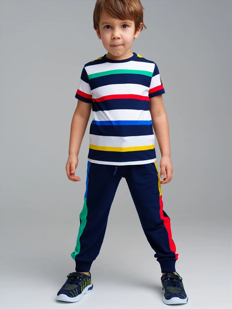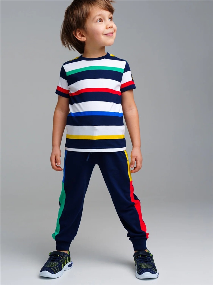 Комплект: футболка, брюки. Посадка regular fit. Из качественного эластичного и приятного на ощупь трикотажа джерси. Высокое содержание хлопка 95%. Благодаря наличию эластана в составе ткани изделие держит форму и меньше мнется. Принт сохраняет первоначальный вид даже после многочисленных стирок. Эластичный пояс с тесьмой позволяет легко надевать и утягивать до идеальной посадки в зависимости от комплекции ребенка. Нижняя кромка брючин в эластичный рубчик.