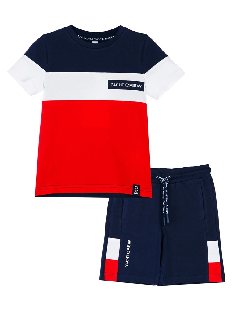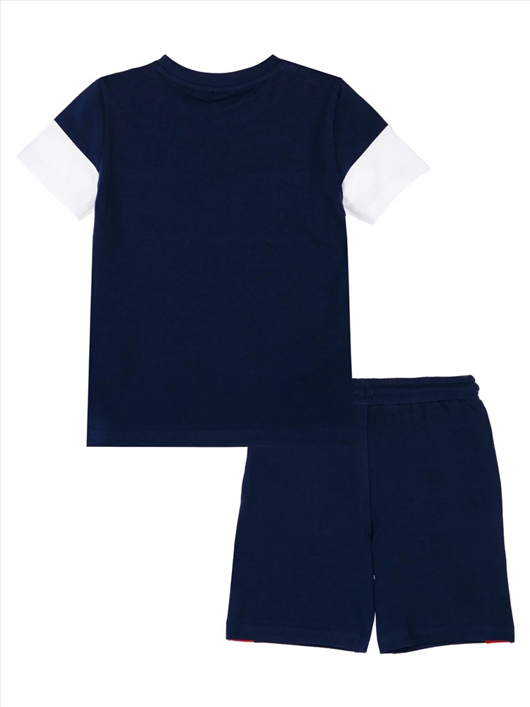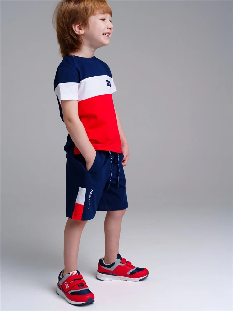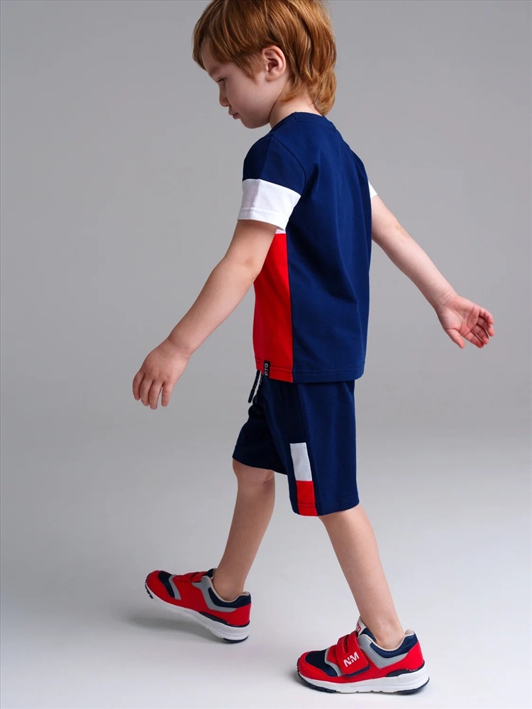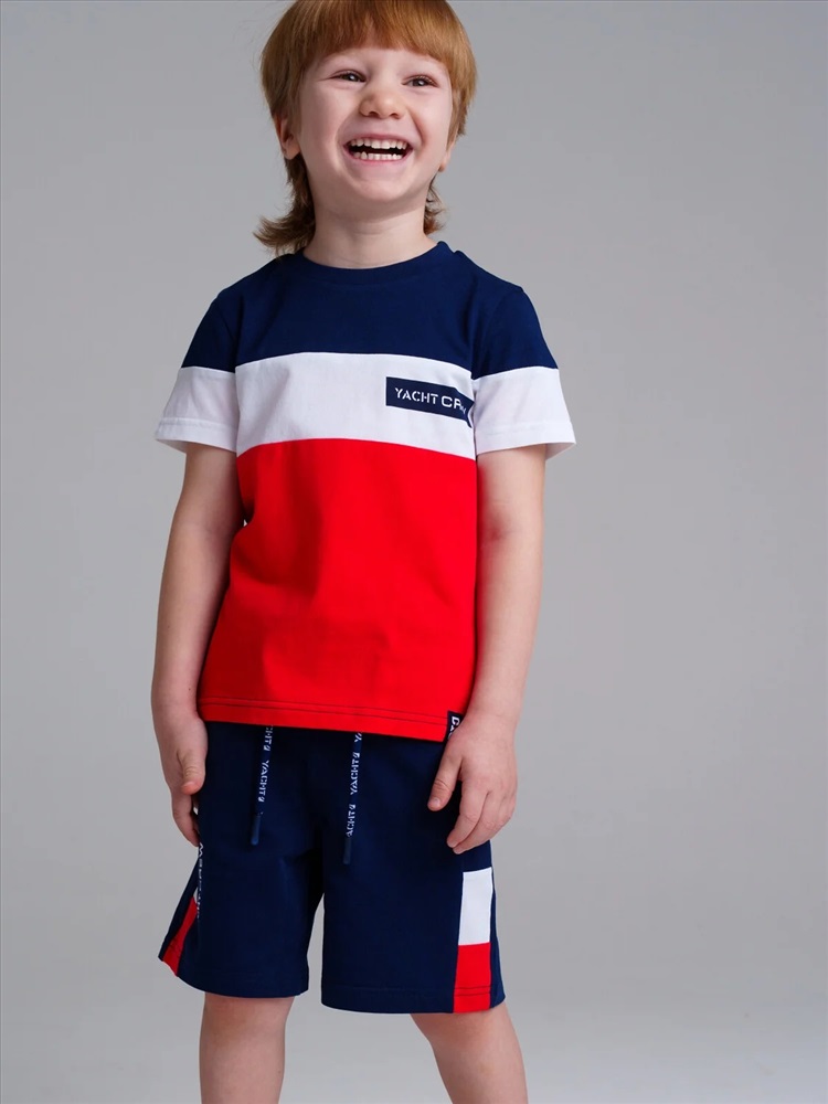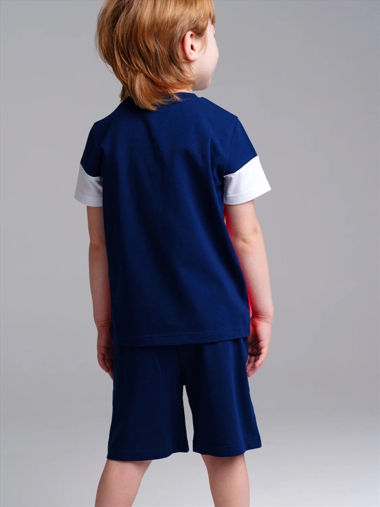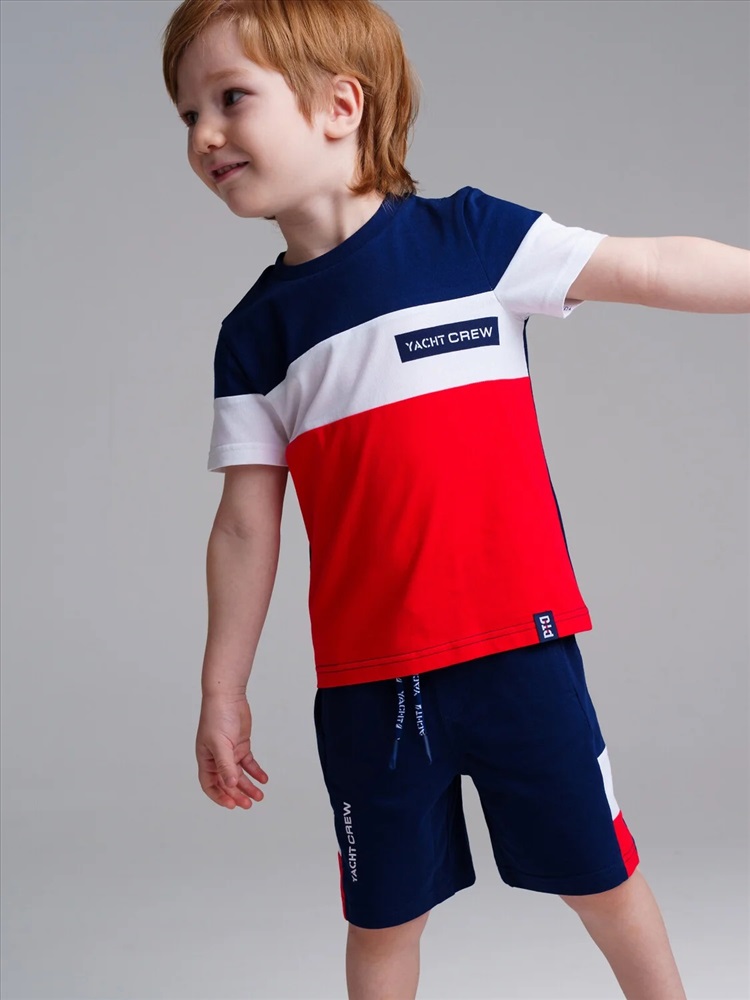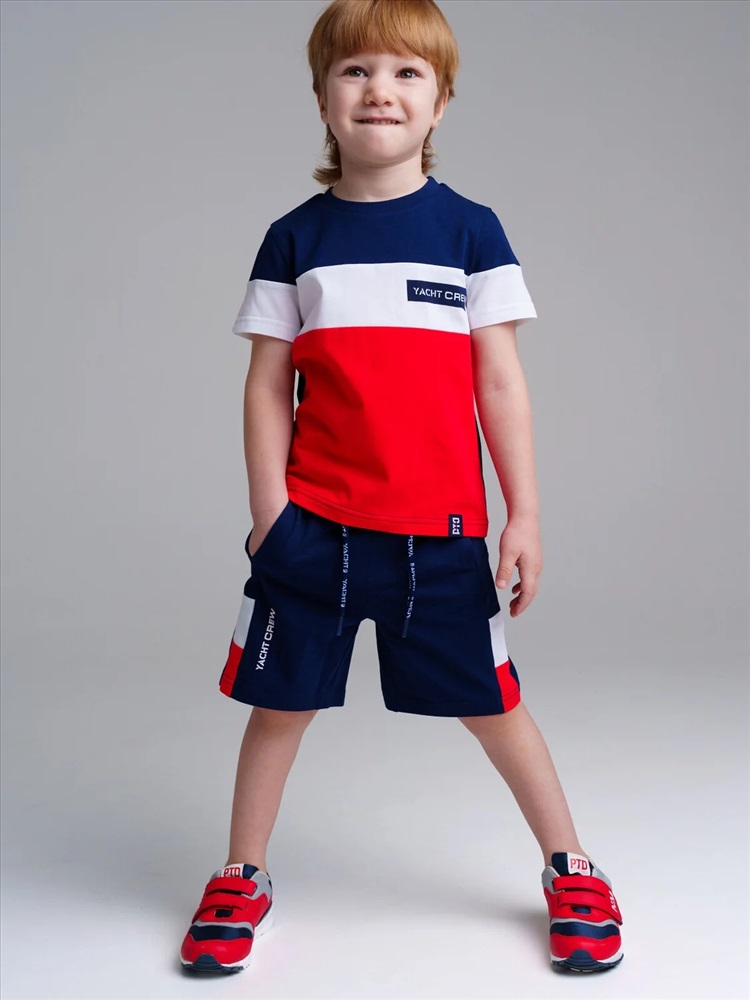 Комплект: футболка, шорты из качественного и приятного на ощупь трикотажа джерси. Высокое содержание хлопка 95%. Благодаря наличию эластана в составе ткани изделие проще в уходе и держит форму. Regular fit. Эластичный пояс со шнурком.