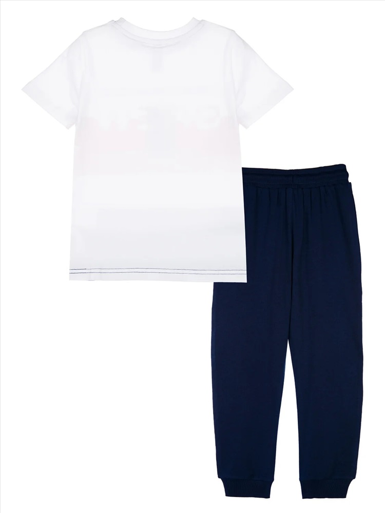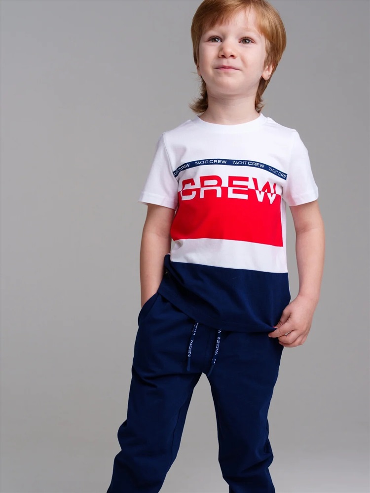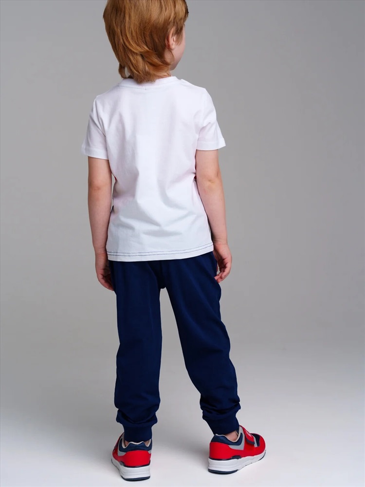 Комплект: футболка, брюки из качественного и приятного на ощупь трикотажа джерси. Высокое содержание хлопка 95%. Благодаря наличию эластана в составе ткани изделие проще в уходе и держит форму. Regular fit. Эластичный пояс со шнурком. Карманы. Манжеты брюк в эластичный рубчик.