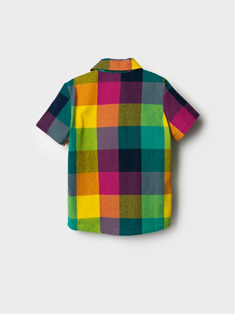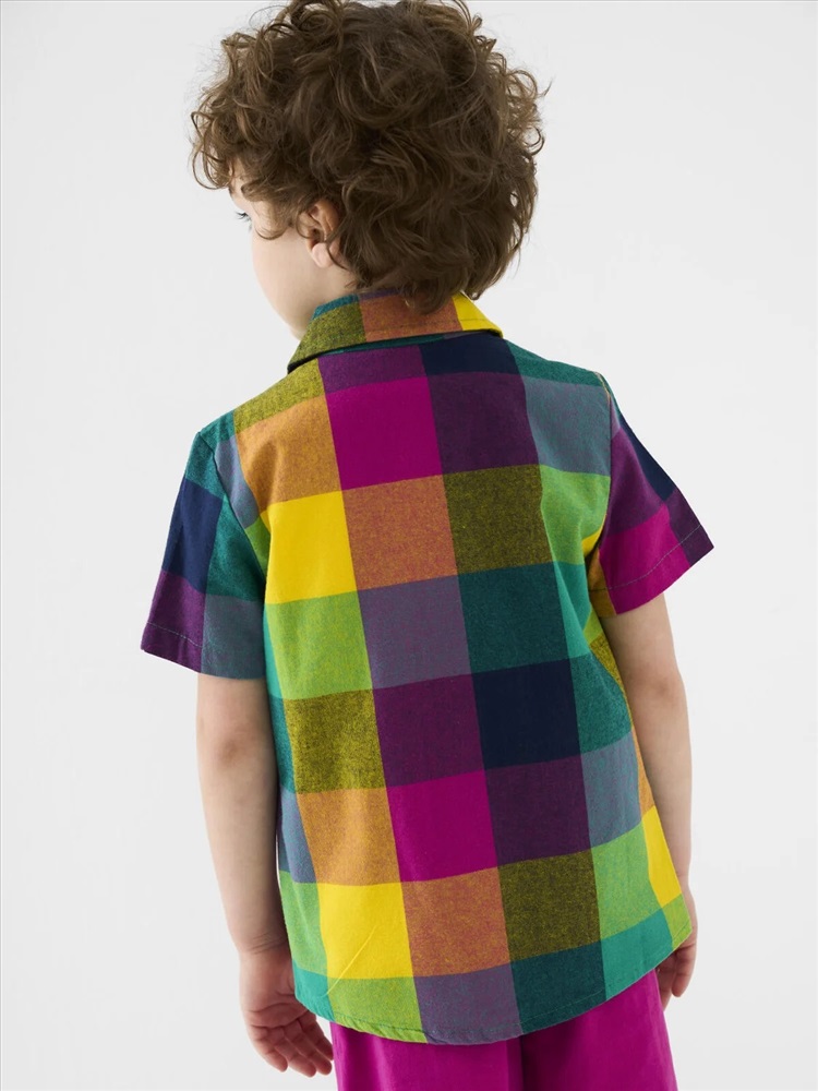 Детская рубашка в клетку для мальчика. Модель прямого кроя, с коротким рукавом. Выполнена из хлопковой ткани поплин. У изделия классический отложной воротник и удобная застежка на кнопки. На груди расположена декоративная нашивка.