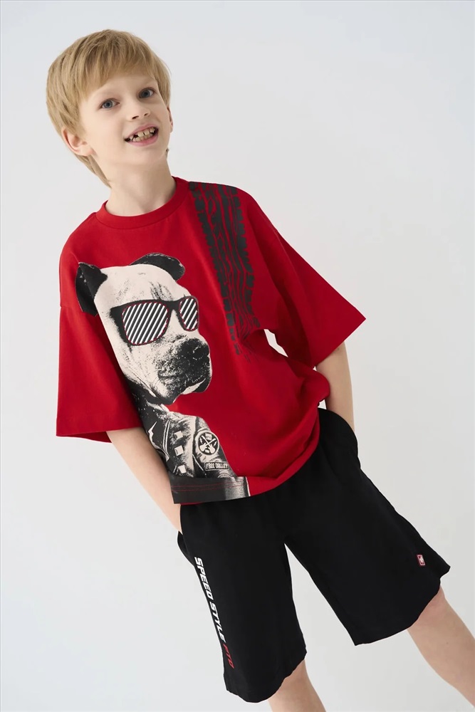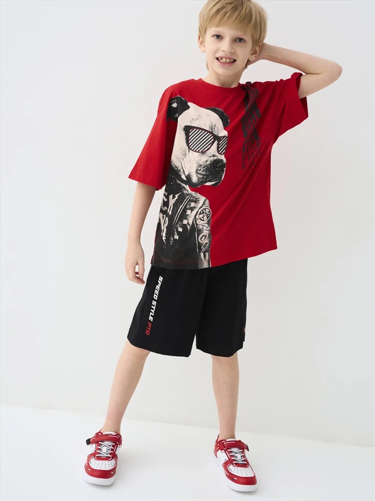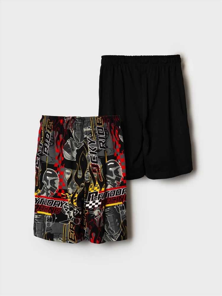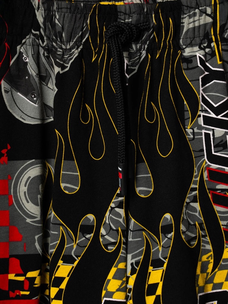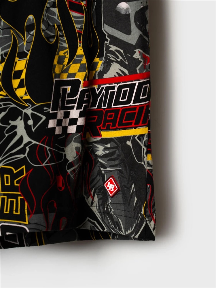 Набор спортивных шорт для мальчика подростка. Шорты выполнены из мягкого трикотажа с эффектным принтом: пламя, шлем гонщика, надписи "PLAYTODAY RACING", "SPEED STYLE PTO", и графика в стиле мотоспорта. Модель средней длины, с удобным эластичным поясом и шнурком. Есть два боковых кармана. Внизу — фирменная нашивка. Отличный выбор для активных подростков, которые любят яркий и смелый стиль.
