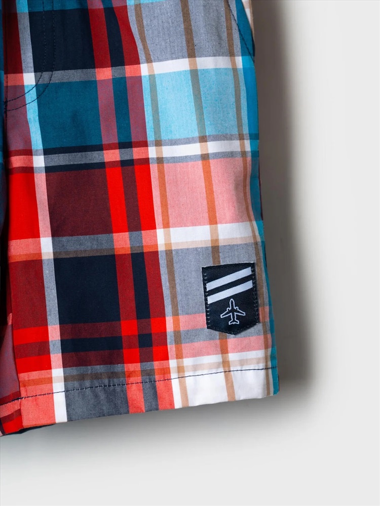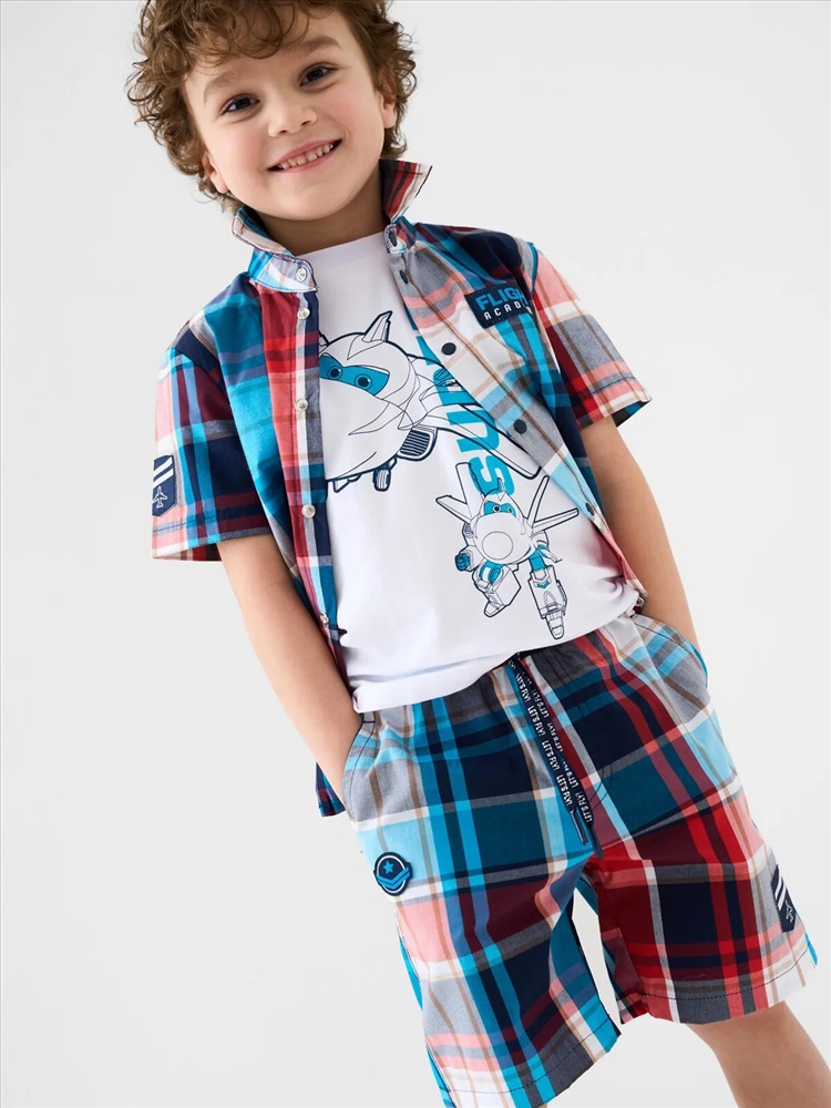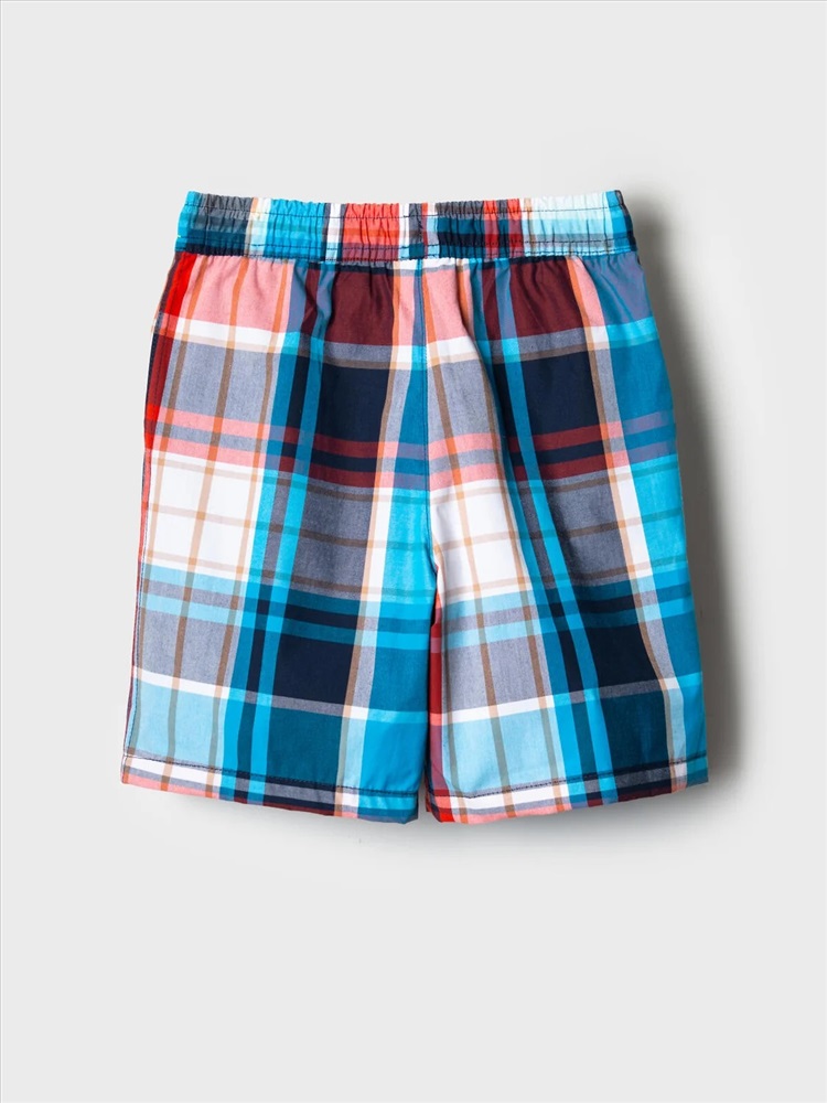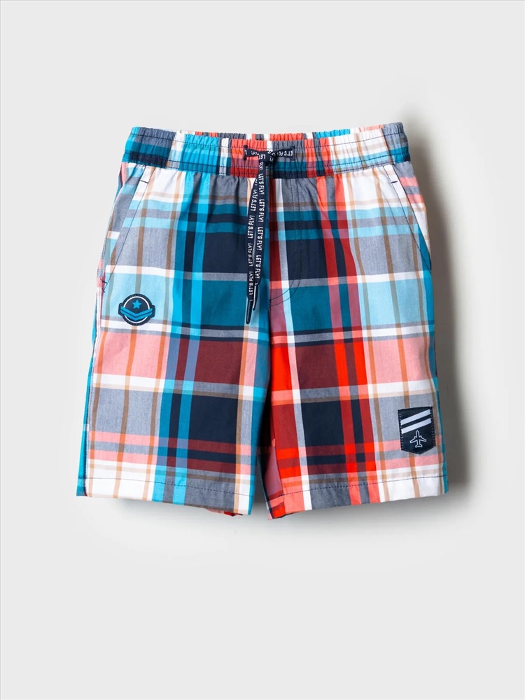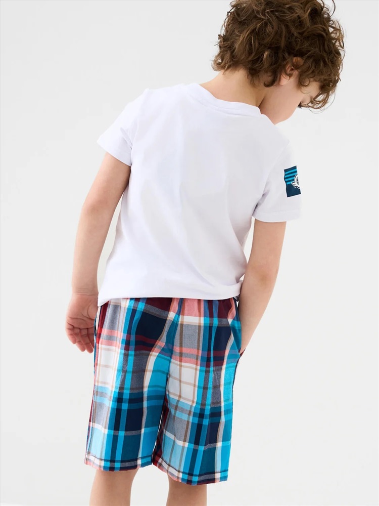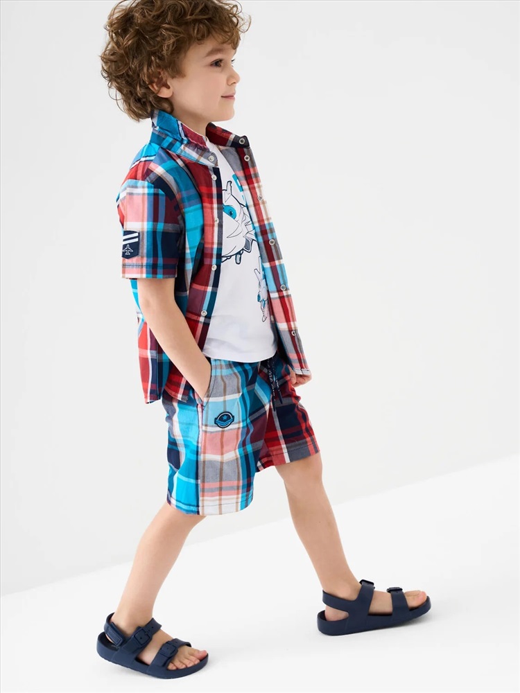 Детские шорты для мальчика. Модель прямого кроя из дышащего, хлопкового поплина. Удобная посадка обеспечивается эластичным поясом со шнуром. Спереди — боковые карманы и декоративные нашивки.