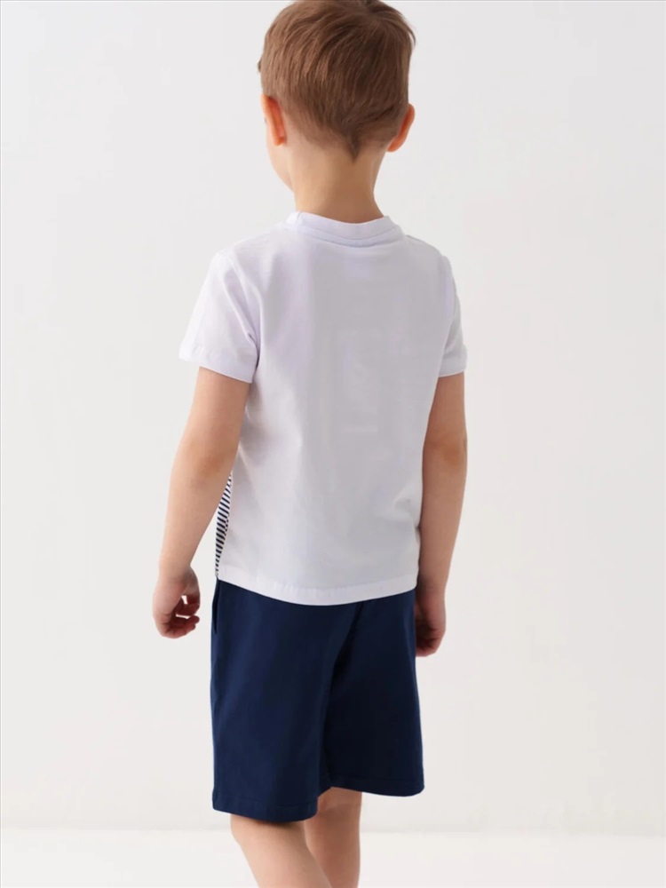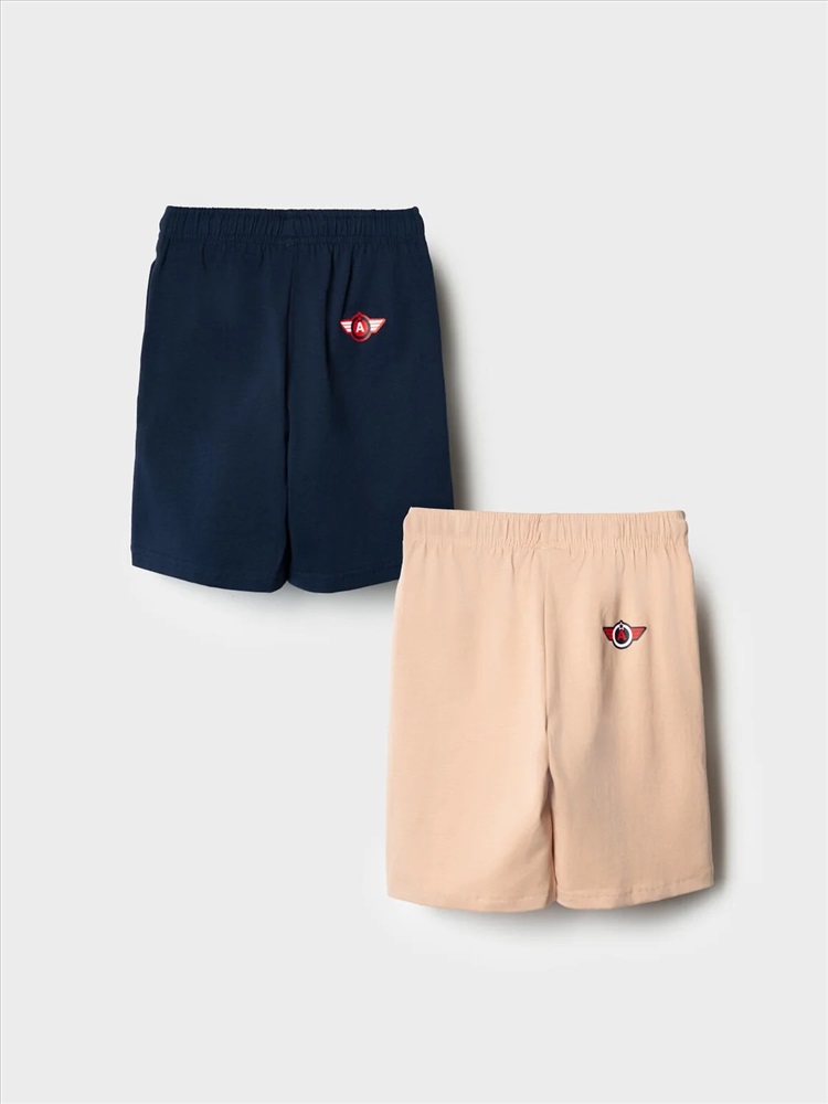 Набор детских шорт для мальчика. В комплект входят две пары шорт свободного кроя, ниже колена. Модели из мягкого, хлопкового трикотажа джерси. Удобная посадка обеспечивается эластичным поясом со шнуром. По бокам расположены два кармана.