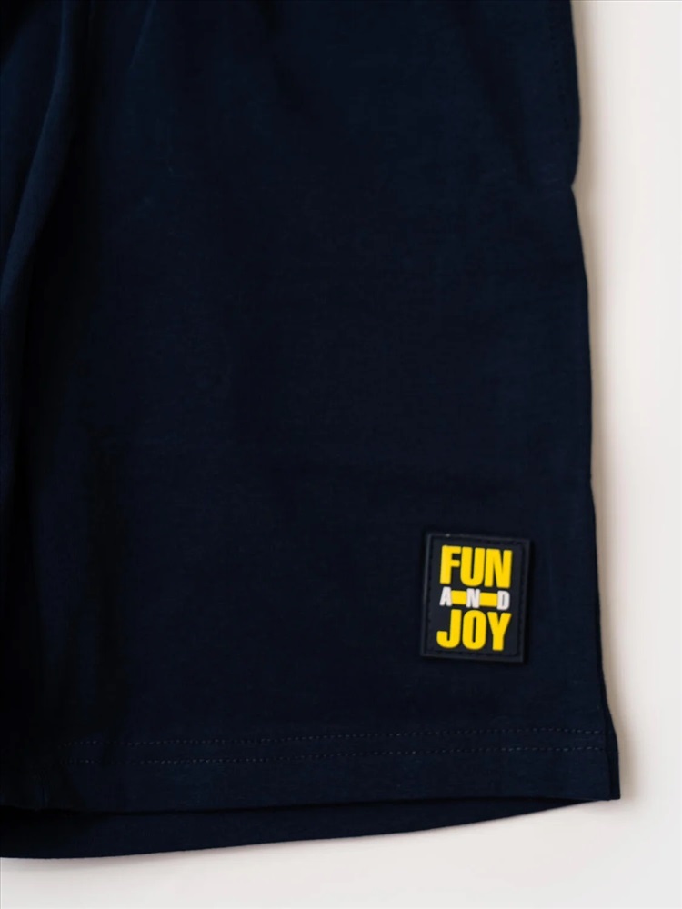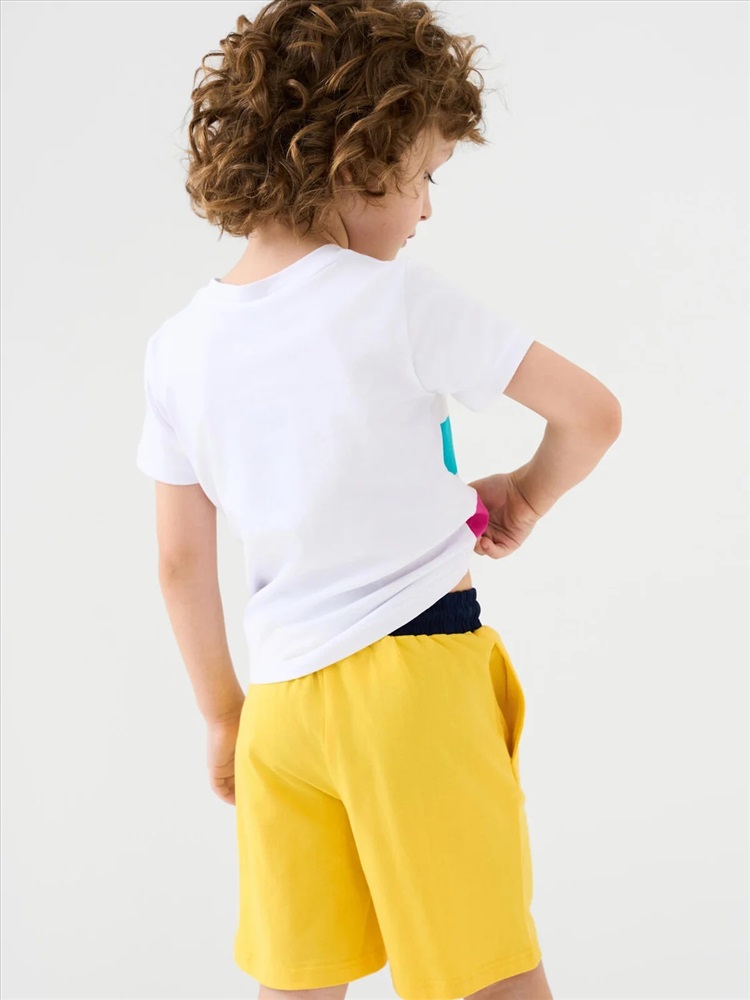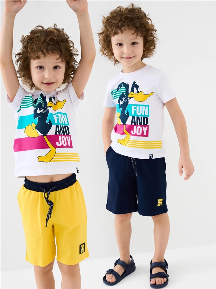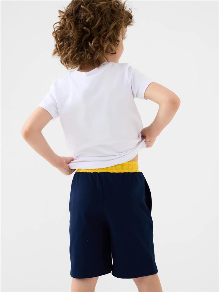 Набор детских шорт для мальчика. В комплект входят две пары шорт свободного кроя. Модели из мягкого, хлопкового трикотажа джерси. Удобная посадка обеспечивается эластичным поясом со шнуром. По бокам расположены два кармана.