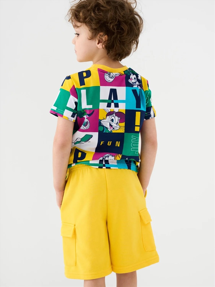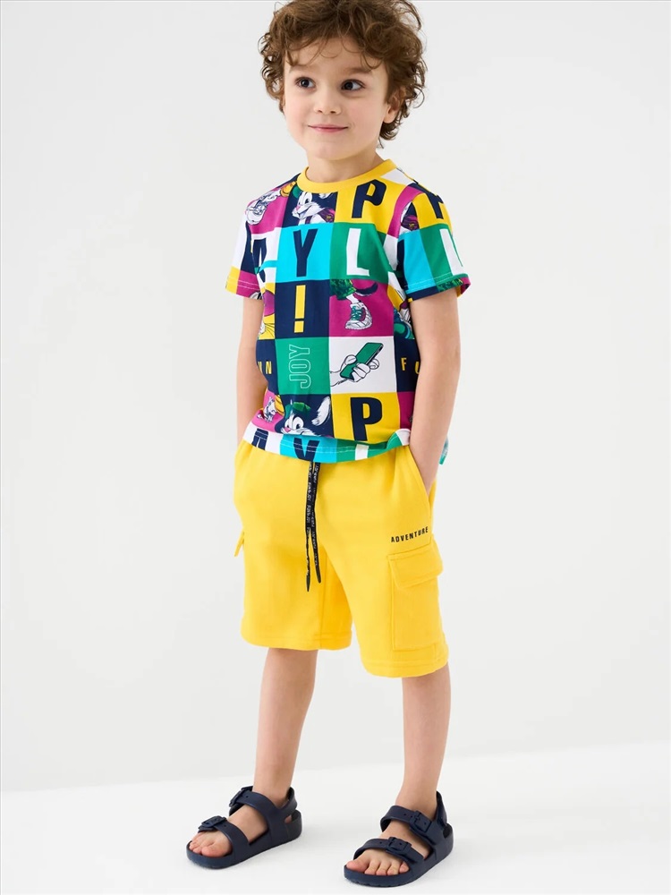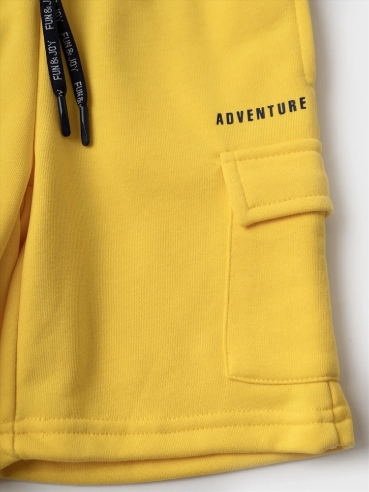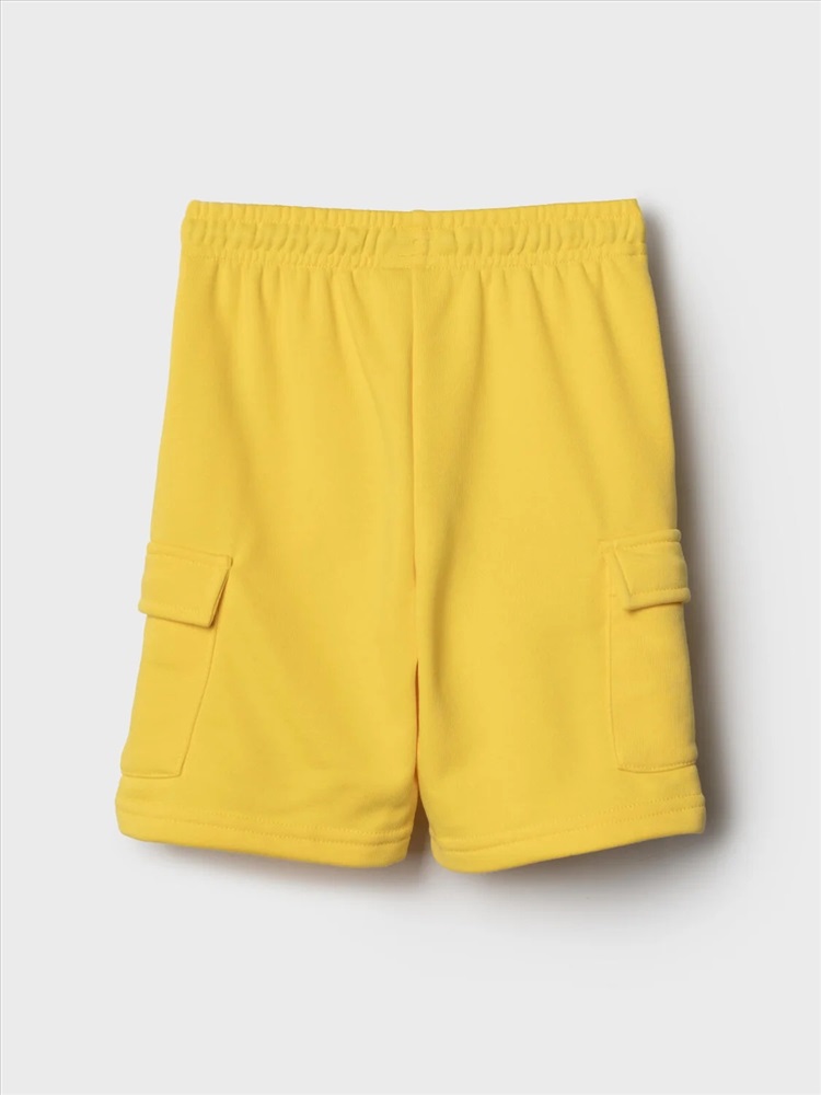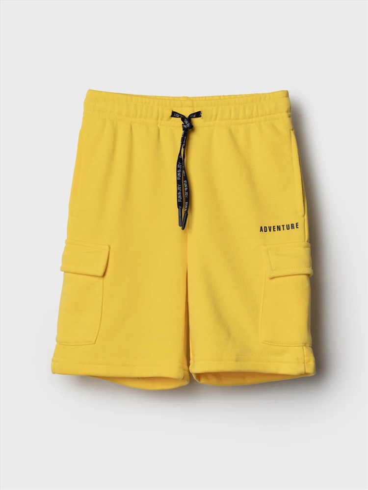 Шорты детские для мальчика. Модель свободного кроя из мягкого, хлопкового трикотажа футер. Удобная посадка обеспечивается эластичным поясом со шнуром. Спереди — боковые карманы и накладные карманы-карго.