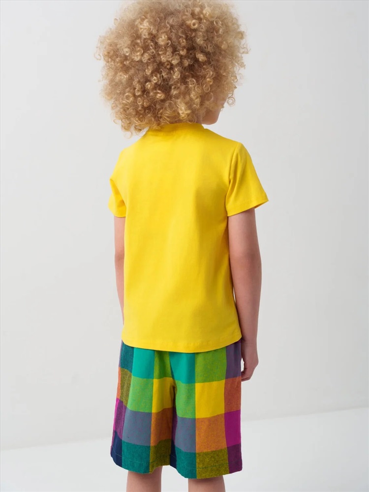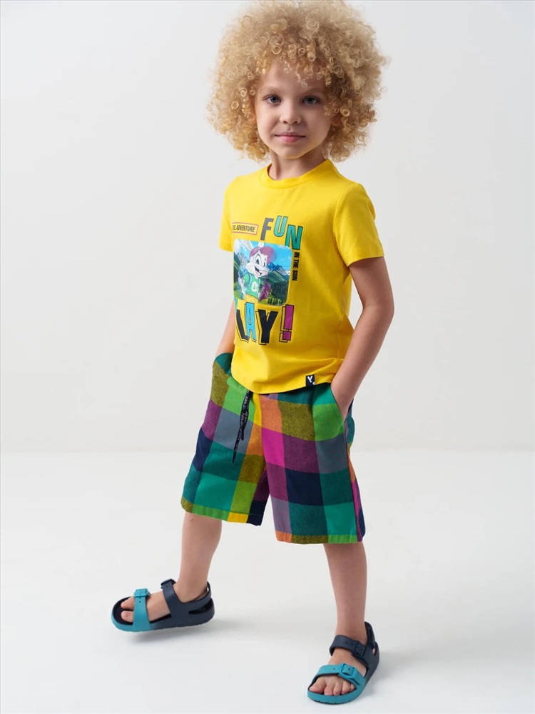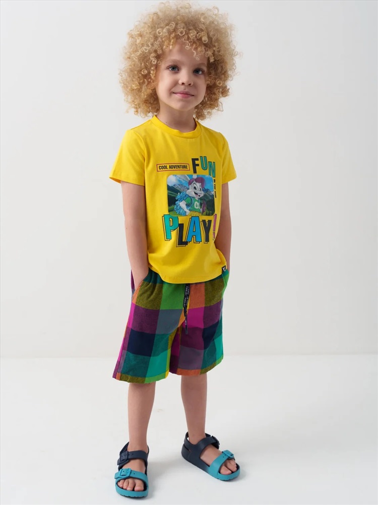 Детские шорты для мальчика. Модель прямого кроя из дышащего, хлопкового поплина. Удобная посадка обеспечивается эластичным поясом со шнуром. Спереди — боковые карманы.