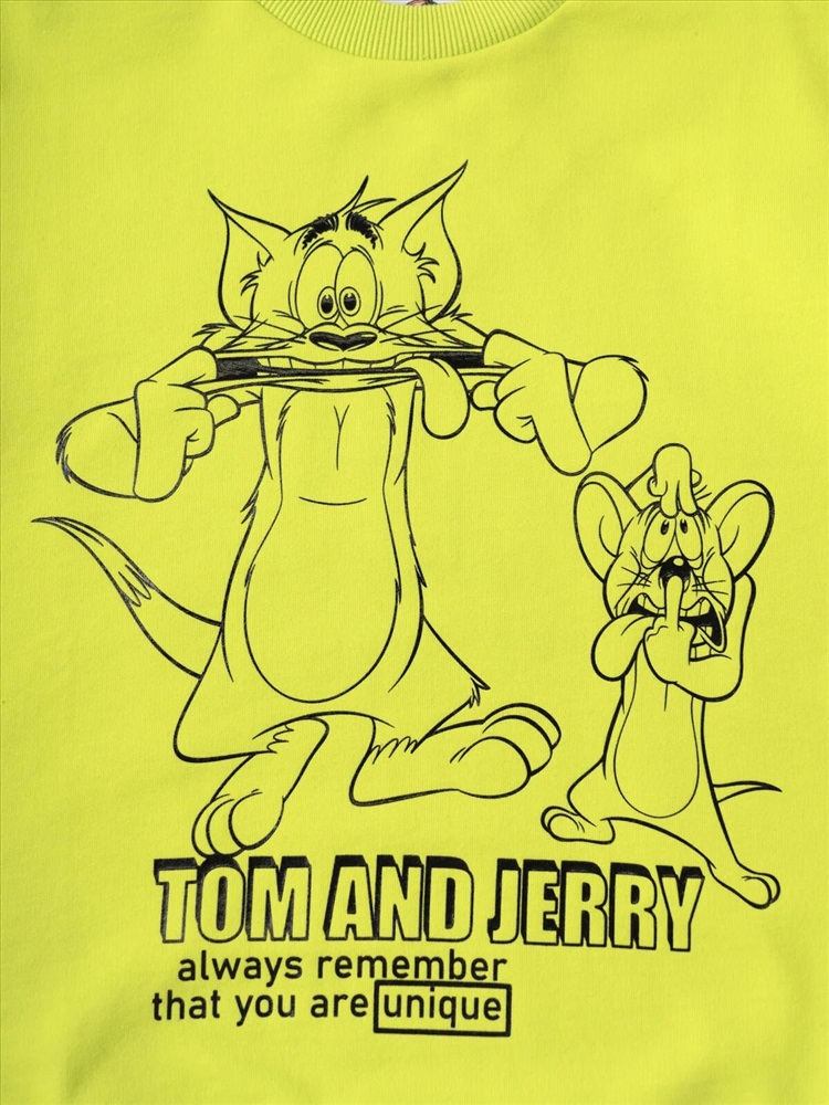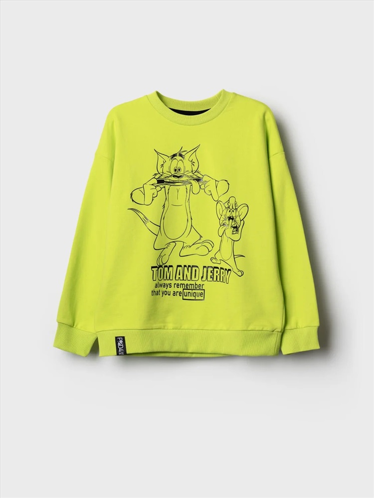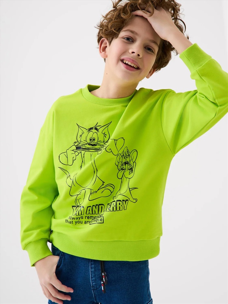 Оверсайз свитшот Том и Джерри для мальчика подростка. Модель с круглым вырезом, длинными рукавами и манжетами. Выполнена из футера без начеса. Пояс и манжеты выполнены из эластичного риба, что обеспечивает хорошую посадку. Яркий принт с любимыми героями мультфильма "Tom and Jerry".