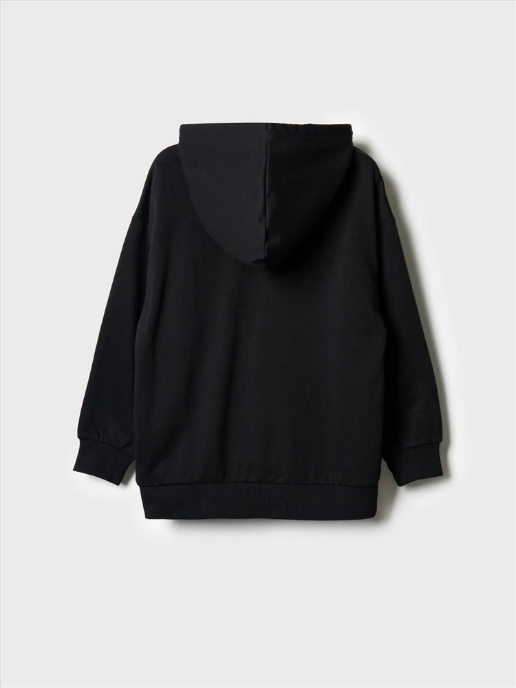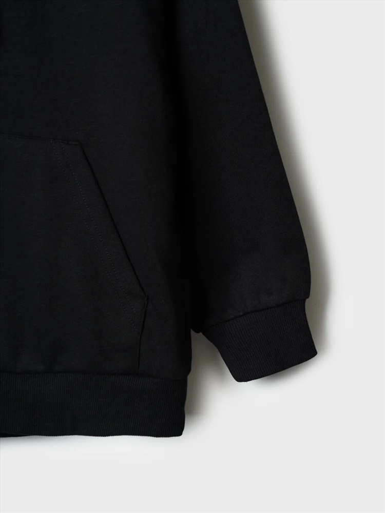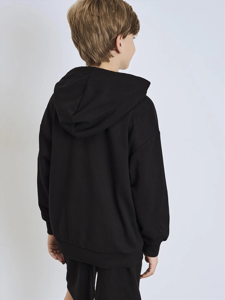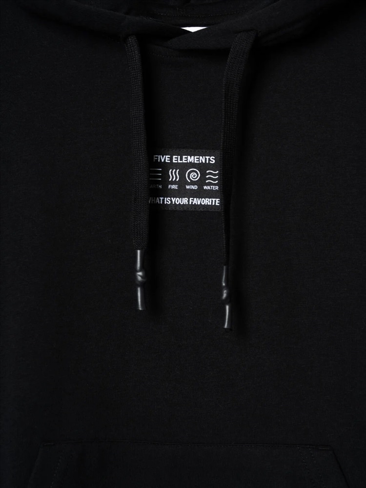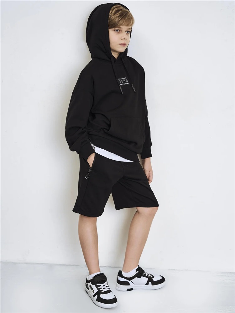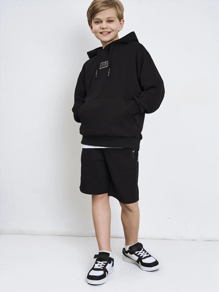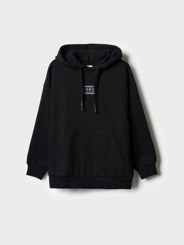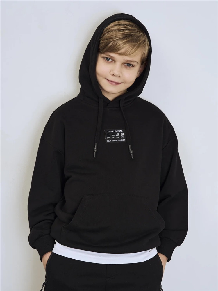 Чёрное худи оверсайз для мальчика подростка. Модель свободного кроя, с длинными рукавами и удобным карманом-кенгуру спереди. Капюшон оснащён шнурком для регулировки. По низу изделия и на рукавах — мягкие трикотажные манжеты. На груди — декоративная нашивка с надписью. Толстовка выполнена из приятного на ощупь хлопкового футера без начеса.