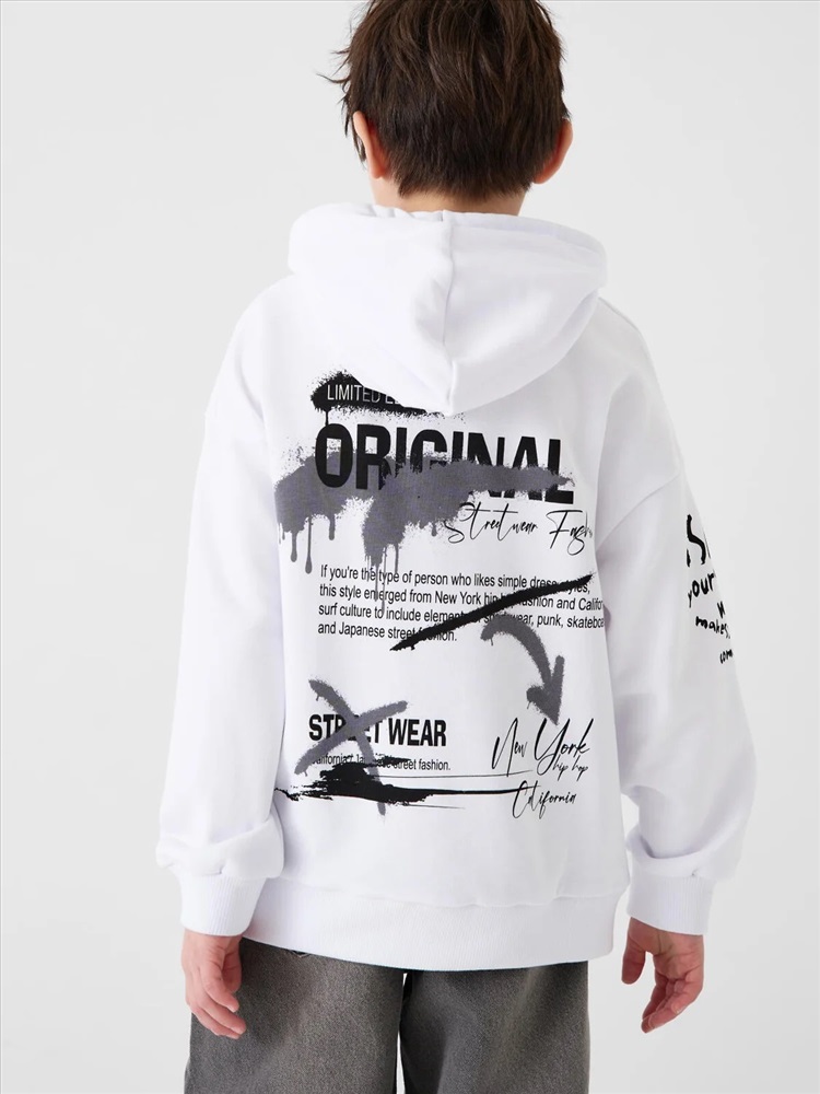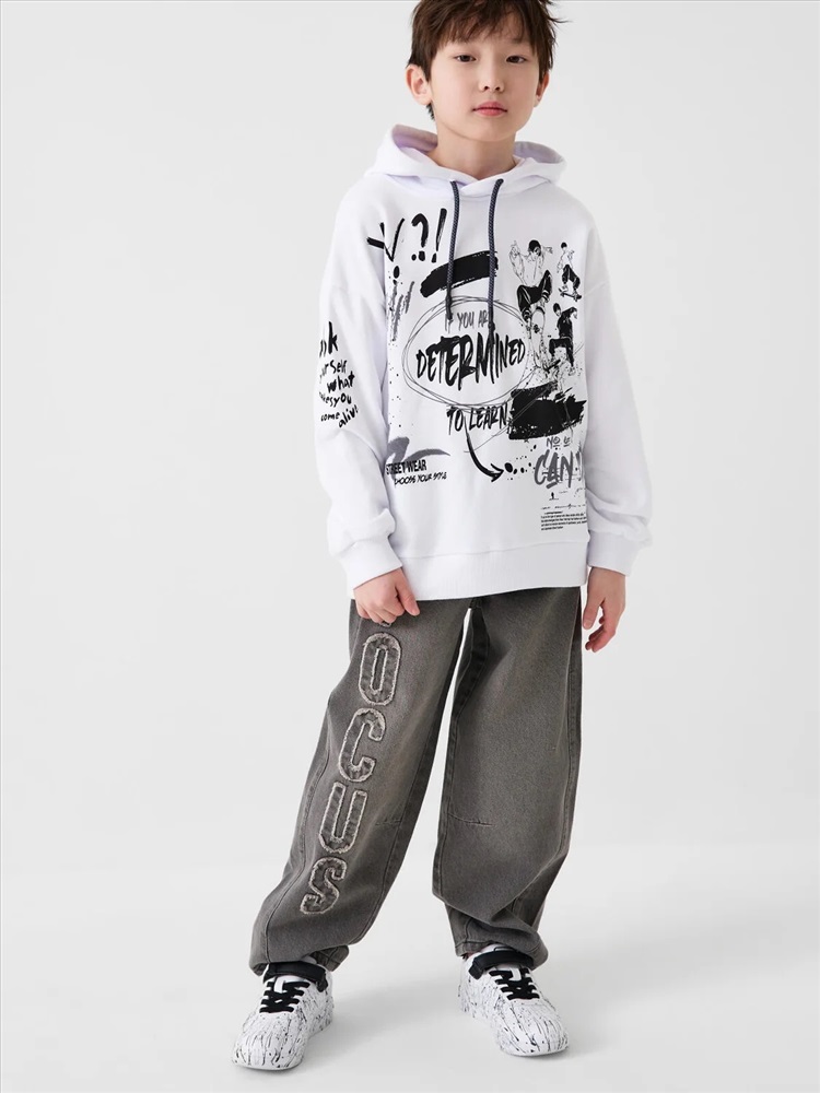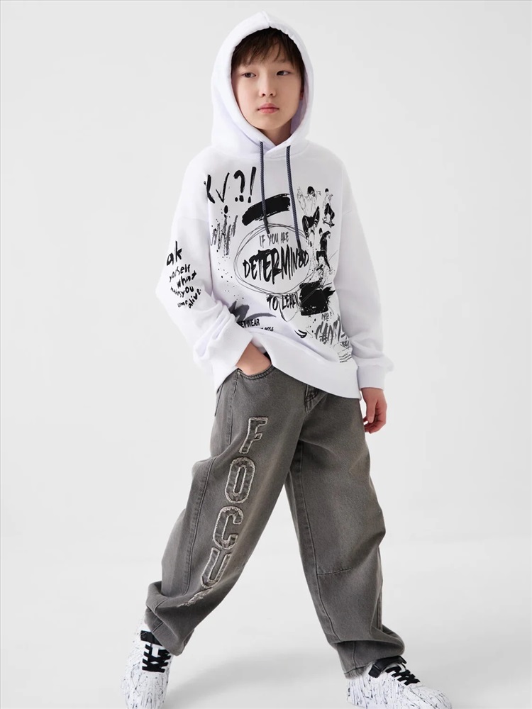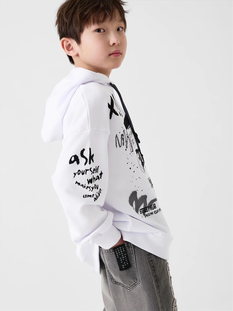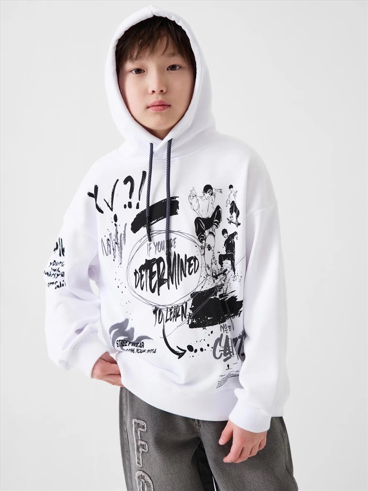 Худи оверсайз для мальчика подростка. Модель выполнена из мягкого, хлопкового футера без начеса. Длинные рукава на манжетах и широкий эластичный пояс по низу. Капюшон с подкладкой и шнурком для регулировки. На передней части размещён яркий принт с графикой и текстами в стиле уличного искусства. На спине — дизайнерский принт.