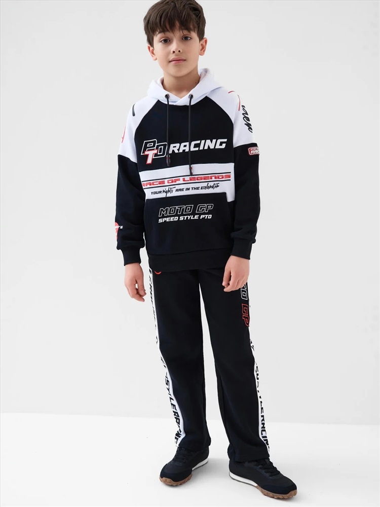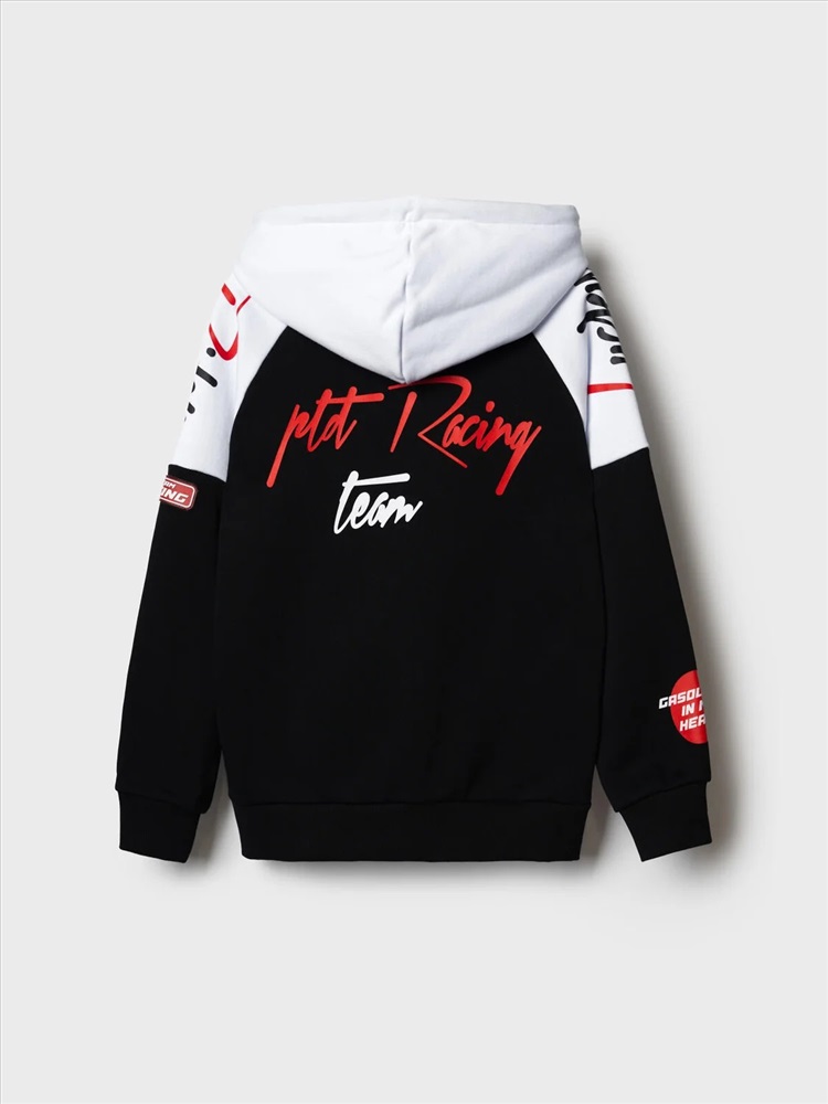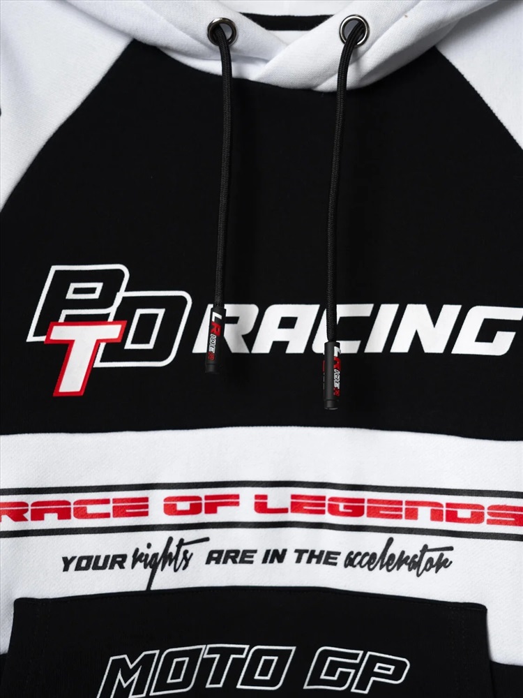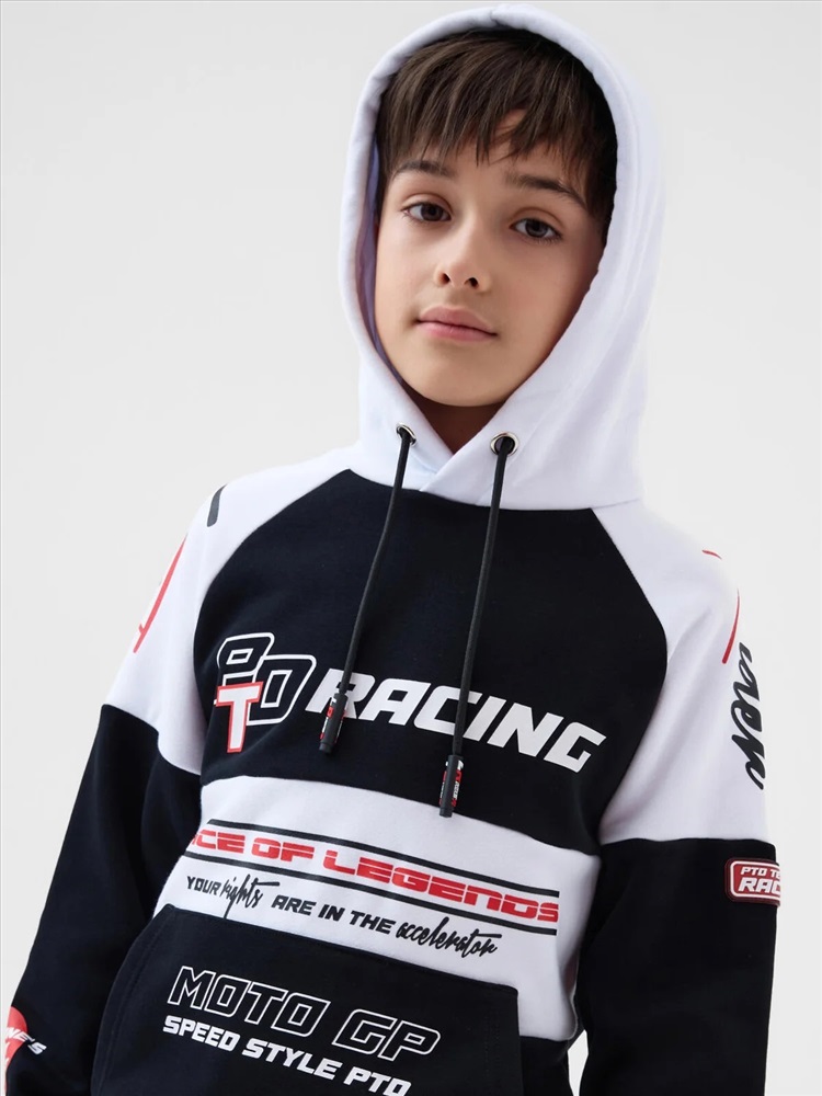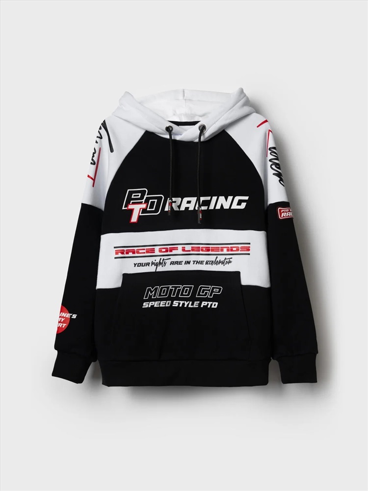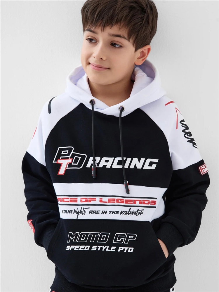Худи оверсайз для мальчика подростка. Выполнено из хлопкового футера без начеса. На груди — крупный логотип и надписи, вдохновлённые мотоспортом. Капюшон регулируется шнурком, а на передней части расположен удобный карман-кенгуру. Манжеты и низ изделия выполнены из эластичного риба, что обеспечивает комфортную посадку. На правом рукаве — яркий силиконовый ярлык.