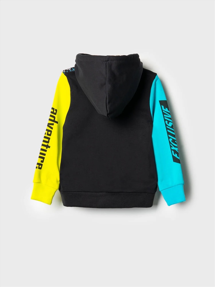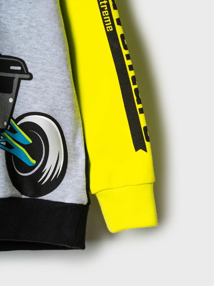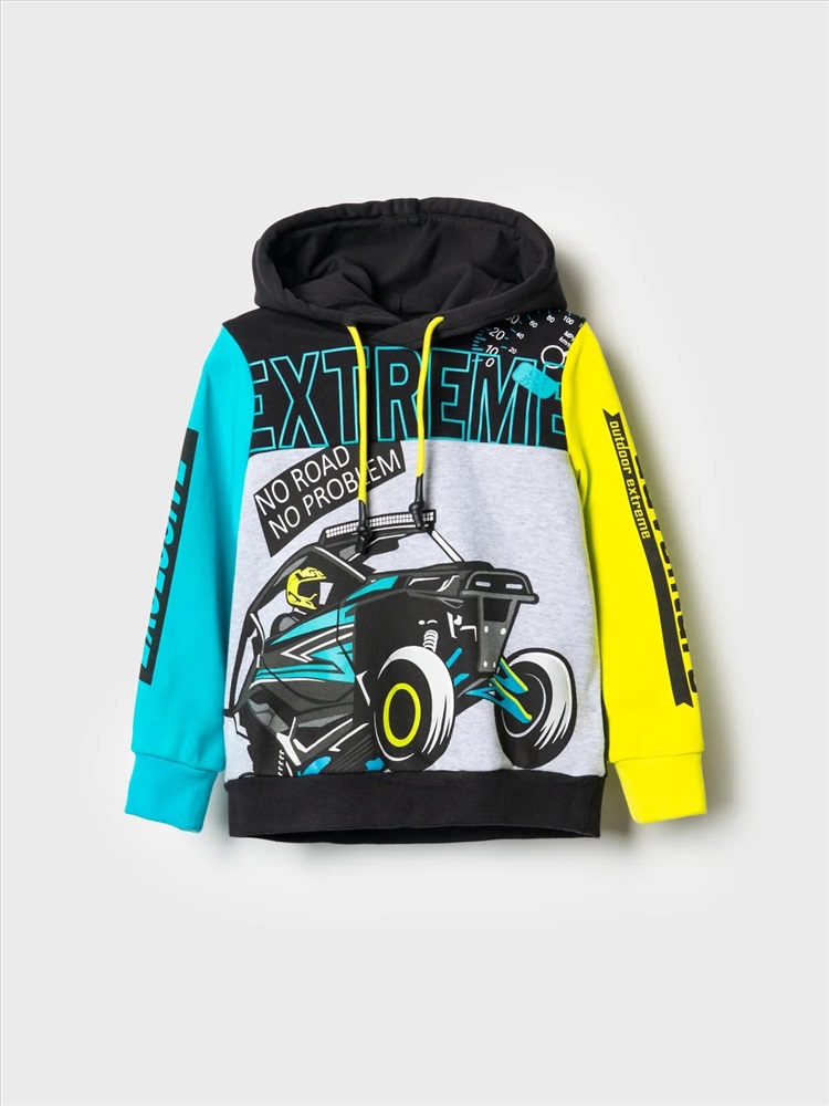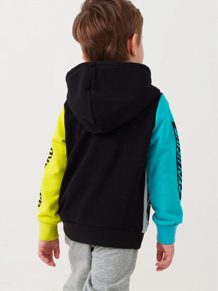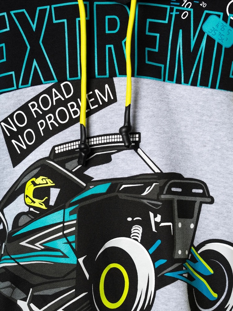 Детское худи для мальчика. Модель прямого кроя. Выполнено из хлопкового футера без начеса. На груди и рукавах — крупный красочный принт, вдохновлённый мотоспортом. Капюшон регулируется шнурком. Манжеты и низ изделия выполнены из эластичного риба, что обеспечивает комфортную посадку.