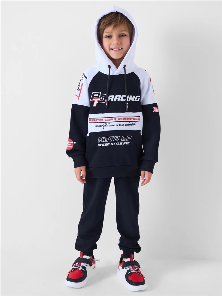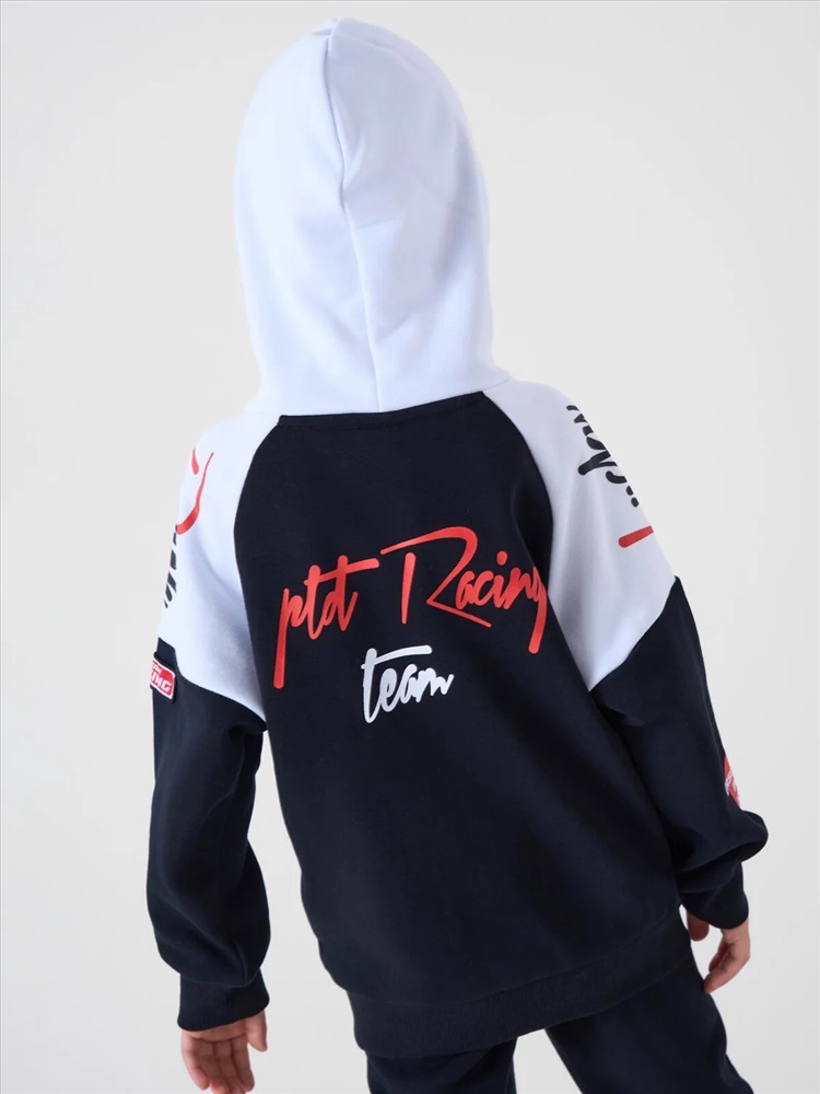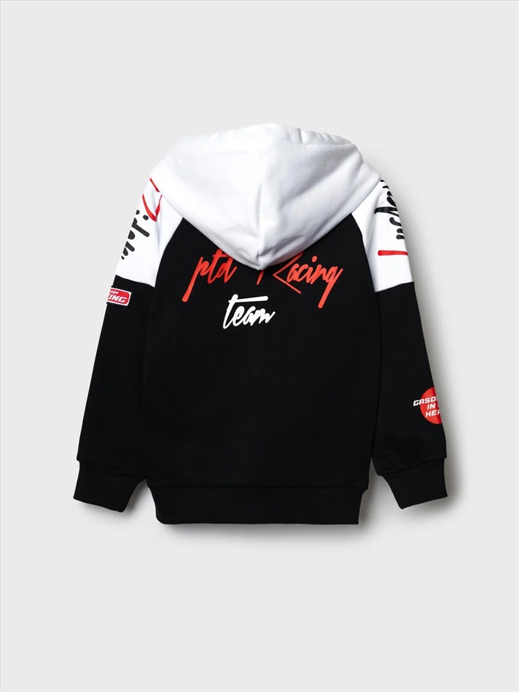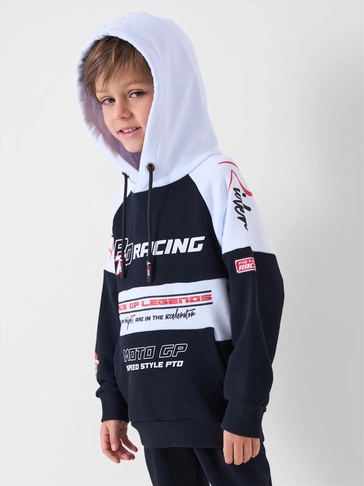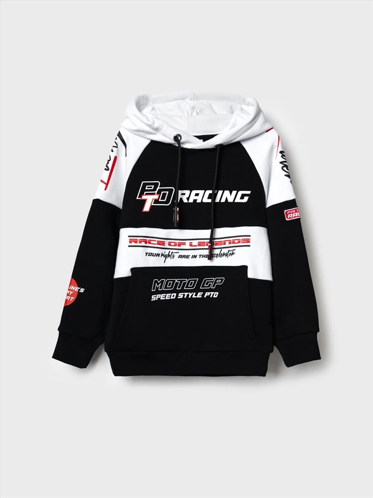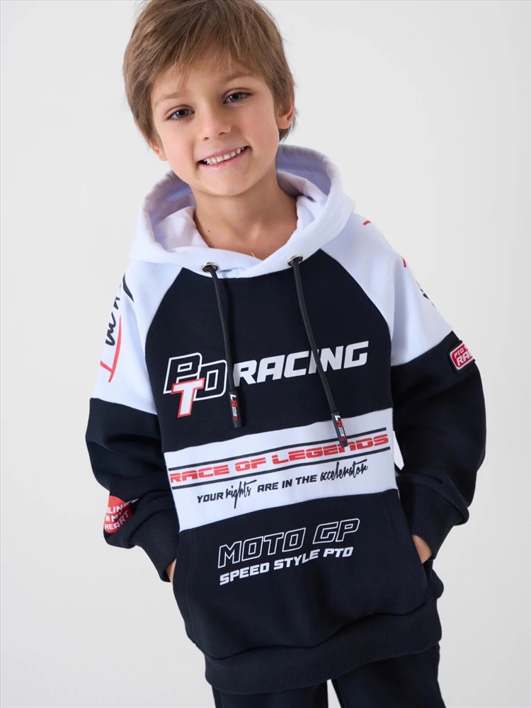Худи детское оверсайз для мальчика. Выполнено из хлопкового футера без начеса. На груди и рукавах — крупный логотип и надписи, вдохновлённые мотоспортом. Капюшон регулируется шнурком, а на передней части расположен удобный карман-кенгуру. Манжеты и низ изделия выполнены из эластичного риба, что обеспечивает комфортную посадку. На правом рукаве — яркий силиконовый ярлык.