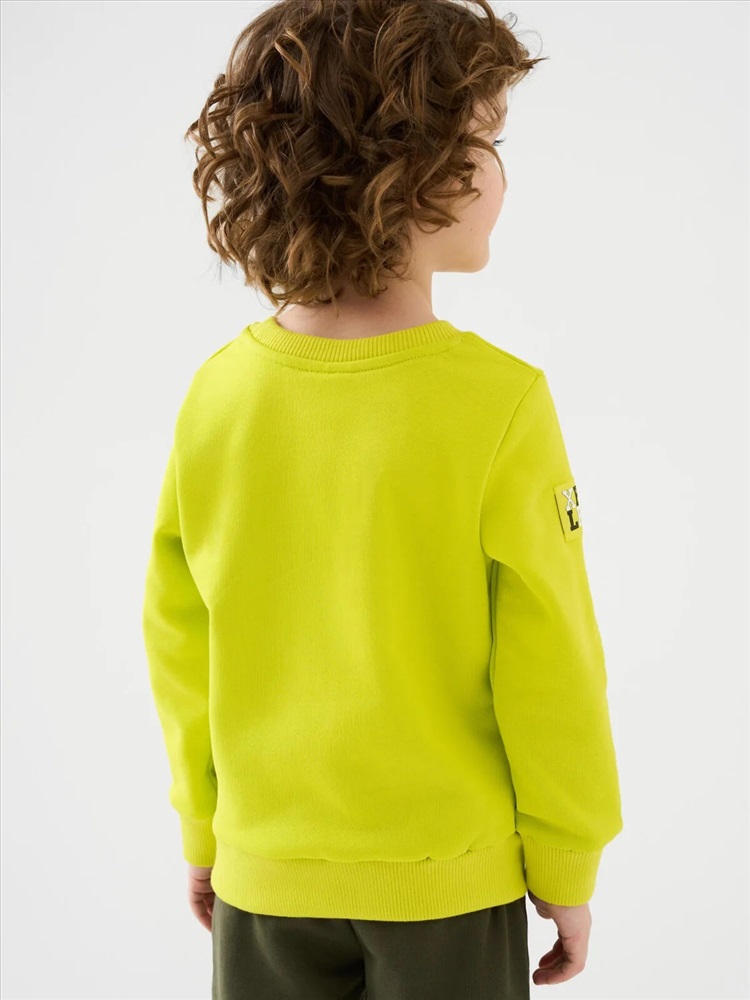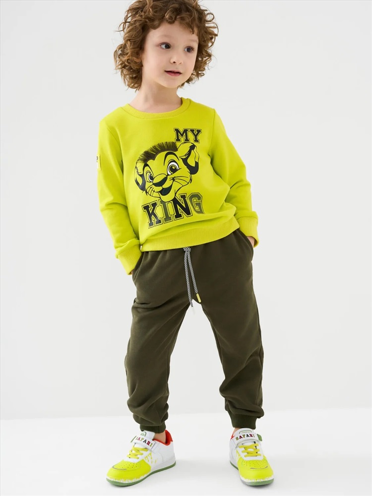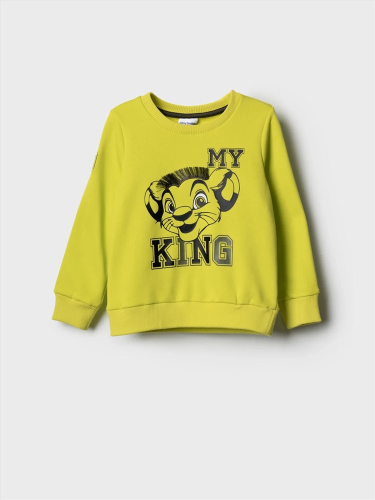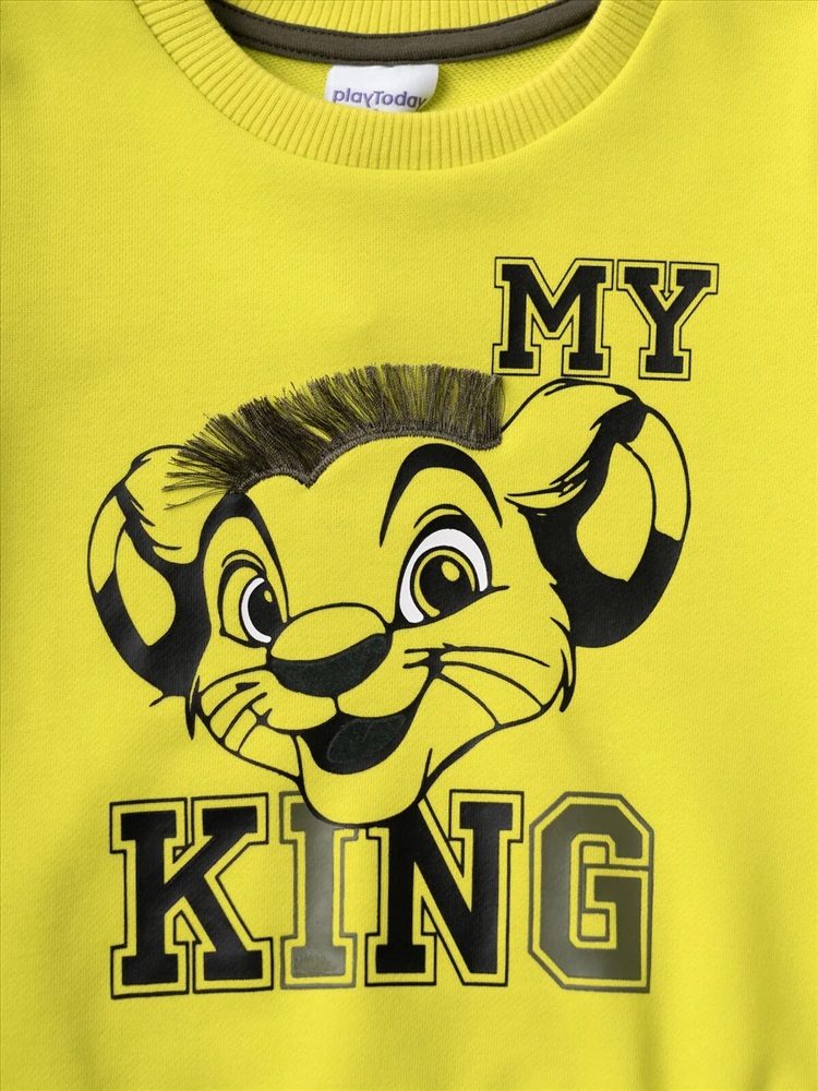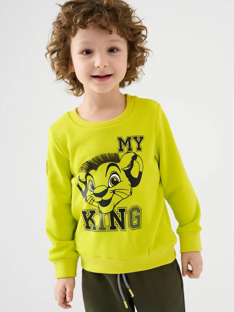 Свитшот детский для мальчика. Выполнен из хлопкового футера без начеса. Прямой крой. На груди — принт с героем из любимого мультфильма "Король Лев". На рукаве - объемная силиконовая нашивка. Манжеты и низ изделия выполнены из эластичного риба, что обеспечивает комфортную посадку.