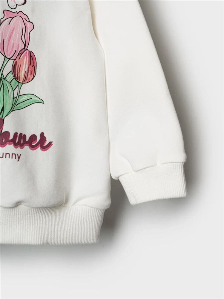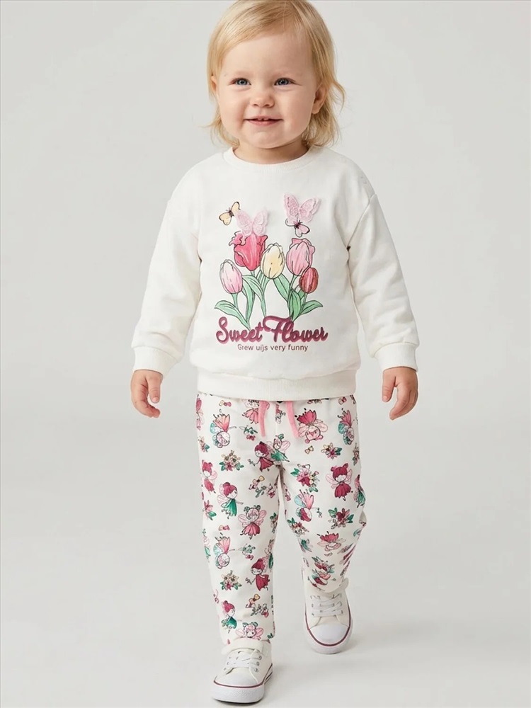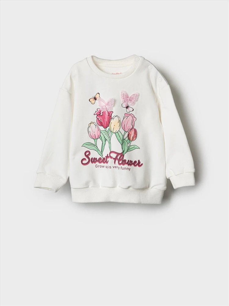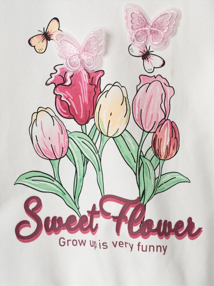 Детский свитшот для девочки. Выполнен из хлопкового футера без начеса. На передней части — нежный принт с тюльпанами и бабочками. На плече застежка на кнопки для удобного переодевания. Низ изделия и рукава оформлены эластичными резинками.
