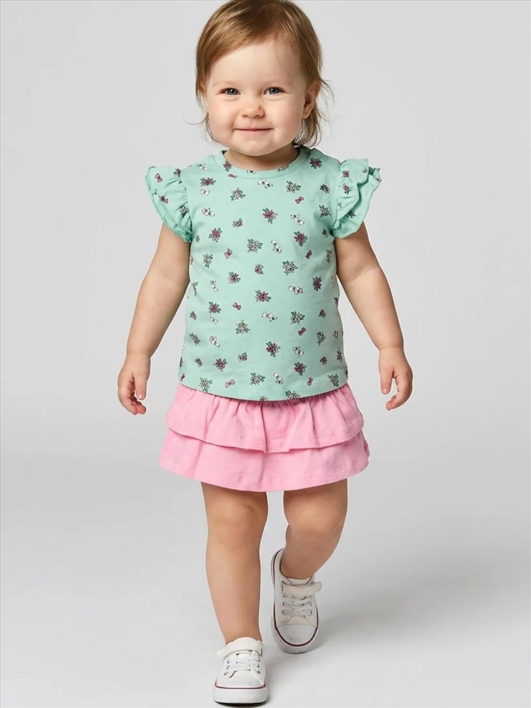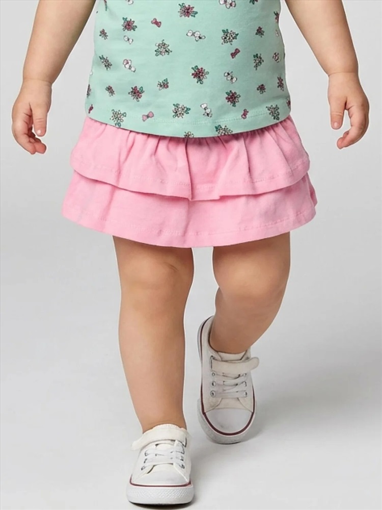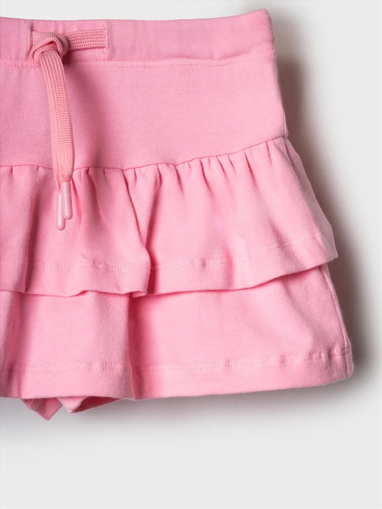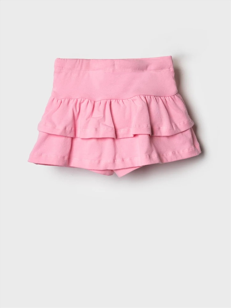 Детская юбка-шорты для девочки. Выполнены из хлопкового трикотажного джерси. Внешне изделие напоминает юбку за счёт трёхслойных оборок, пришитых по низу. Шортики оснащены удобным эластичным поясом со шнурком для регулировки посадки.