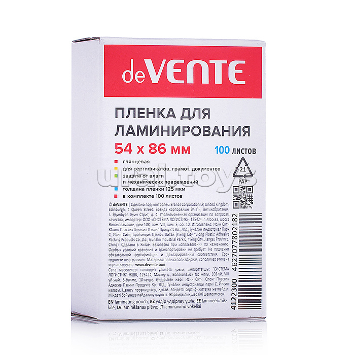 Количество в коробке: 40 Пленка для ламинирования 54x86 мм, толщина 125 мкм, 100 л