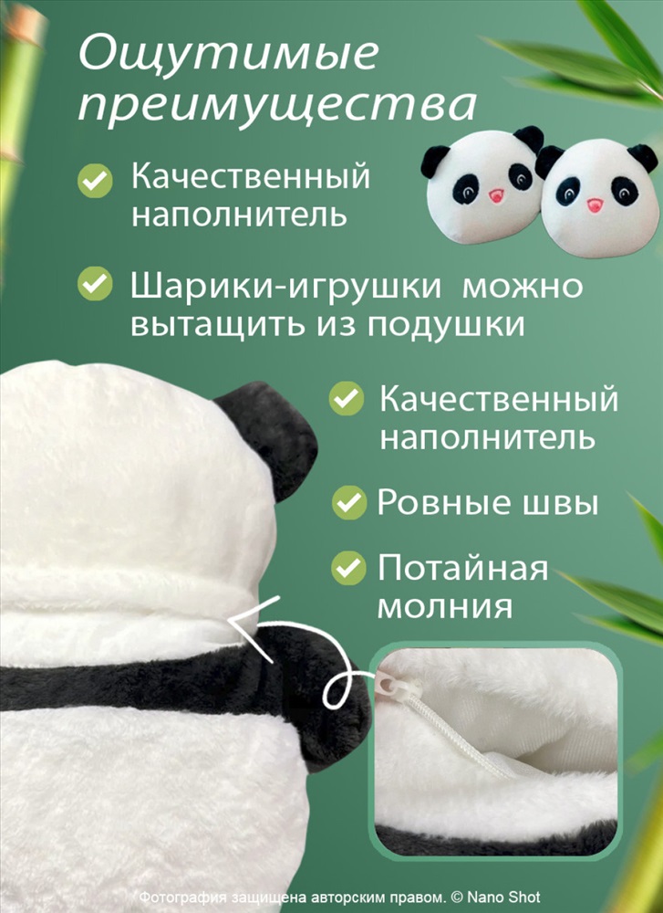 Страна: Китай Плюшевая мягкая игрушка в виде панды — это идеальное сочетание декоративных элементов и функциональности. Эта игрушка станет отличным дополнением к коллекции мягких игрушек, а также послужит в качестве подушки для комфортного отдыха. Изготовленная из высококачественного мягкого материала, она обеспечивает максимальный комфорт и приятные тактильные ощущения. Игрушка панда выполнена в забавном дизайне, который понравится как мальчикам, так и девочкам. Благодаря своей универсальности, она может стать отличным подарком для детей и взрослых. Плюшевые игрушки, такие как эта игрушка в виде мишки панды, популярны среди маленьких и больших любителей мягких игрушек. Они не только украшают интерьер, но и служат отличным средством для снятия стресса и расслабления. Эта мягкая игрушка пандочка может использоваться как подушка, что делает её функциональной и практичной. Внутри подушки находится мягкий наполнитель, который позволяет ей сохранять форму и обеспечивать комфорт при использовании. Большая подушка панда станет отличным решением для обнимашек и отдыха. Декоративные элементы на игрушке придают ей милый и привлекательный вид. Маленькие детали, выполненные с высокой точностью, делают эту игрушку одной из самых популярных среди аналогичных товаров. Это идеальный подарок для девочек и мальчиков в возрасте от 3 до 11 лет, который принесет только положительные эмоции. Эта плюшевая панда — это не просто подушка, а настоящий элемент уюта и комфорта в вашем доме. Она станет отличным подарком для любого случая, будь то день рождения или просто желание порадовать близкого человека. Вытянуть удовольствие от использования этой игрушки можно в любое время, наслаждаясь её мягкостью и уютом. Комментарии к товару