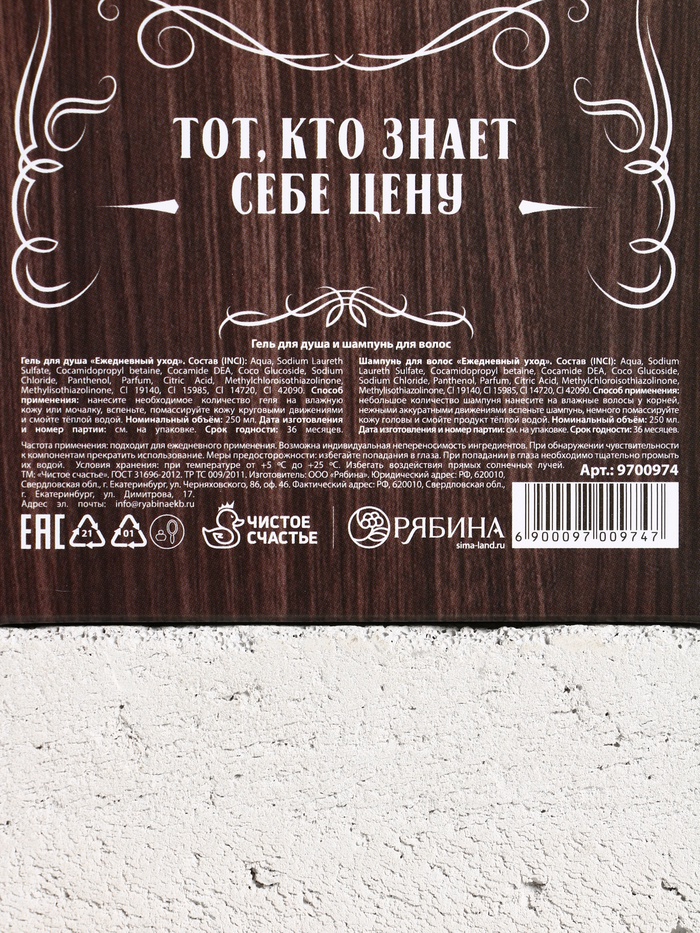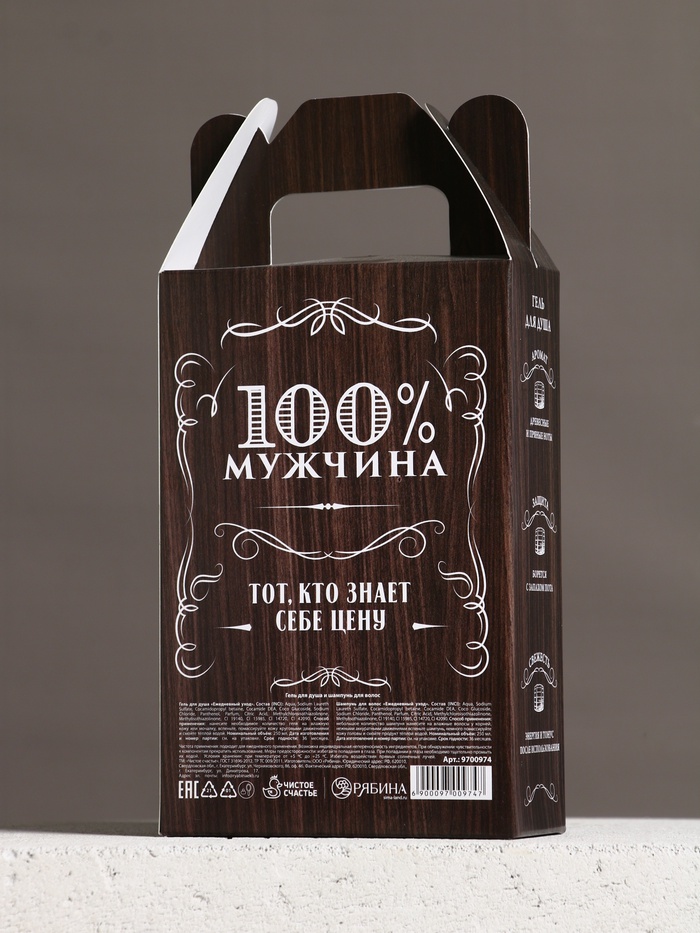 Габариты: 6 x 11 x 22 Страна: Россия В боксе: 25 набор Состав: См. на упаковке Материалы: см. на упаковке Фасовка: по 1 набор Индивидуальная упаковка: Термоусадочная пленка Сертификат: ЕАС Набор: Да Цвет: Чёрный Для кого: Для мужчины В наборе, шт.: 2 В упаковке, шт.: 2 Объём, мл: 250 Вид упаковки: Подарочная коробка Символ года: Нет Тематика праздника: Универсальная тематика Адресат: Без адресата Возраст: Взрослый Материал: Пластик Область применения: Для головы, Для тела Аромат: Древесный с пряными нотами Составляющие набора: Шампунь, Гель для душа Темпер. ограничение НЕ НИЖЕ ℃: +5 Темпер. ограничение НЕ ВЫШЕ ℃: +25 Возраст: Для взрослых Тип волос: Для всех типов Эффект: Очищение Вид шампуня: Жидкий Назначение: Очищение, детокс Форма выпуска: Формовые, Флакон без дозатора Комментарии к товару
